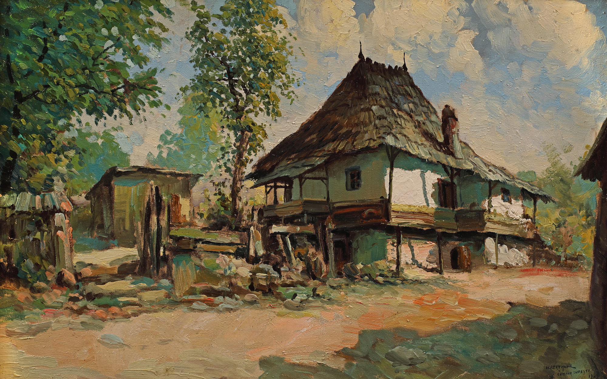 semnat, datat și localizat, dreapta jos, cu albastru, ”N. PERȚACHE, COMUNA TUFEȘTI, 1929”