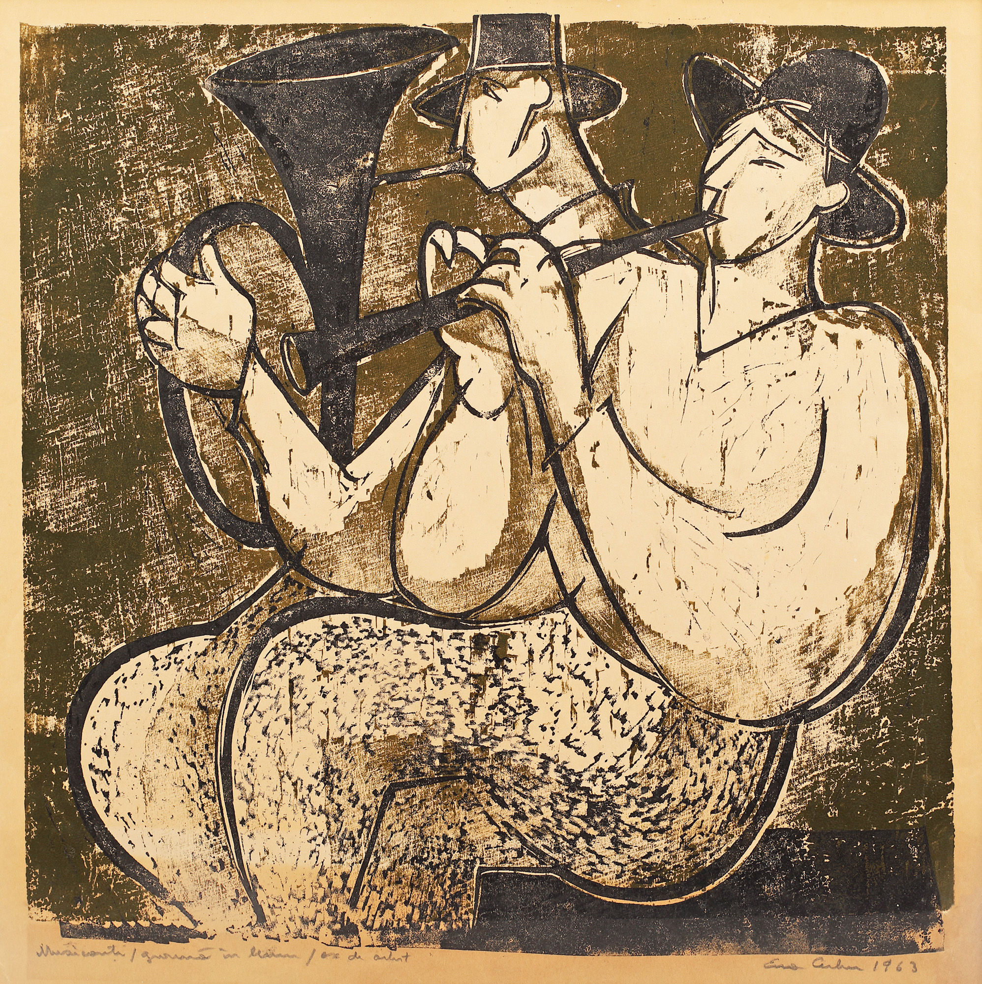 semnat și datat dreapta jos, în creion, "Eva Cerbu, 1963"; intitulat și notat stânga jos, în creion, " Muzicanți, ex. de artist"