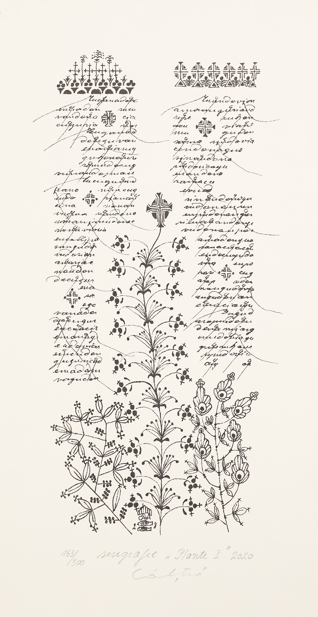 semnat, datat, intitulat, numerotat și notat central jos, în creion, "Câlția, 2020, Plante I, 163/500. serigrafie"