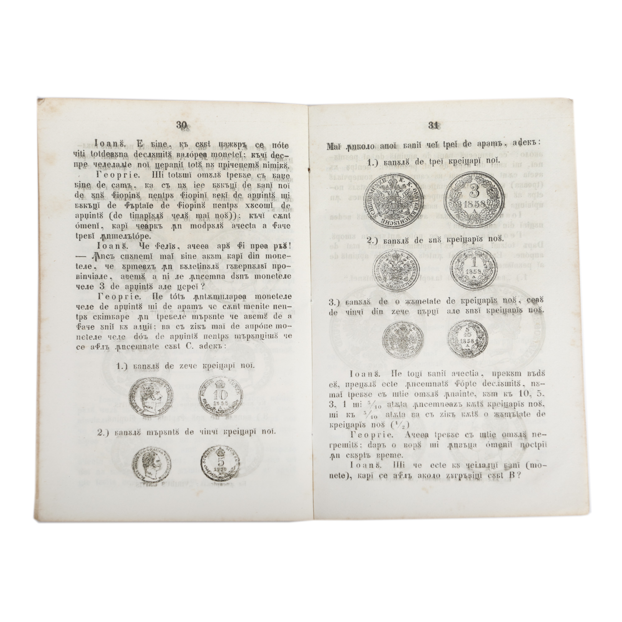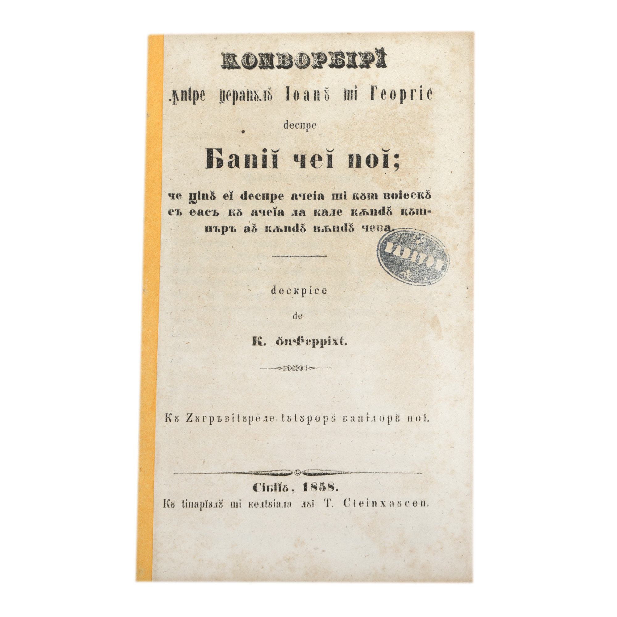 156. "Banii cei noi", de C. Unferriht, Sibiu, 1858, provine din biblioteca lui Theodor Radivon, bijutier, furnizor al Curții Regale