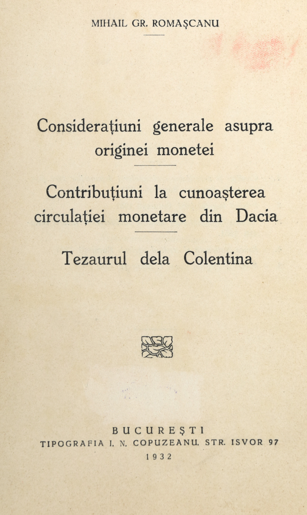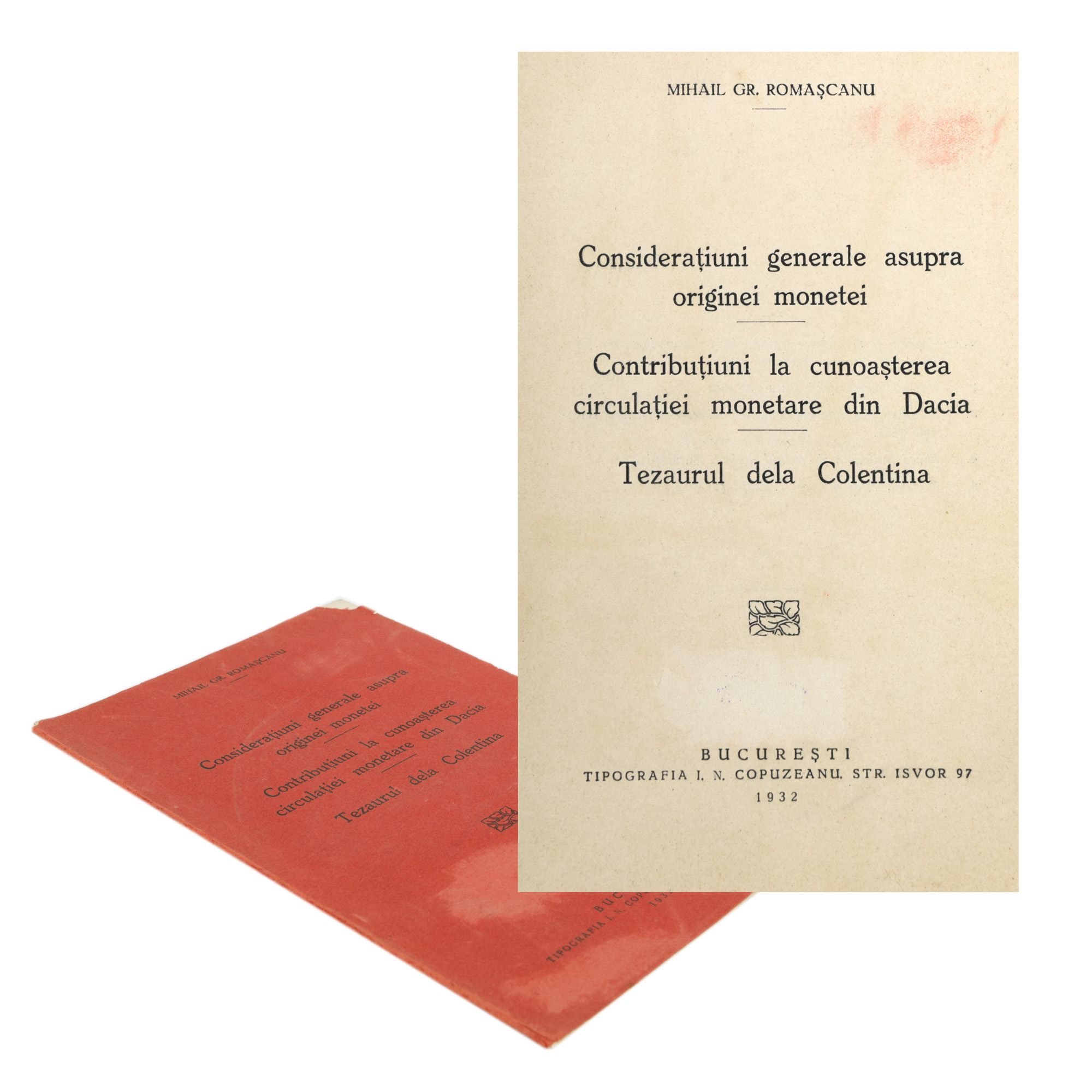 150. ”Considerațiuni generale asupra originei monetei, Contribuțiuni la cunoașterea circulației monetare din Dacia, Tezaurul dela Colentina”, de Mihail Romașcanu, București, 1932