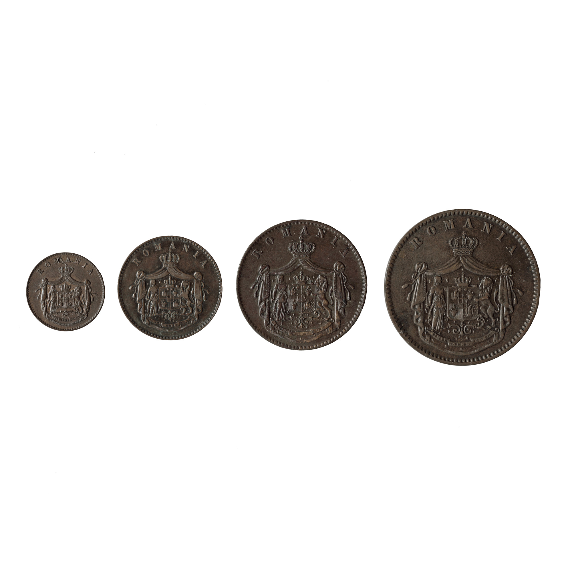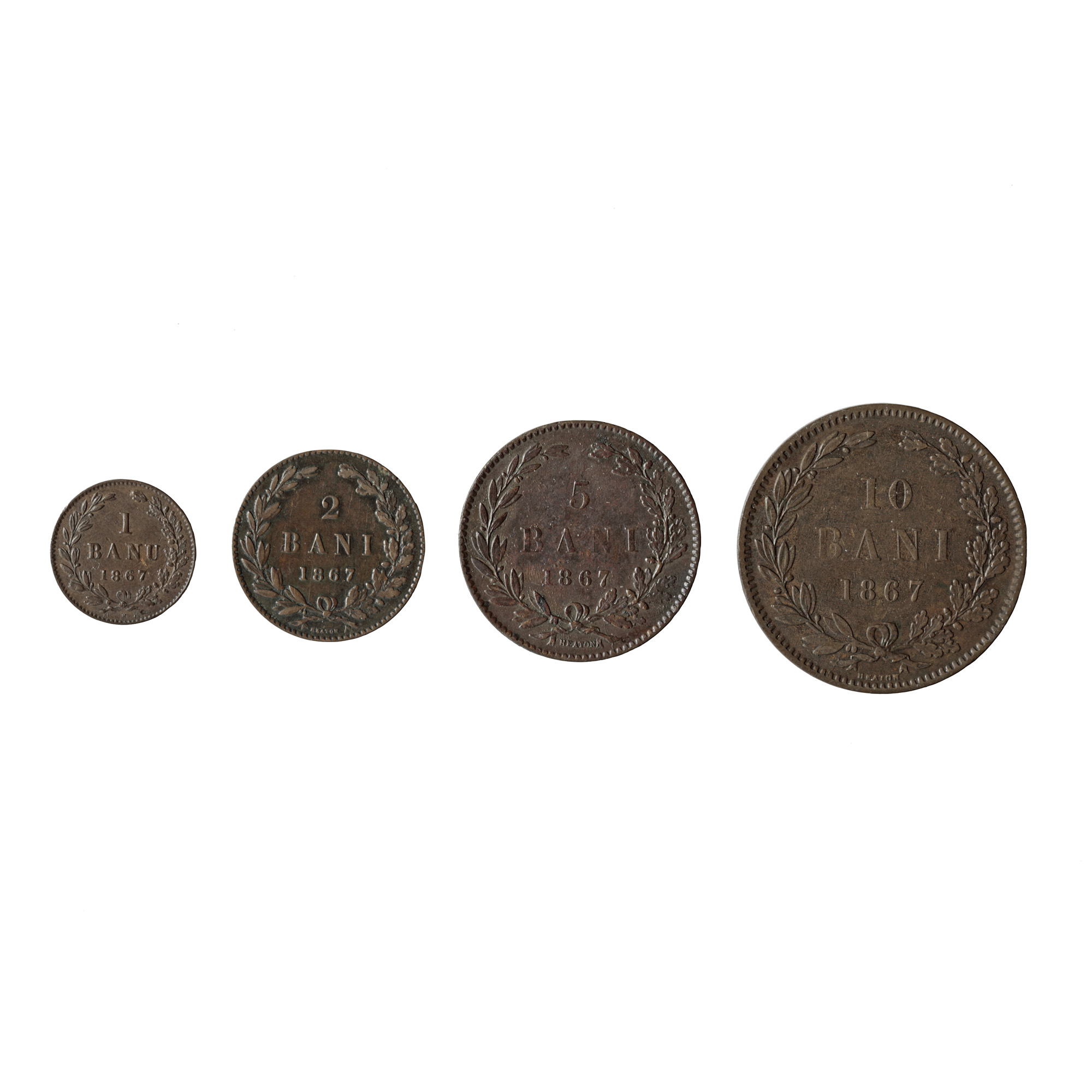 166. Lot format din 4 monede, prima emisiune monetară românească din 1867, 1, 2 5 și10 bani Monetăria Heaton