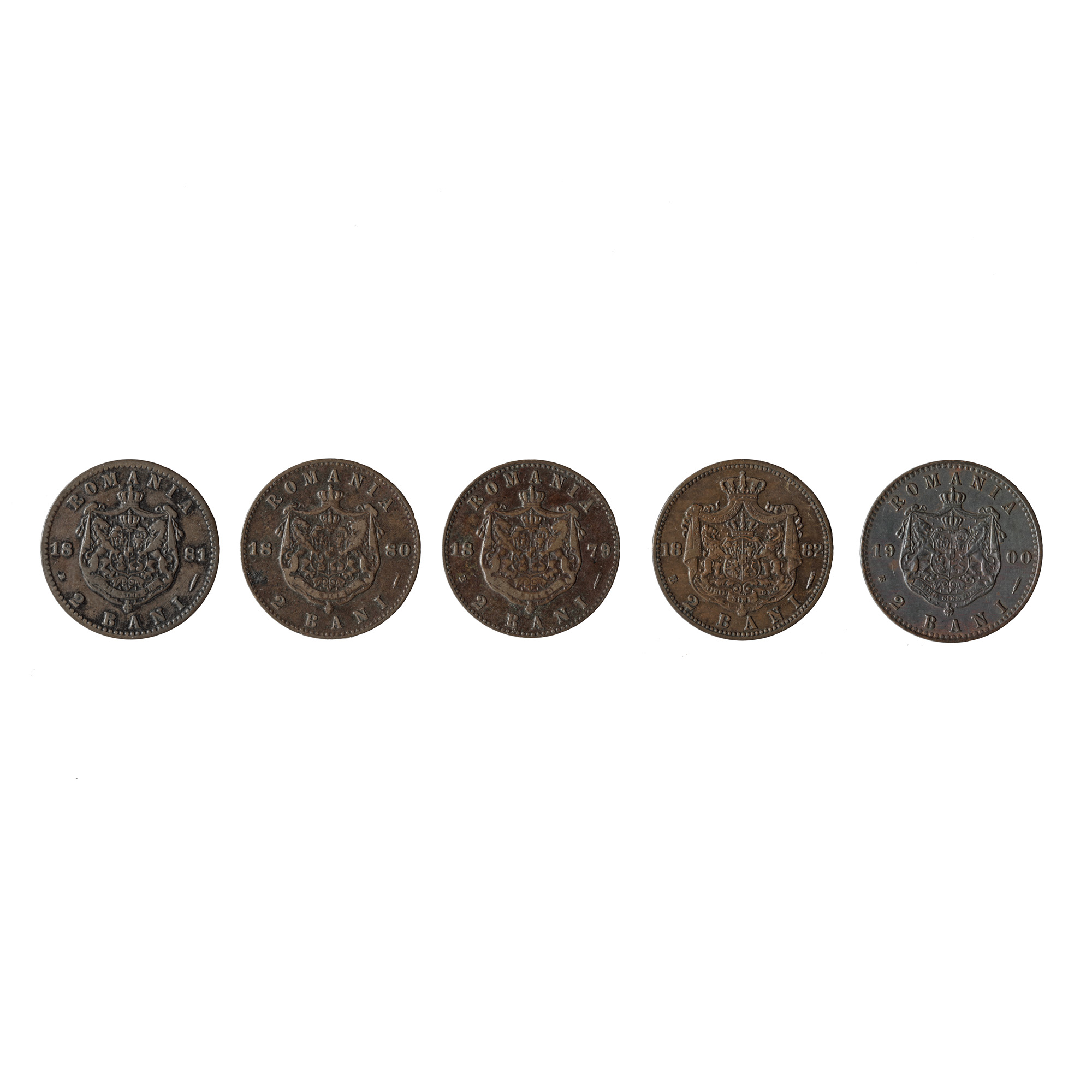168. Lot format din 5 monede 2 bani ani diferiți: 1879, 1880, 1881, 1882, anul 1881 fiind extrem de rar