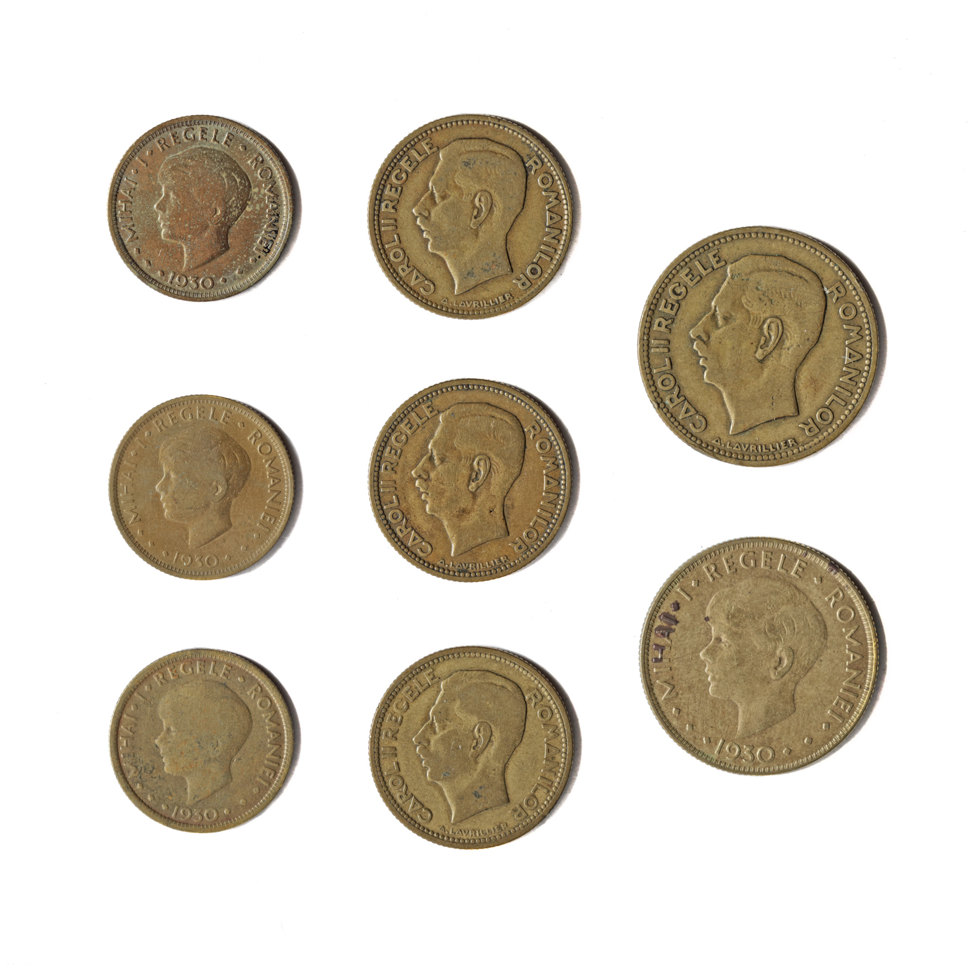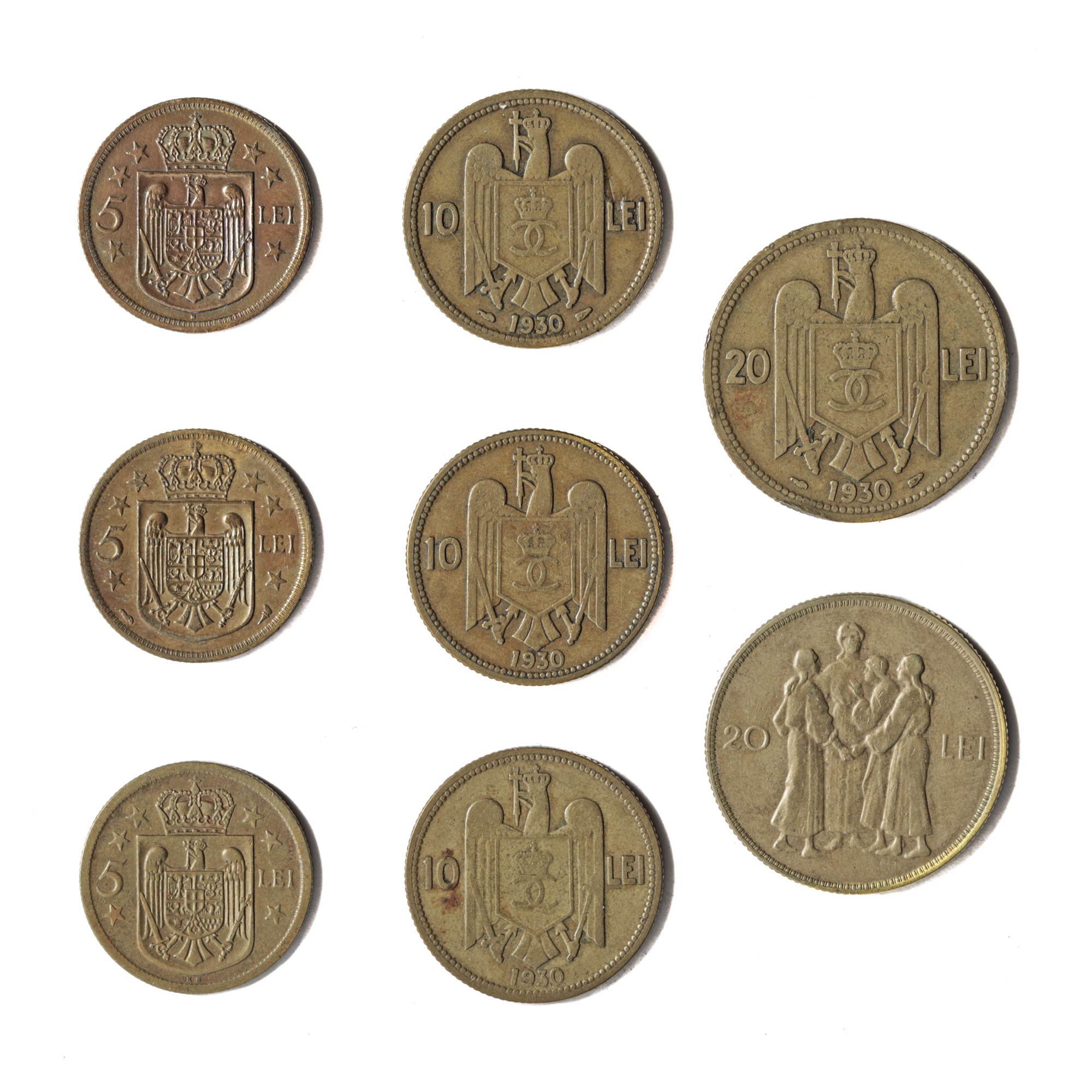 169. Lot format din 8 monede din 1930 cu efigiile regilor Mihai I și Carol II, valori și monetării diferite: 5, 10 și 20 lei