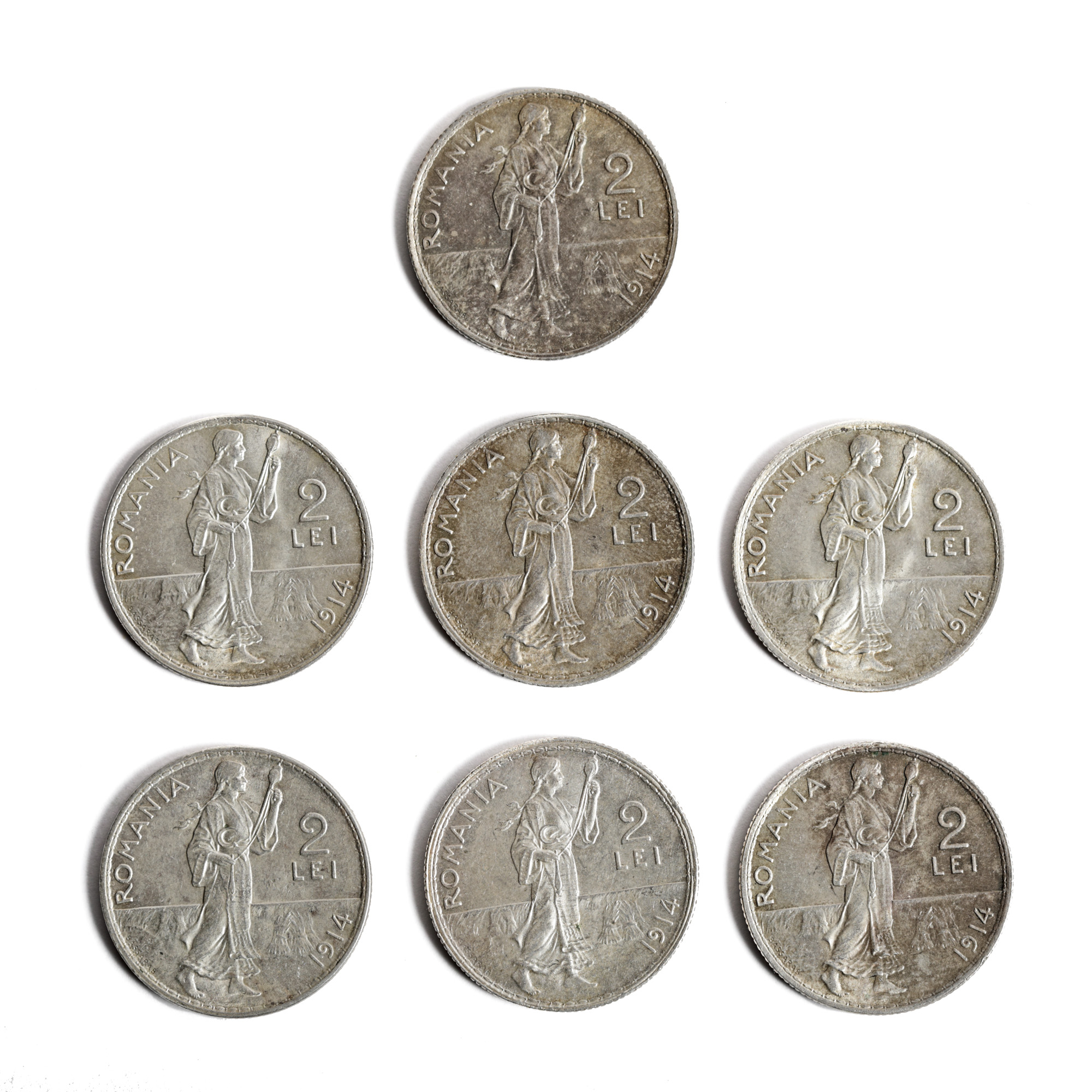 130. Lot format din șapte monede necirculate de 2 Lei 1914, argint