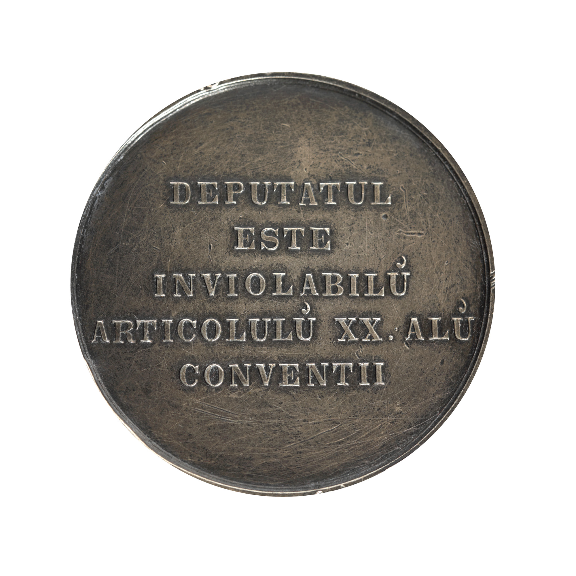 Medalia a fost conferită membrilor primei Camere a Deputaților Principatelor Unite. Pe avers, central, încadrate de ramuri de lauri si surmontate de o coroana, sunt reprezentate Marca Moldovei (capul de bour cu stea) si Marca Valahiei (Vultur cu sceptru si spadă), iar în partea de jos, în semicerc, data de 24 ianuarie 1859. Pe revers, în cinci rânduri, fără nicio ornamentare, este inscripționat textul „DEPUTATUL ESTE INVIOLABILŬ ARTICOLULŬ XX ALŬ CONVENŢII”. Convenţia la care se face referire este „Convenţia relativă la organizarea principatelor Moldovei şi Valahiei” urmare a Conferinţei de la Paris din anul 1858, semnată de reprezentanţii marilor puteri :Imperiul Francez, Imperiul Austriac, Regatul Marii Britanii, Regatul Prusiei, Imperiul Rus, regatul Sardiniei şi Imperiul Otoman. Convenţia are ataşată o anexă cuprinzând îndrumări si stipulații electoarale. Astfel, articolul XX al anexei are următorul text tradus: „Niciun membru al Adunării nu poate să fie arestat sau urmărit în materie penală, pe timpul duratei sesiunii, decît după ce Adunarea a autorizat urmărirea, cu excepţia cazului de flagrant delict”. Pentru realizarea acestei medalii, aceste indrumari din articolul XX au fost rezumate într-o deviză mult mai simplă si precisă „DEPUTATUL ESTE INVIOLABILŬ”.