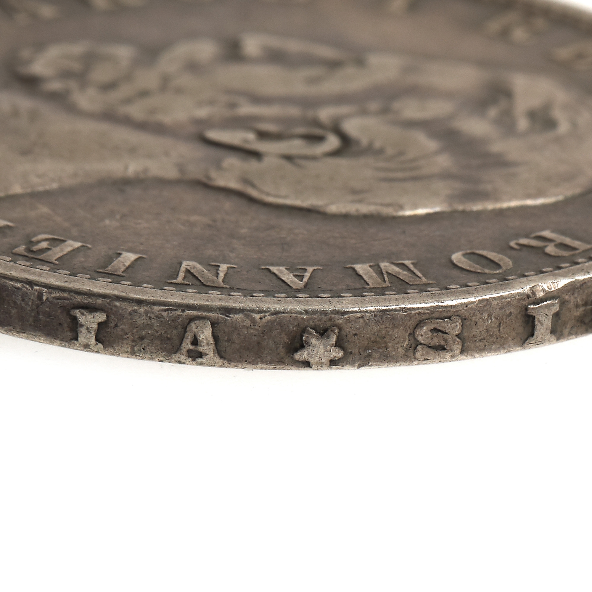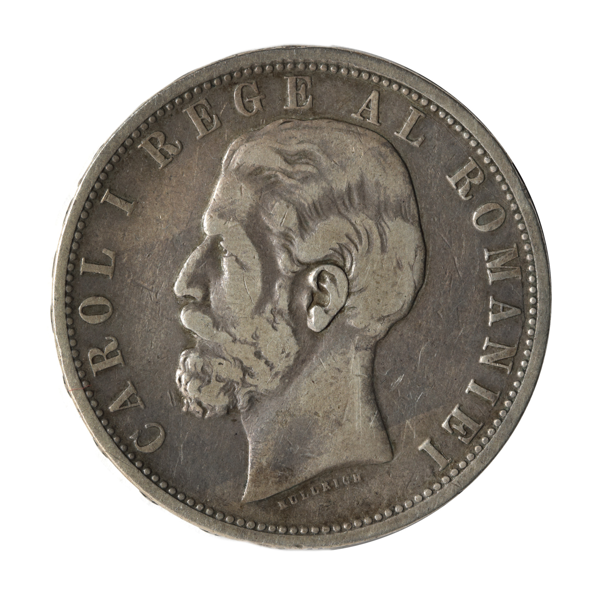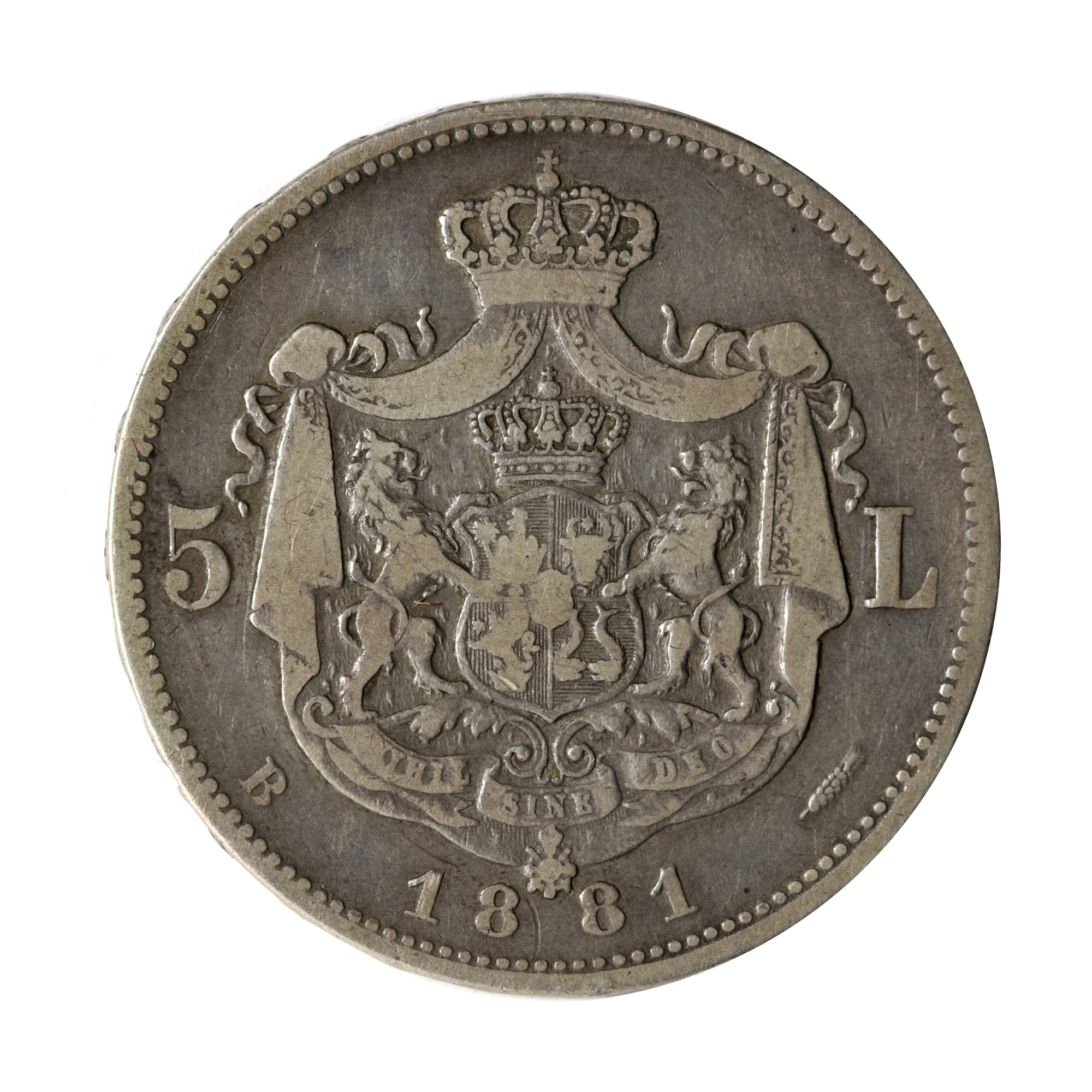 180. Monedă 5 lei 1881, Carol I, variantă foarte rară, pe cant, steaua dupa cuvântul ”Patria” stă pe o rază, argint