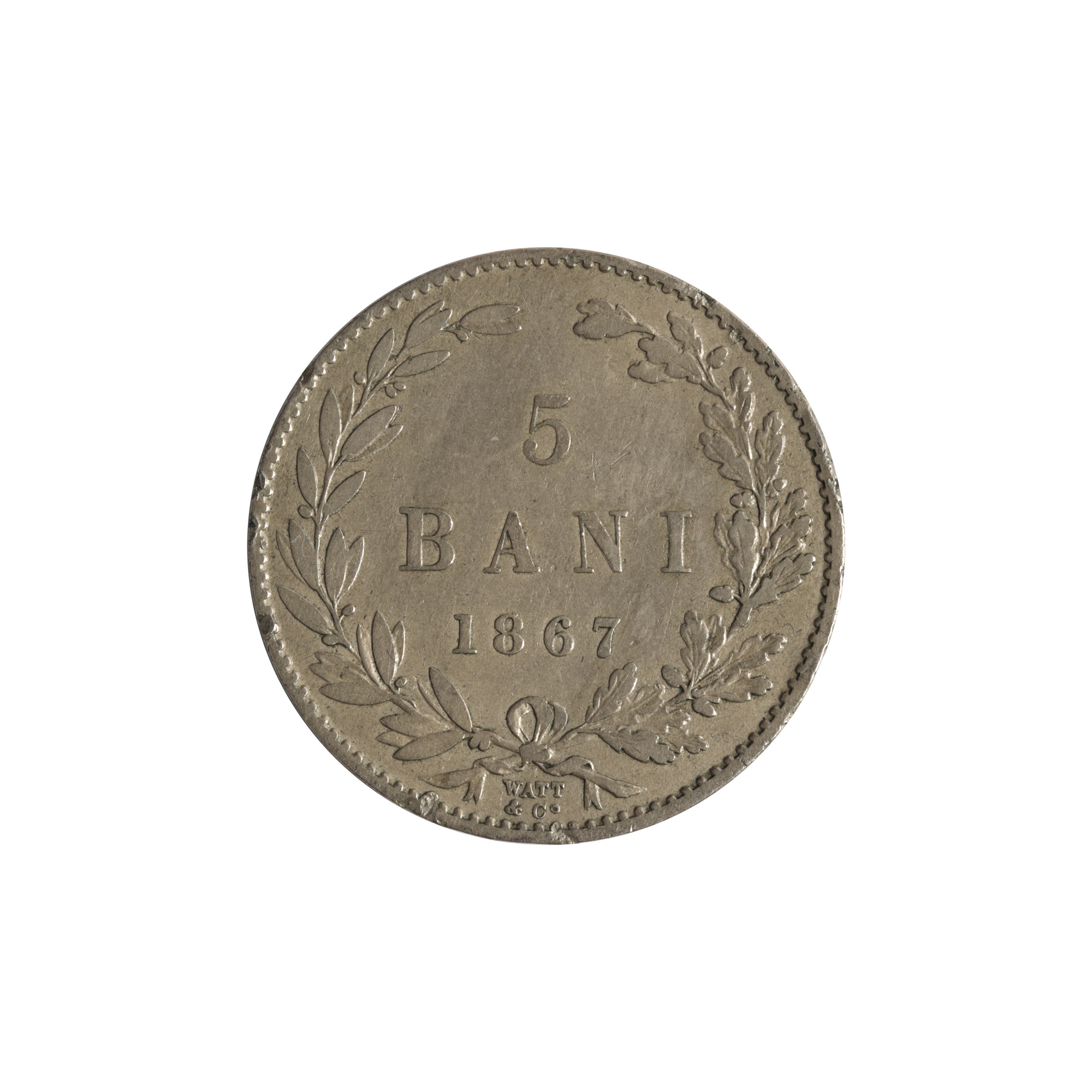 177. Monedă probă 5 bani 1867, dublă grosime, Piefort, orientare monedă, prima serie de probe monetare românești