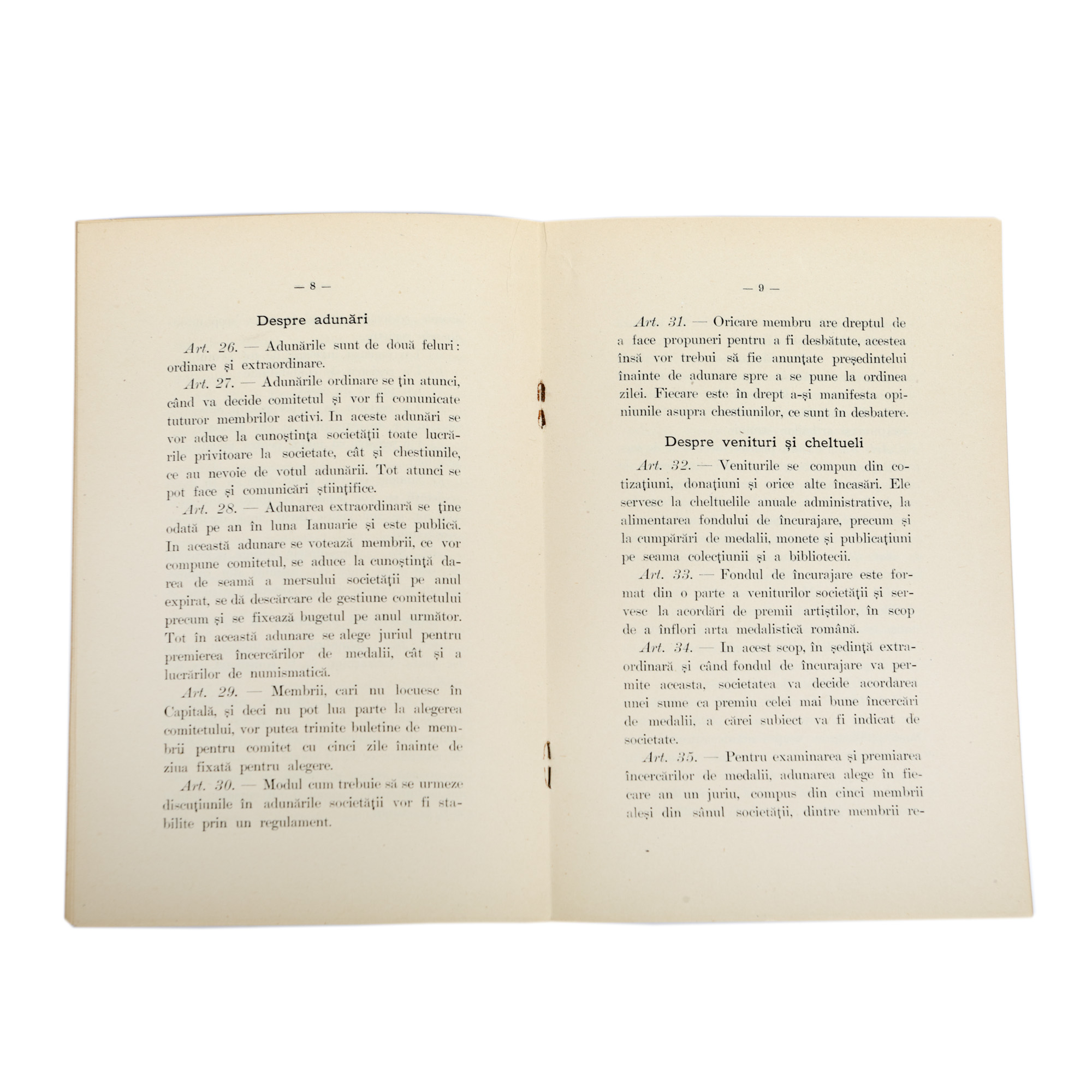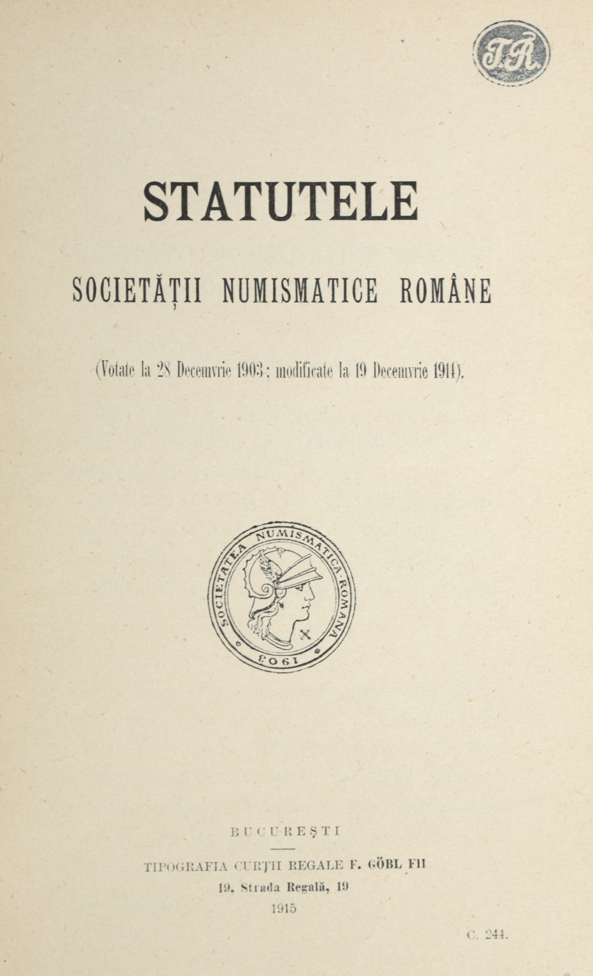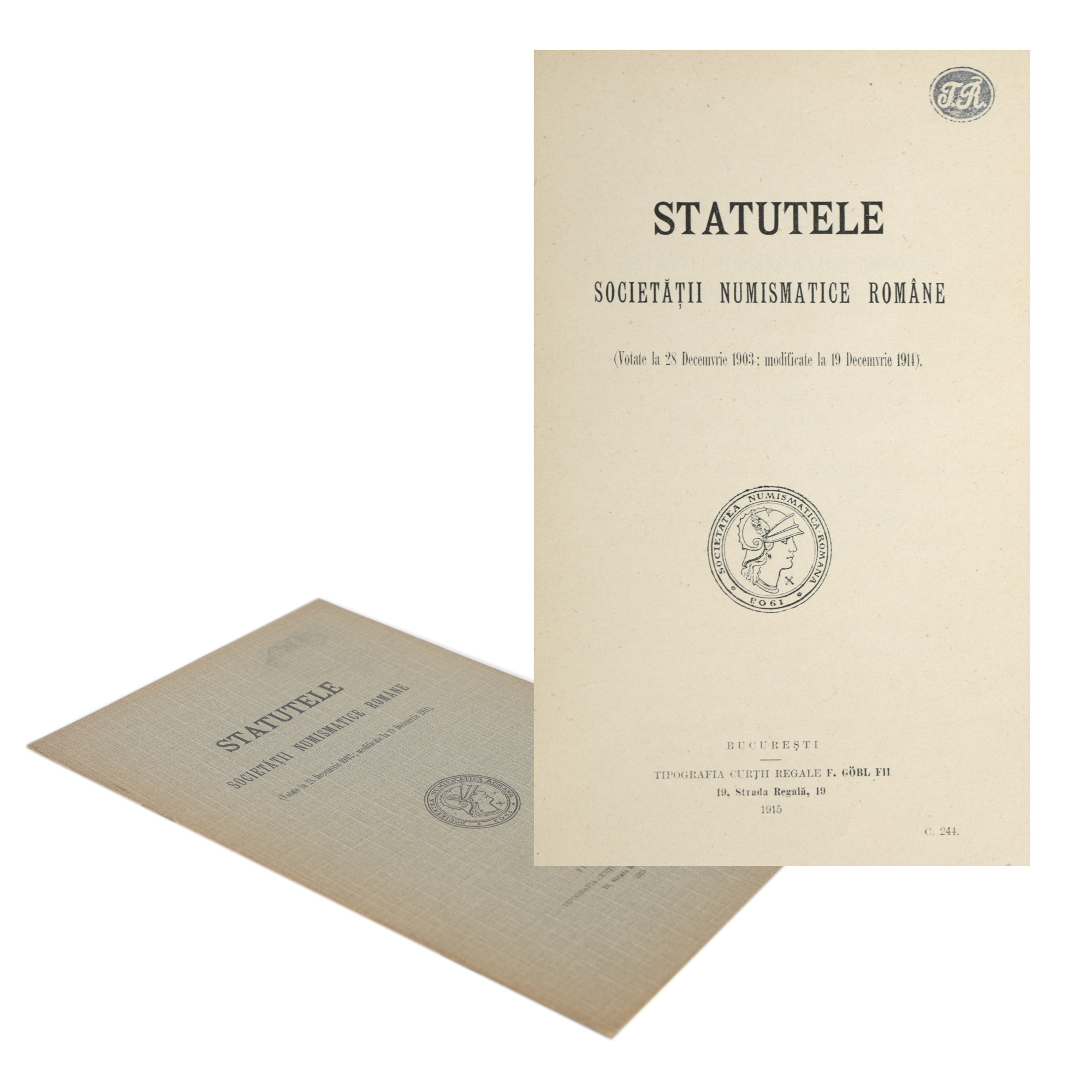 155. ”Statutele Societății Numismatice Române, votate în 1903 și modificate în 1915”, București, 1915, raritate extremă