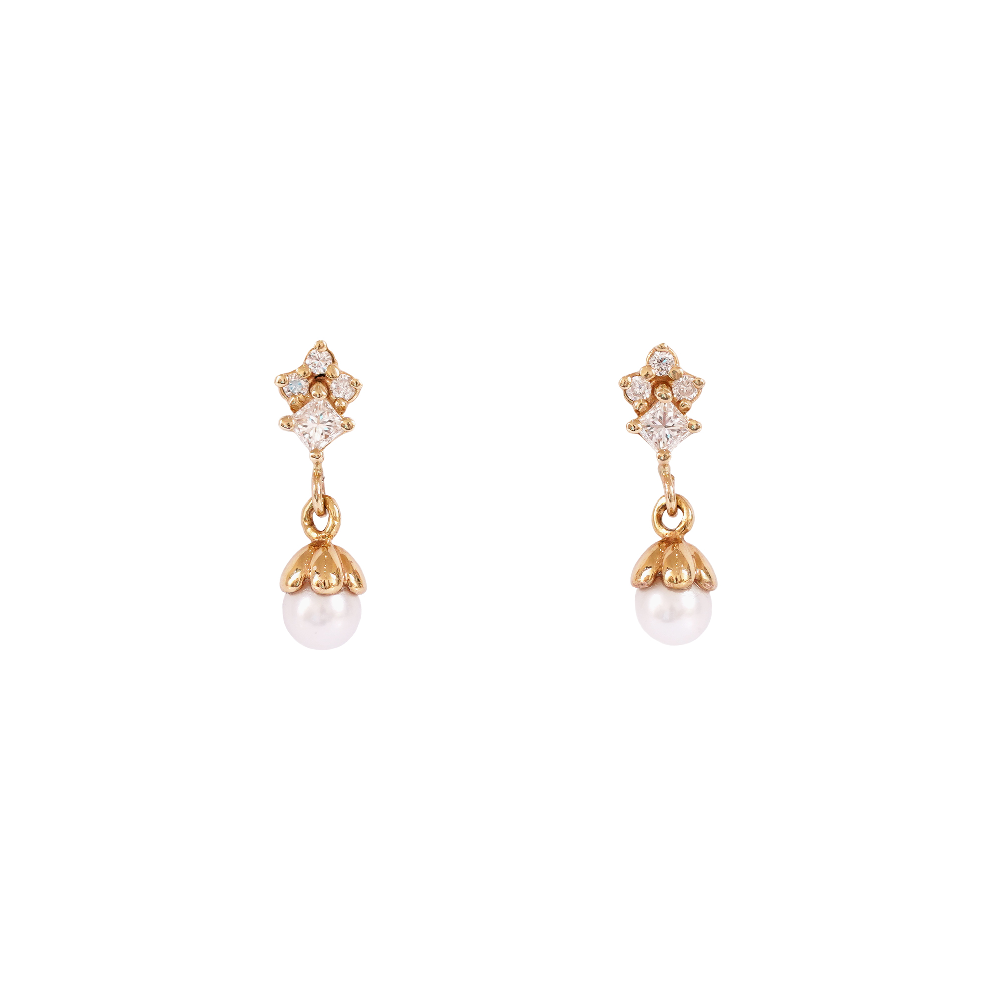 8 diamonds (6 with round brilliant cut, 2 with princess cut), I-J color, VS1-SI2 clarity, approx. 0.23 ct.; 2 Akoya saltwater pearls, round, white color, pearl diameter 4.55-4.61 mm.