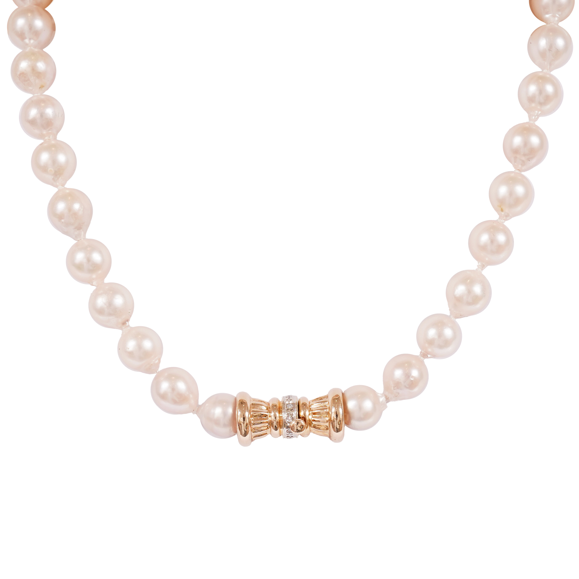 69 cultivated Akoya pearls, round, white color, pearl diameter 9.64-8.06 mm; 10 single-cut diamonds, color G-I, clarity VS1-VS2, approx. 0.08 ct.