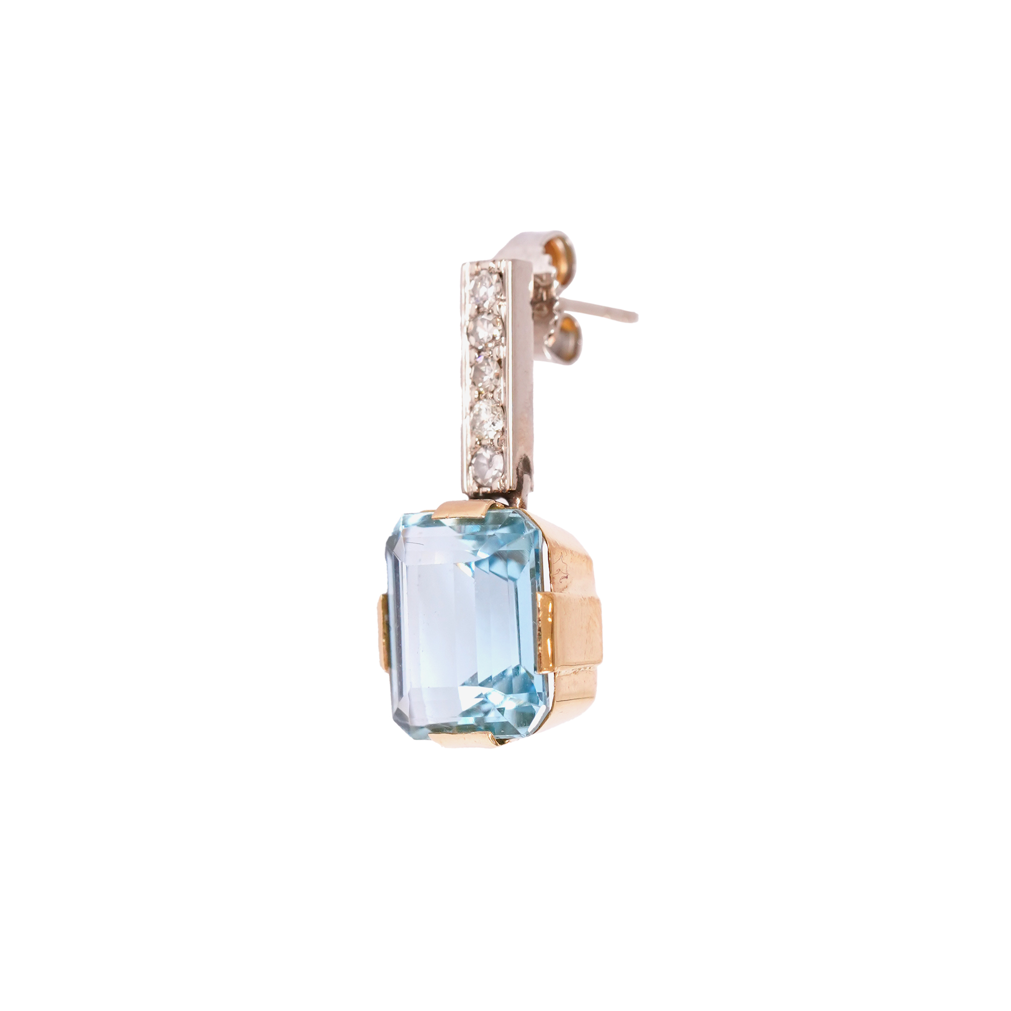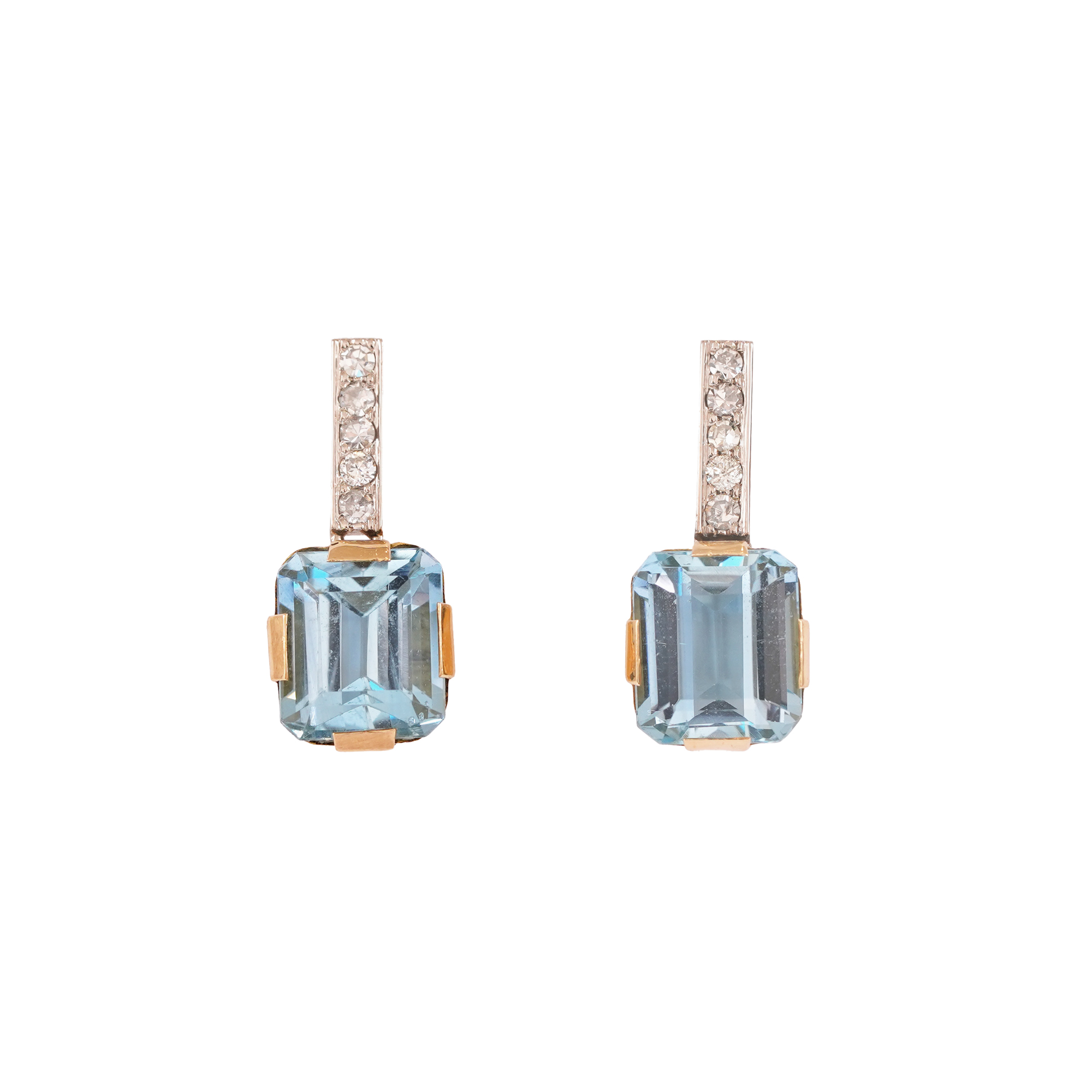 2 aquamarines with emerald cut, blue color, clarity without remarks, approx. 7.40 ct.,; 10 diamonds (8 with single cut and 2 with round brilliant cut), color J-L, clarity SI2-I2, approx. 0.25 ct.