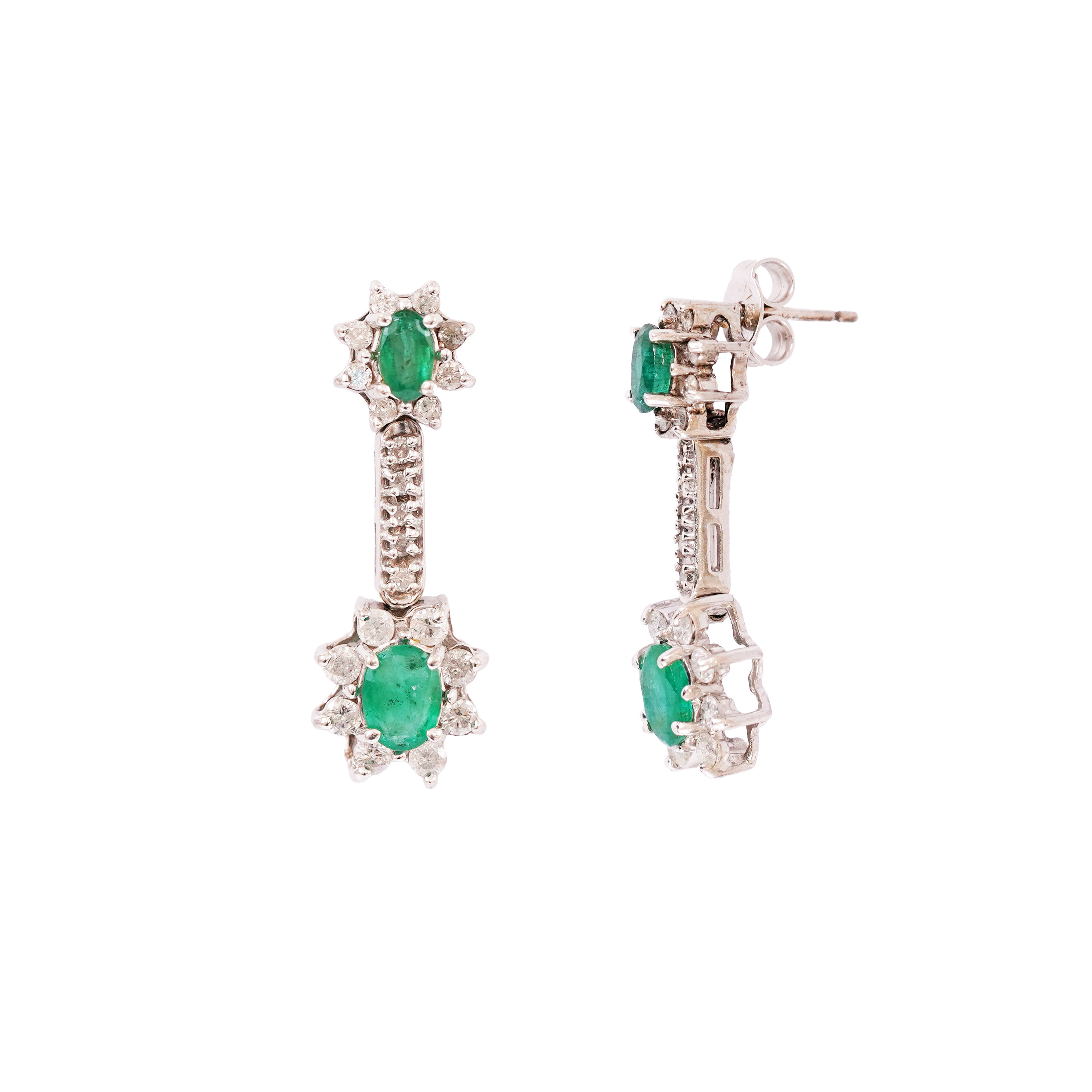 4 oval faceted emeralds, green color, clarity with large inclusions, approx. 1.28 ct.; 42 diamonds with round brilliant cut, color G-K, clarity I2-I3, approx. 1.05 ct.