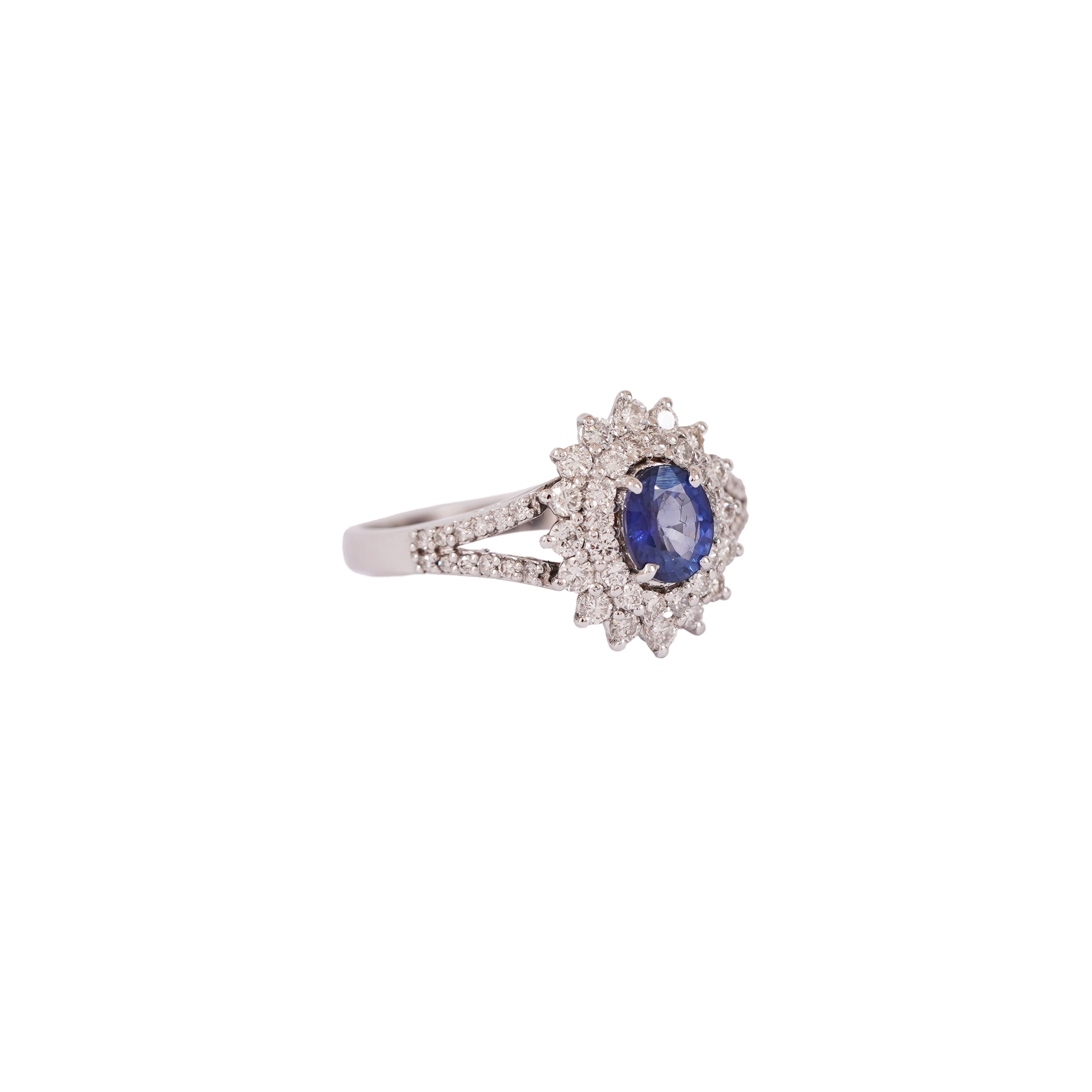 1 oval faceted sapphire, blue color, clarity flawless, approx. 0.76 ct.; 56 diamonds with round brilliant cut, color F-H, clarity VS1-SI2, approx. 0.64 ct.