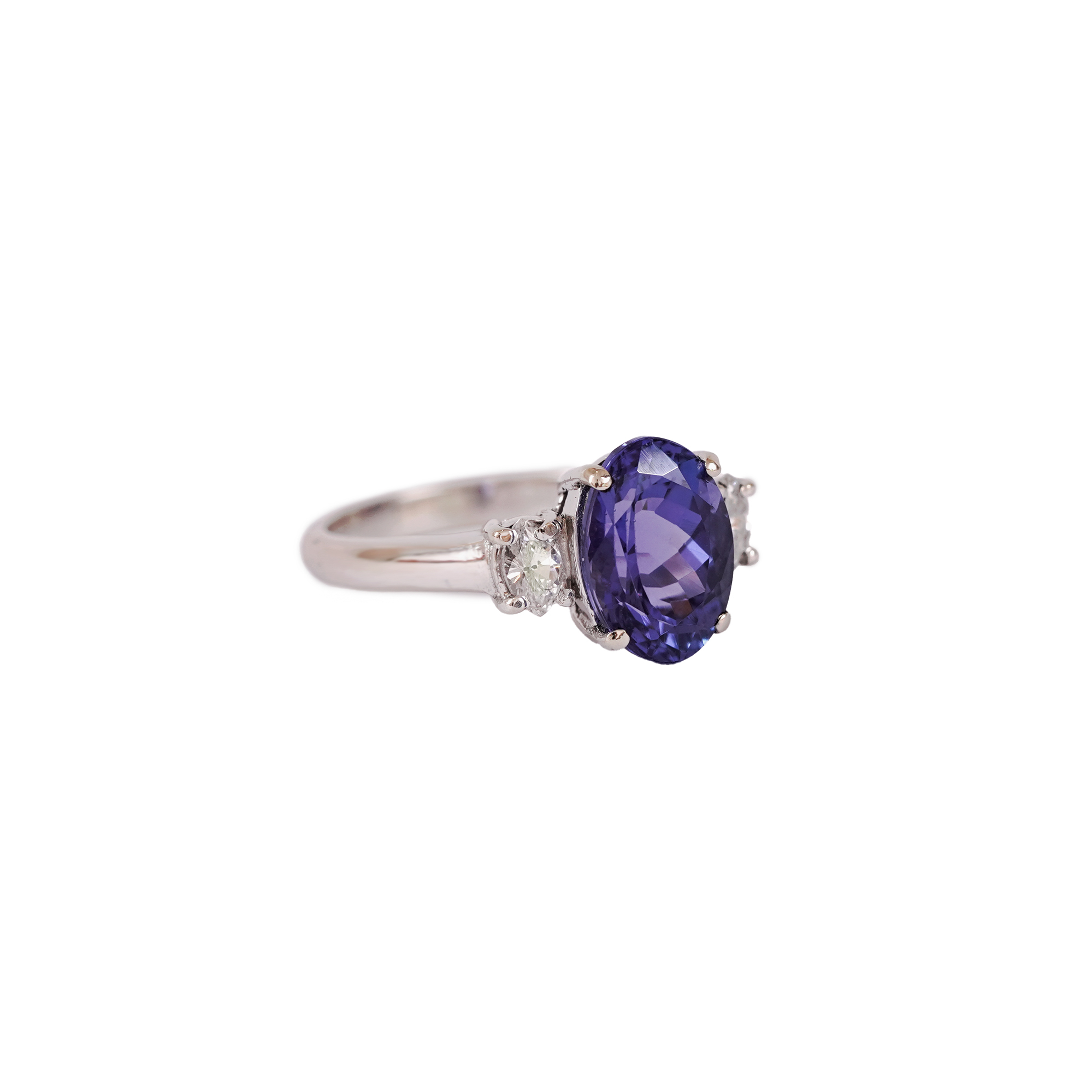 1 oval faceted tanzanite, blue-lilac color, clarity without inclusions, approx. 4.24 ct.; 2 diamonds with marquise cut, color H-J, clarity VS2-SI1, approx. 0.34 ct.