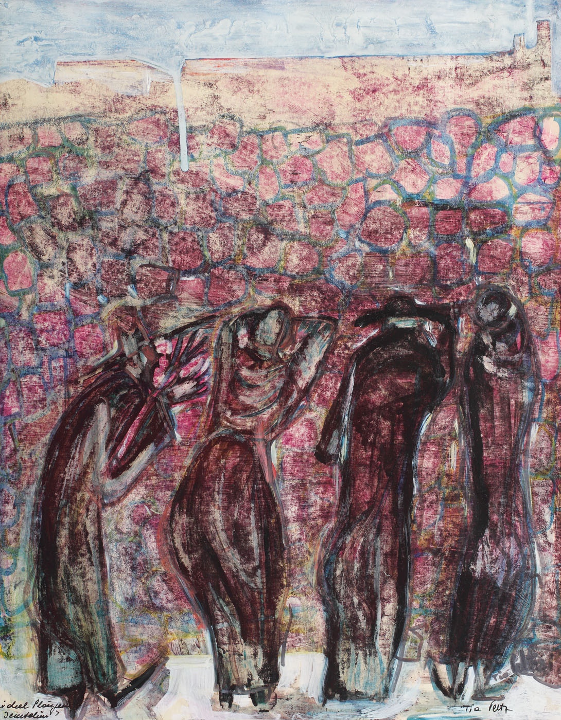 semnat de două ori dreapta jos, cu negru, Tia Peltz; intitulat și localizat stânga jos, cu negru, Zidul Plângerii, Ierusalim