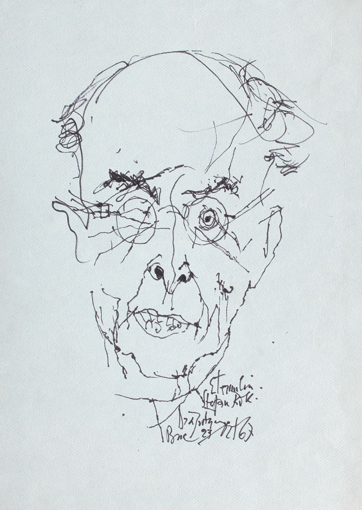 semnat, datat, localizat şi dedicat dreapta jos, cu negru, Drăguţescu, 23.XII.(19)67, Buc(ureşti), Eternului Stephan Roll
