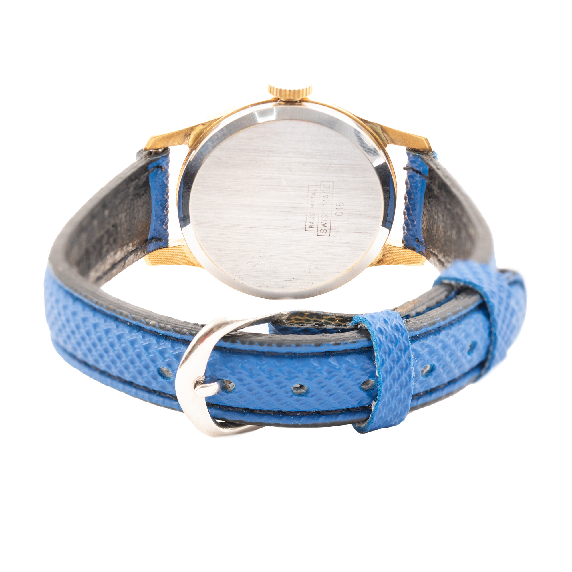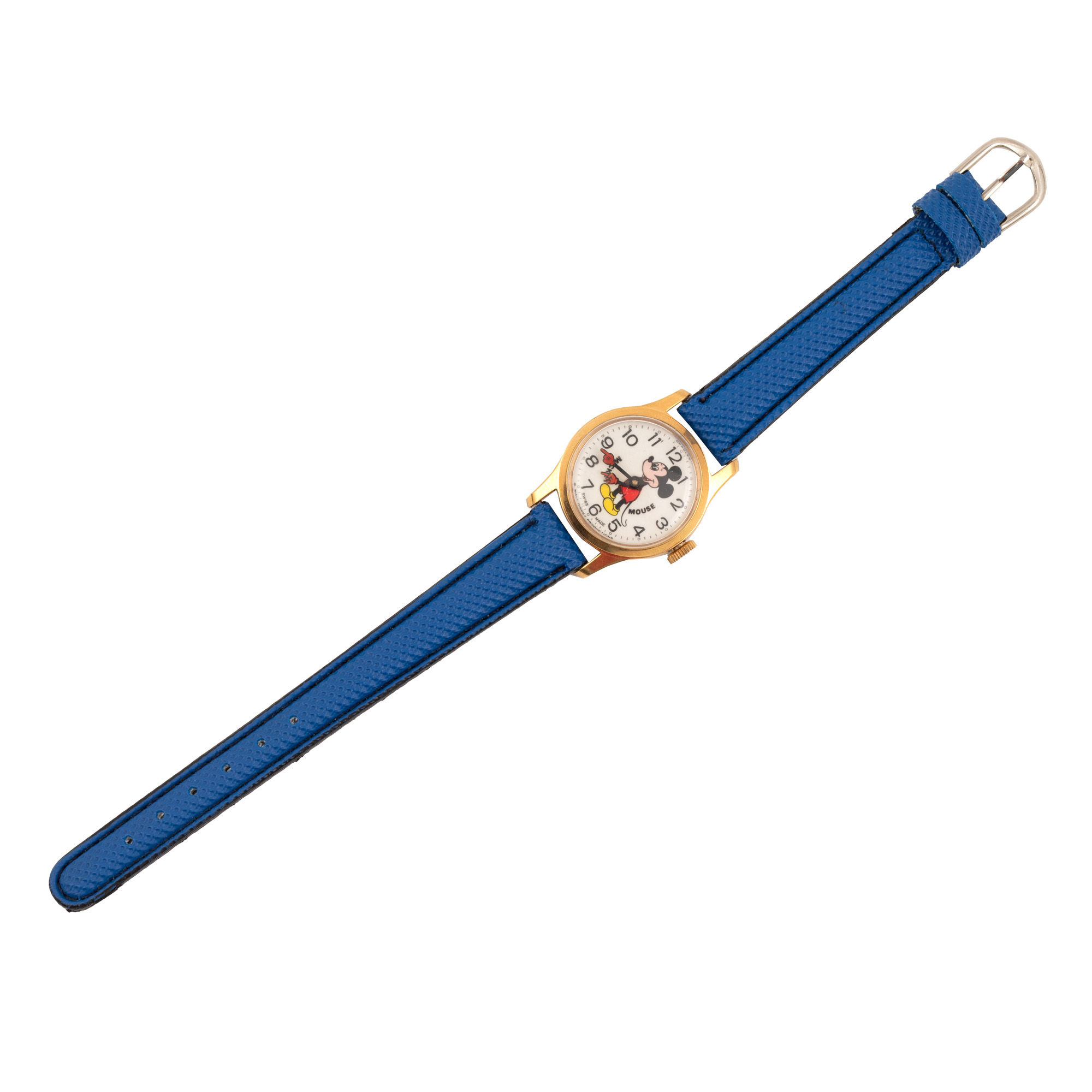 Ceas Bradley American Greetings Corporation, ediție Mickey Mouse, de mână, unisex. Cadran de culoare alb, imprimat cu imaginea personajului animat Mickey Mouse, indici numerale arabe. Curea adăugată aftermarket, din piele, de culoare albastră, cu sistem de închidere clasic cu cataramă.