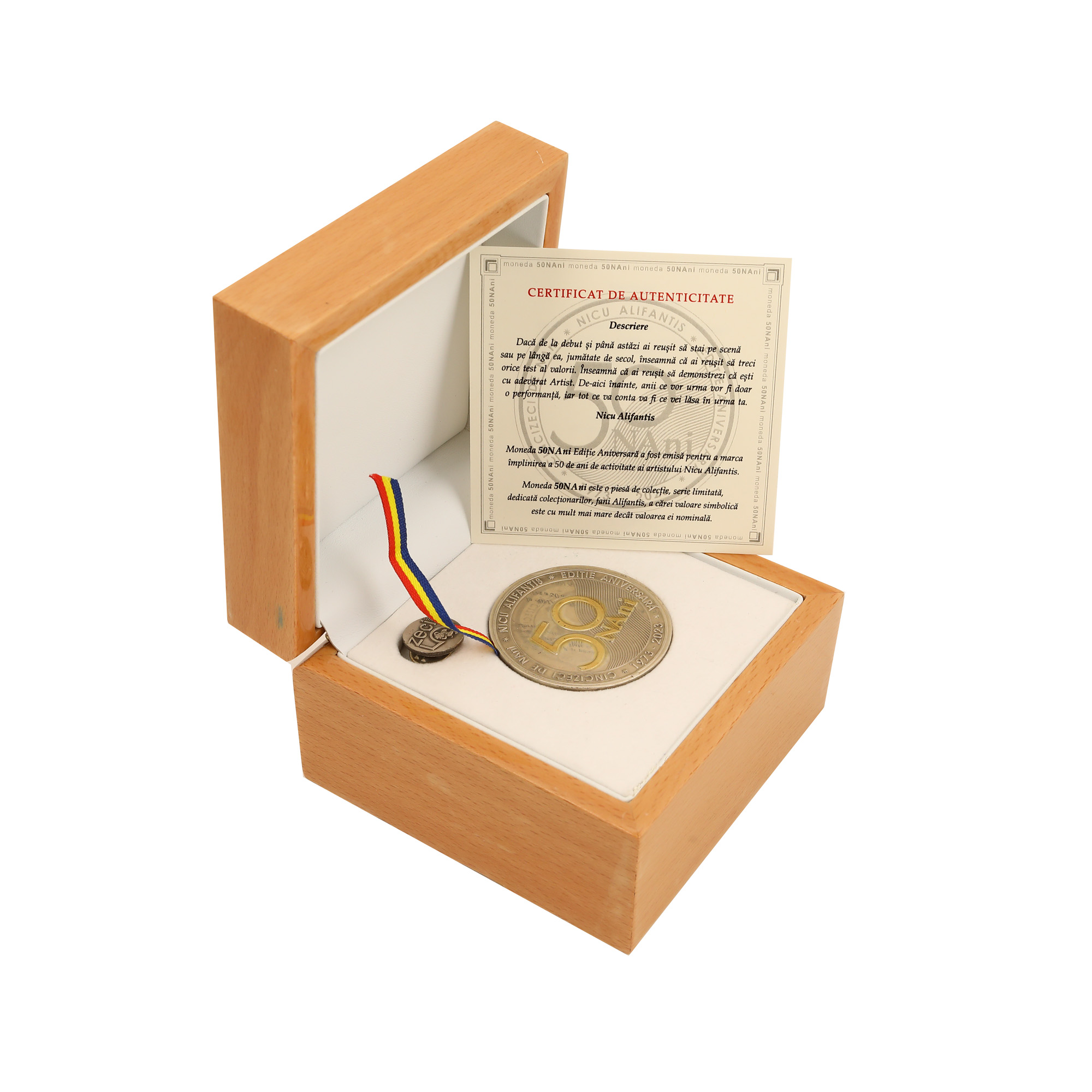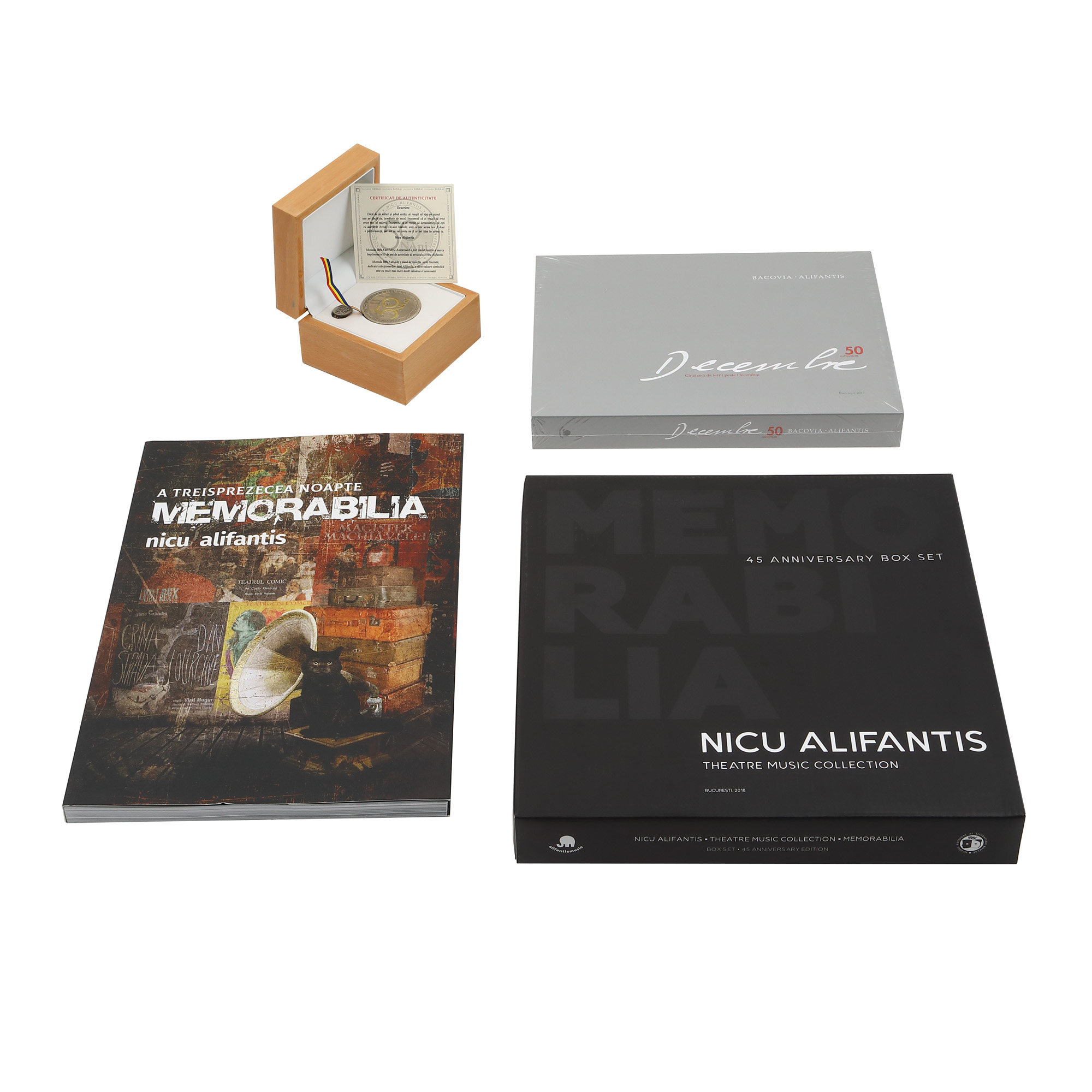 77. Lot format din medalie și pin, set aniversar a 50 de ani de activitate, cartea "A treisprezecea noapte", un boxset "Decembre - 50 de Ierni peste Decembre" și un boxset Theatre Music Memorabilia, set aniversar a 45 de ani de activitate, provenind de la Nicu Alifantis