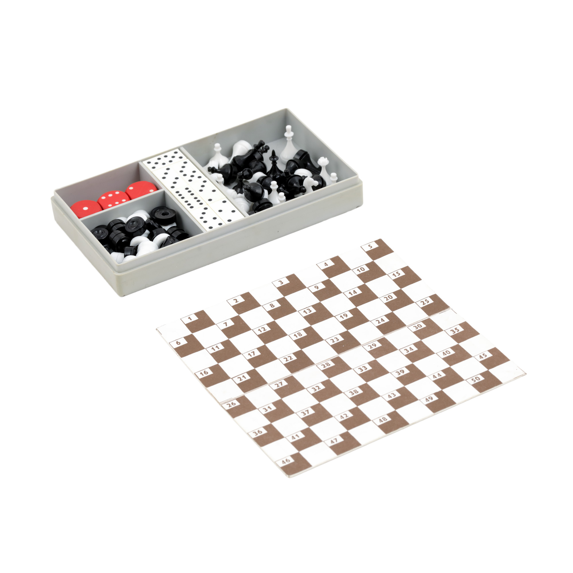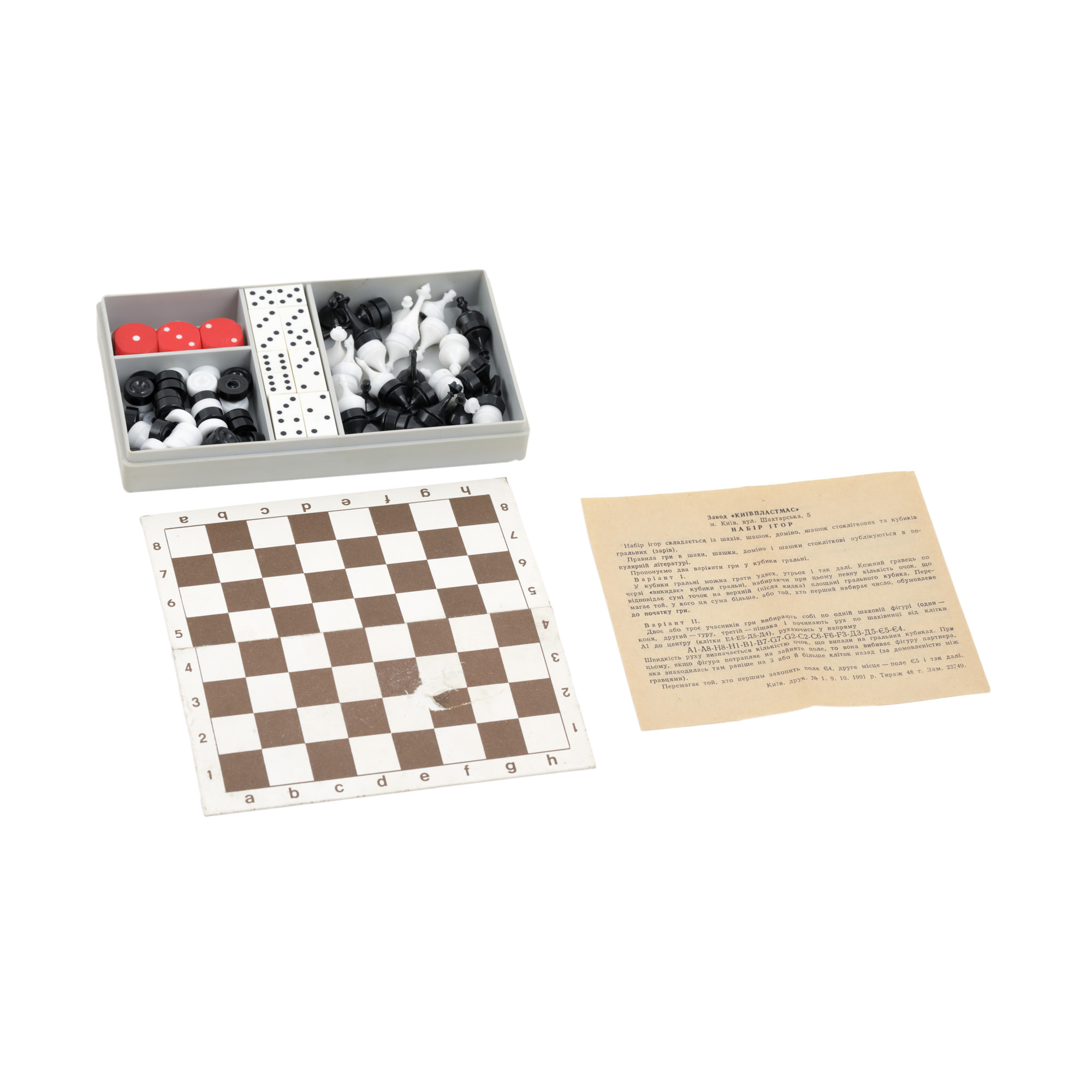 65. Set de călătorie, format din trei jocuri (șah, table și domino), cu instrucțiunile originale și tabla de joc, în cutia originală, model sovietic [anii '80]