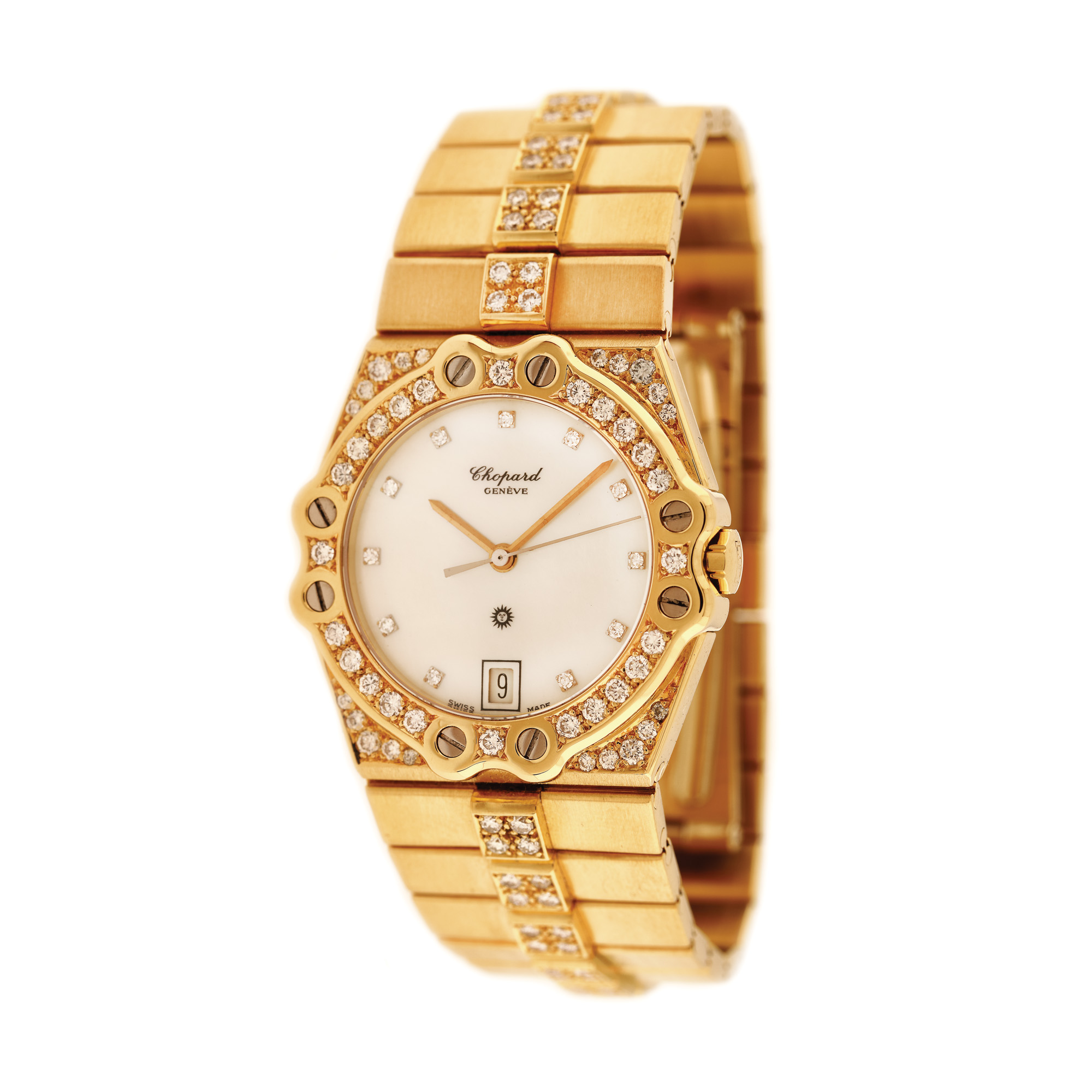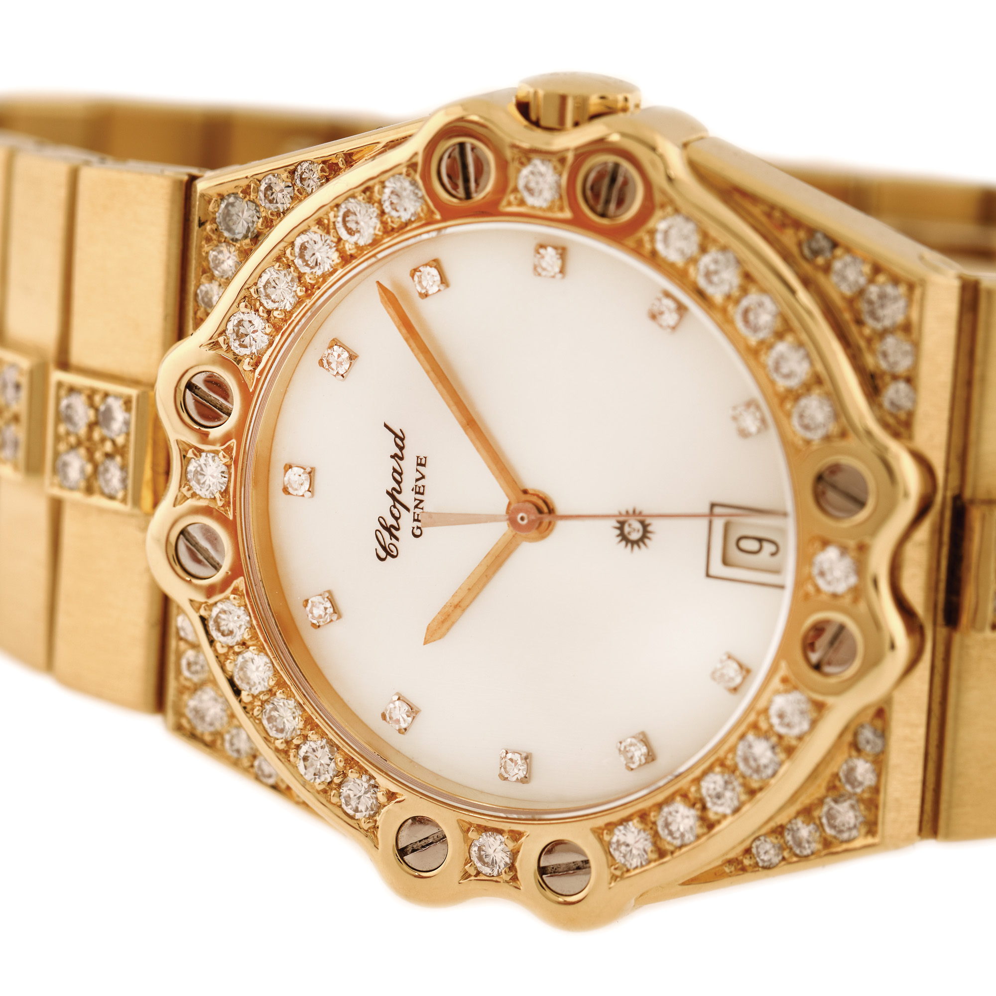 Ceas Chopard St. Moritz, din aur, de mână, de damă, referință 2171, mecanism quartz. Cadran din sidef, cu indici orari înlocuiți cu diamante, registru pentru dată în locul orei 6. Bezel și brățară decorate cu diamante. Brățară și sistem de închidere tip deployant, din aur, originale.