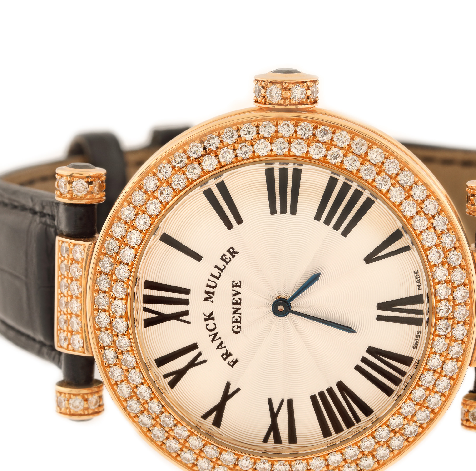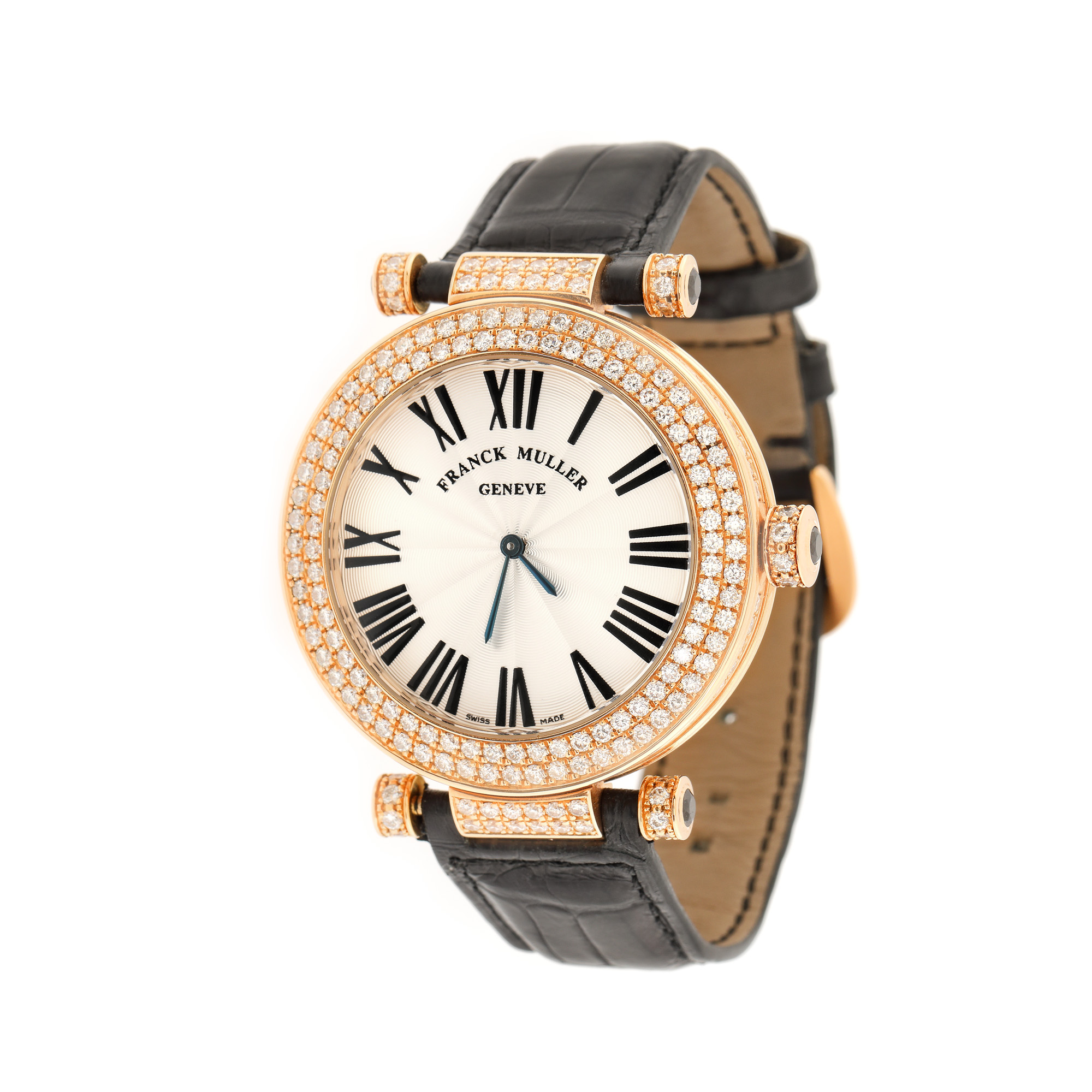 Ceas Franck Muller Master of Complication, din aur roz, de mână, unisex, ornat cu diamante, referință 4200 QZ R D2, mecanism quartz. Cadran silver, decorat în tehnica guilloché, numerale romane și bezel decorat cu diamante. Curea din piele de aligator, de culoare neagră și cataramă din aur roz, decorată cu diamante, originale. Accesorii: cutie originală.