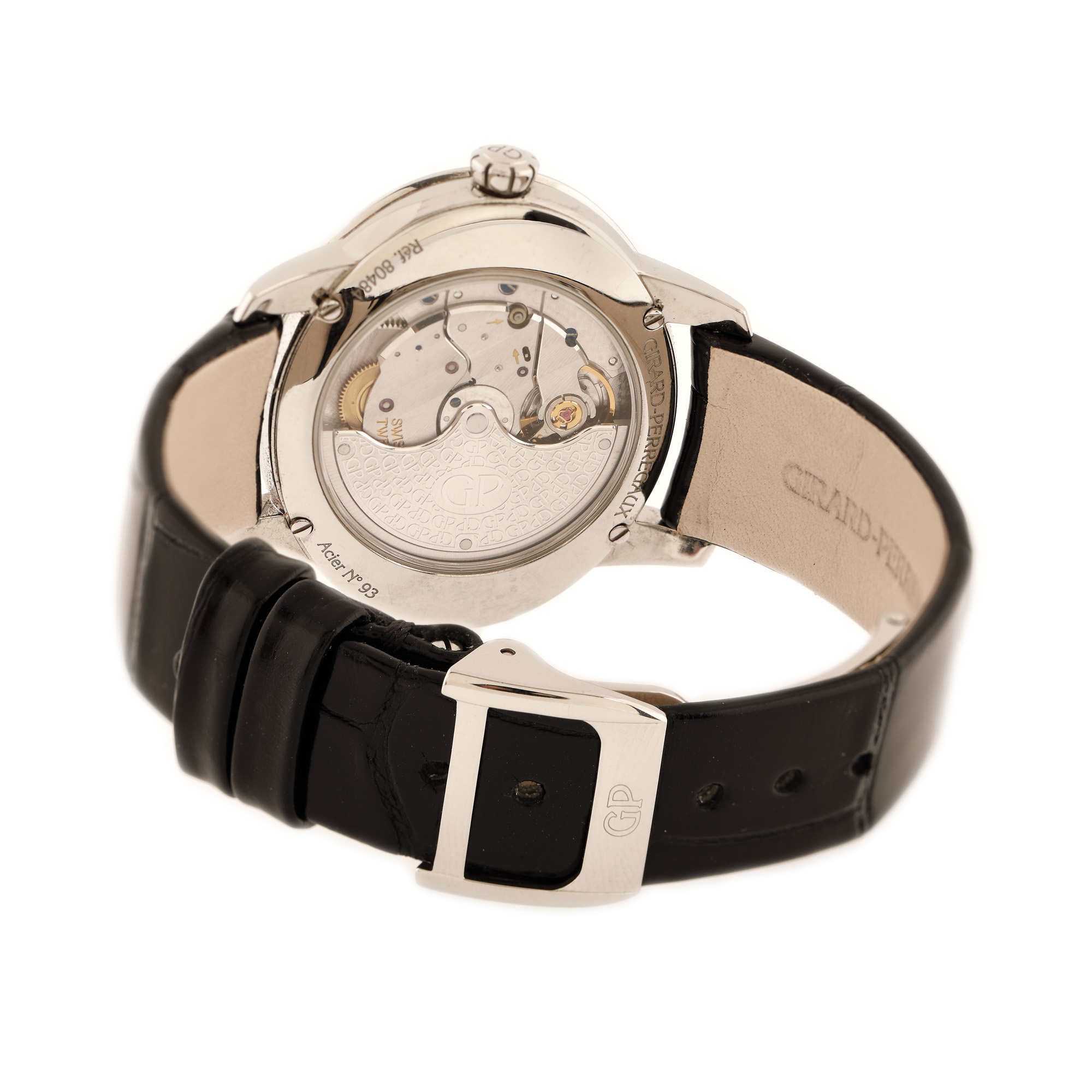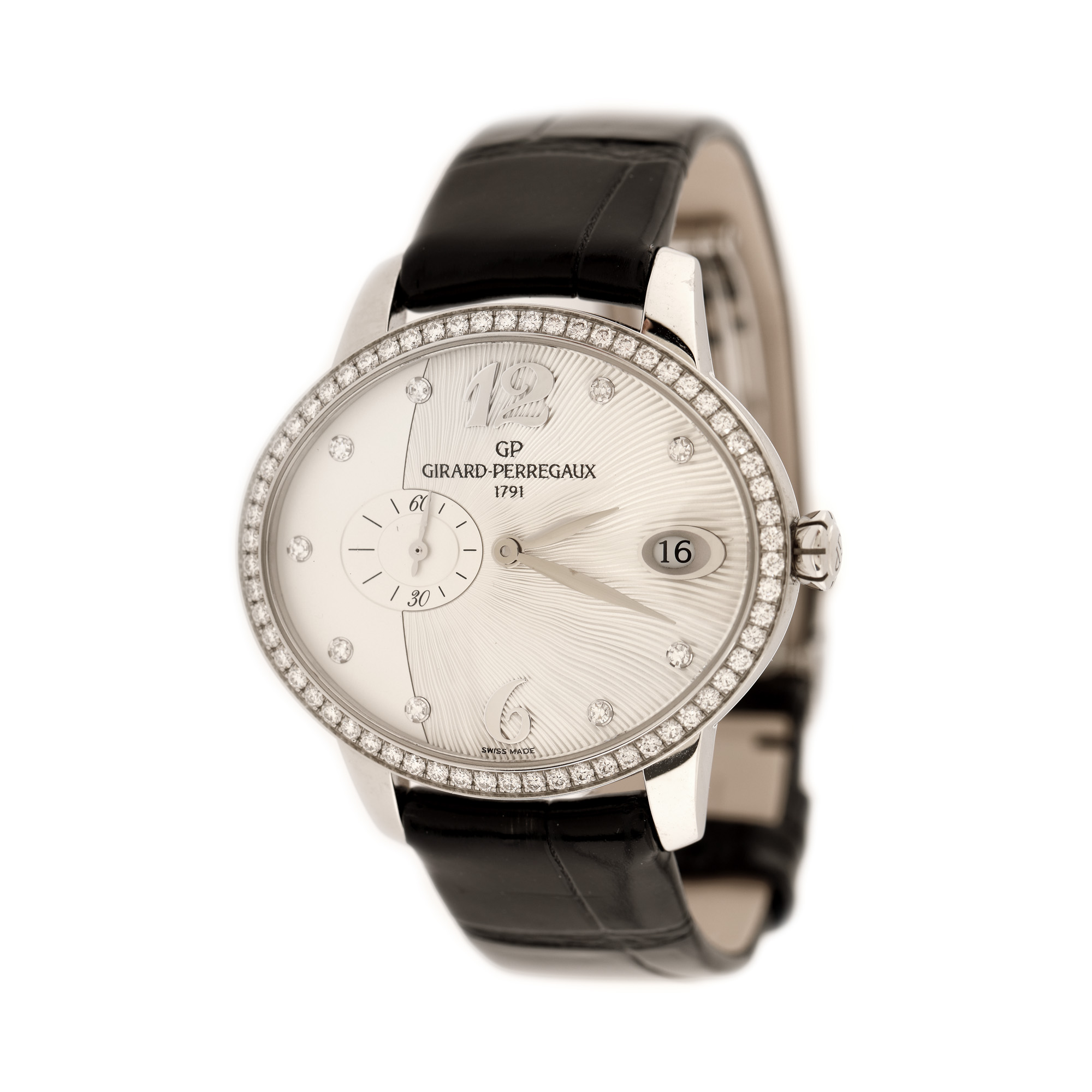 Ceas Girard Perregaux Cat's Eye, de mână, de damă, referință 80484, mecanism automatic, anterior vitrat, calibru GP03300, rezervă de timp 46 h. Cadran de culoare argintiu, decorat parțial în tehnica guilloché, indici orari înlocuiți cu diamante, registru pentru dată în dreptul orei 3 și registru pentru secundar în dreptul orei 9. Bezel ornat cu diamante. Curea din piele lăcuită, de culoare neagră și sistem de închidere tip deployant, din oțel inoxidabil, originale. Accesorii: manual de utilizare; cutie originală fără pernă interioară