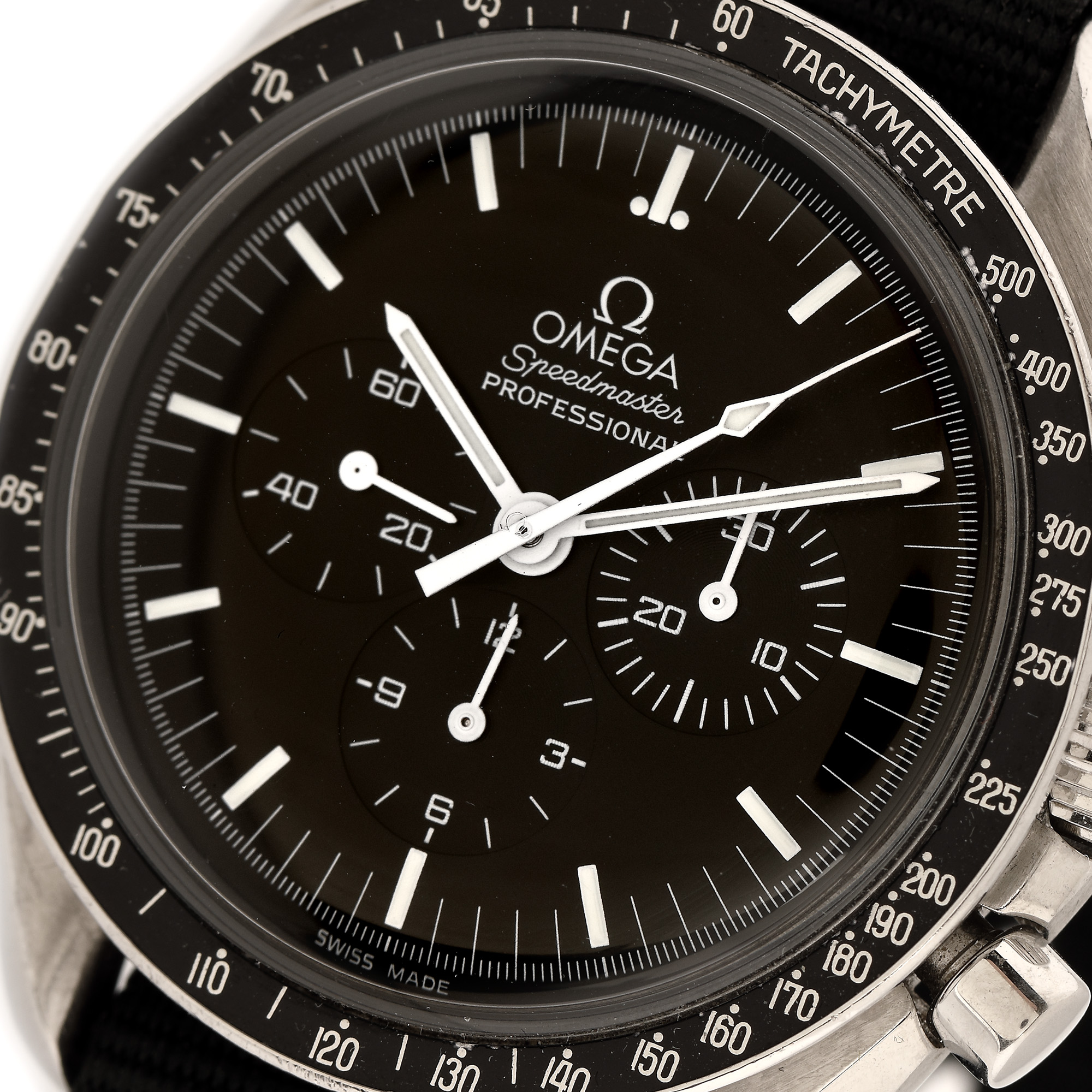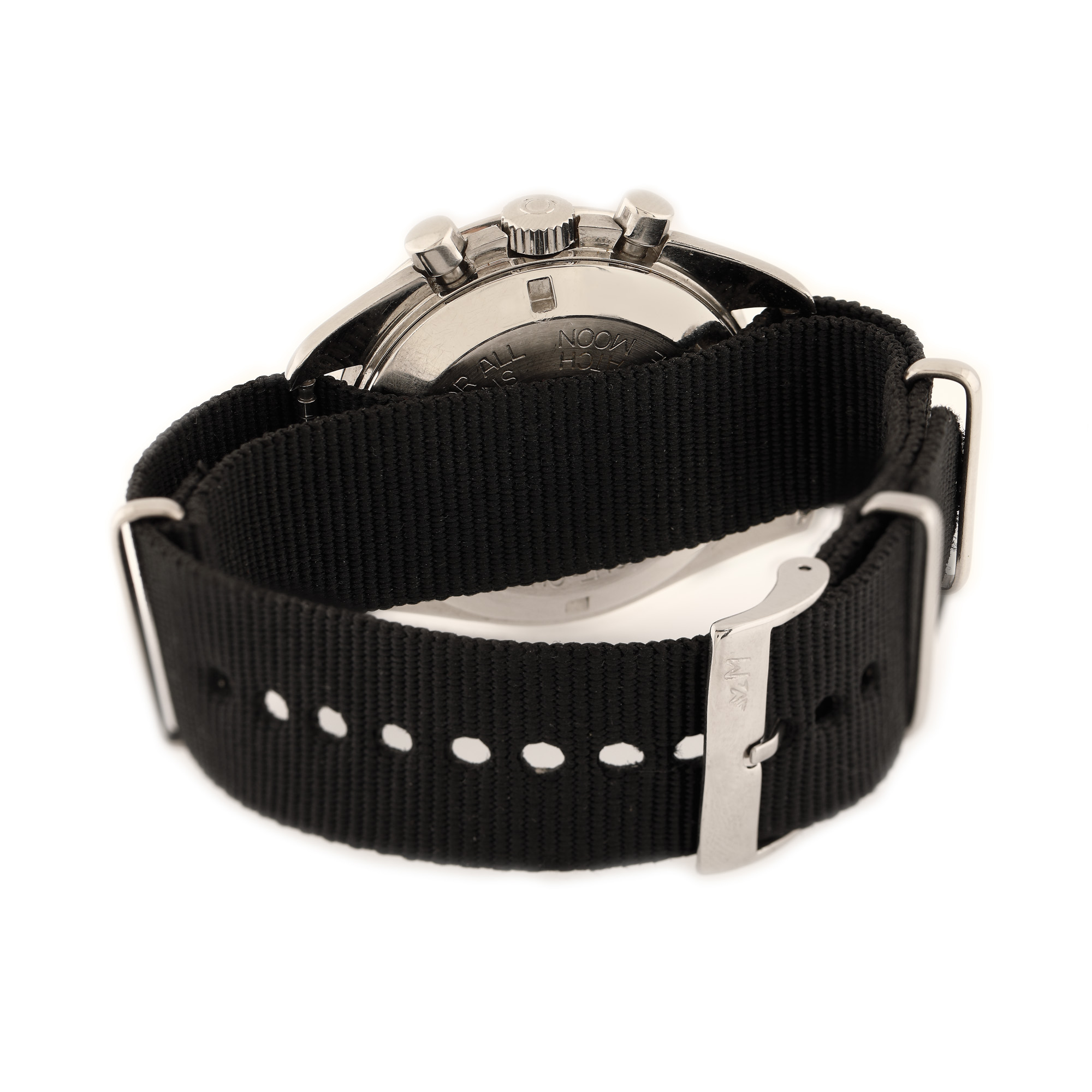 Ceas Omega Speedmaster Professional Moonwatch, de mână, bărbătesc, referință ST 145.022, mecanism cu armare manuală, calibru 861, rezervă de timp 48 h. Cadran de culoare negru, cu indici orari din oțel, cronograf tri-compax și scală tahimetrică. Curea din material textil, de culoare neagră și cataramă din oțel inoxidabil, adăugate aftermarket.