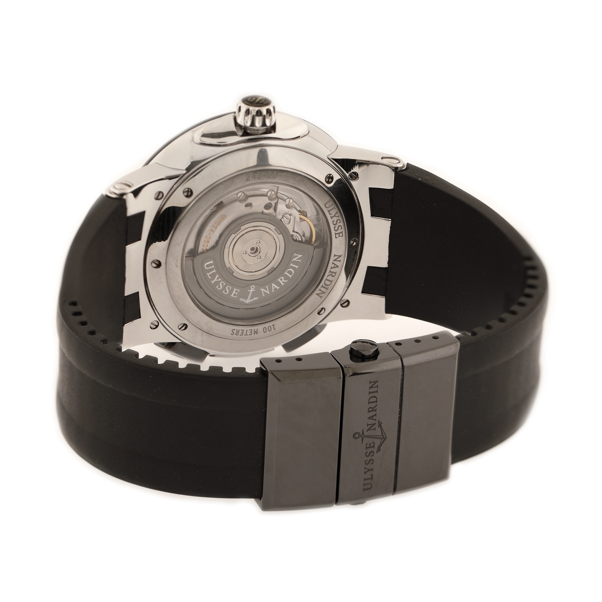 Ceas Ulysse Nardin Executive Dual Time, de mână, bărbătesc, referință 243-00, mecanism automatic, calibru UN-24, rezervă de timp 42 h, anterior vitrat. Cadran alb și gri, cu numerale romane, registru pentru secnde în dreptul orei 6 și registru pentru dată în dreptul orei 2. Curea din cauciuc, de culoare neagră și închizătoare tip deployant, originale.