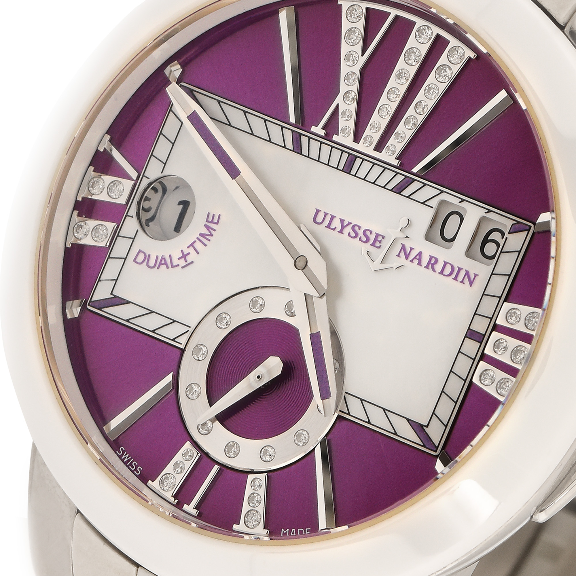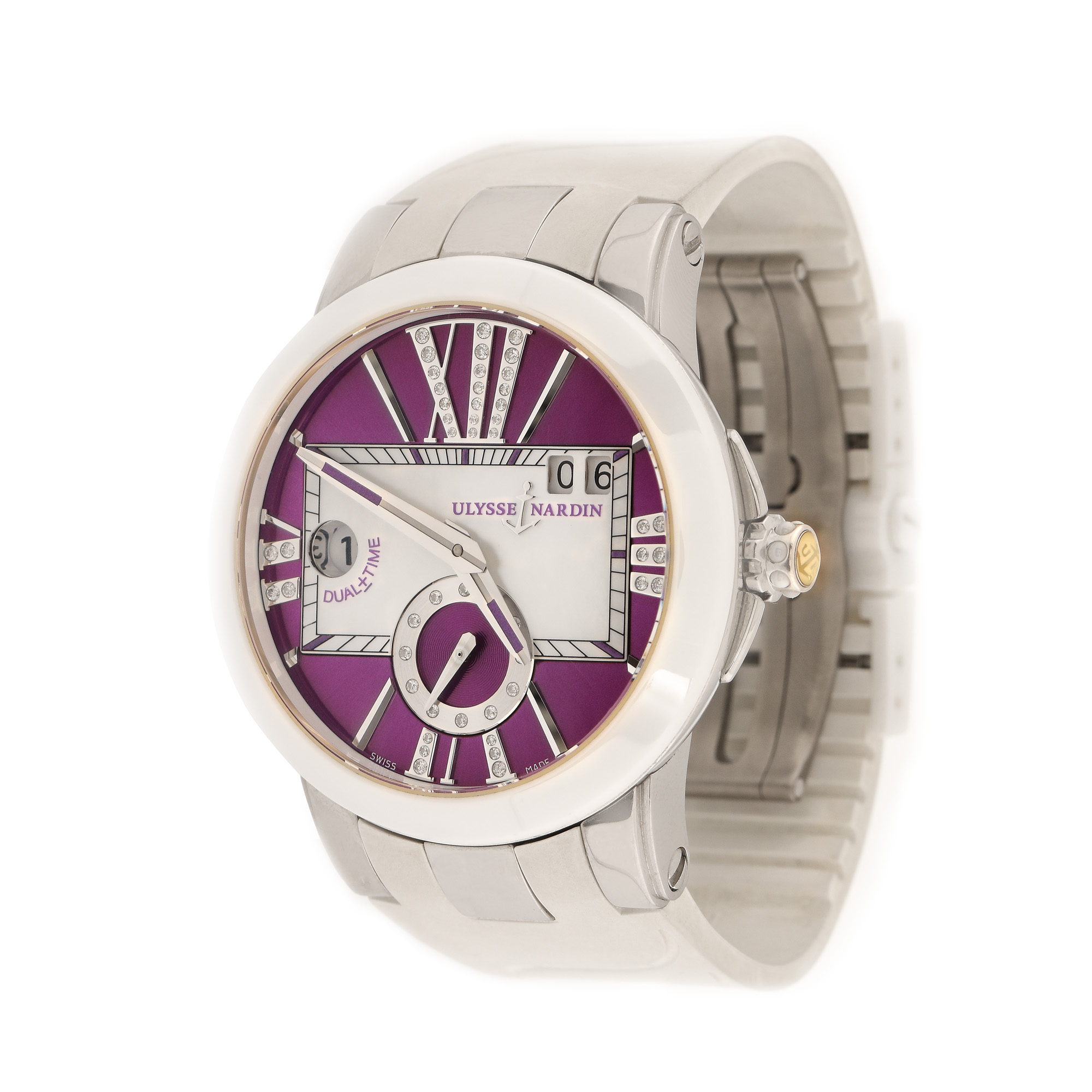 Ceas Ulysse Nardin Executive Dual Time, de mână, de damă, referință 243-10, mecanism automatic, anterior vitrat. Cadran de culoare purpuriu și sidef, numerale romane decorate cu diamante, dată în dreptul orei 2, registru secundar în dreptul orei 6 și un registru pentru al doilea fus orar în dreptul orei 9. Bezel din ceramică și curea din silicon, de culoare albă și sistem de închidere tip deployant, originale.