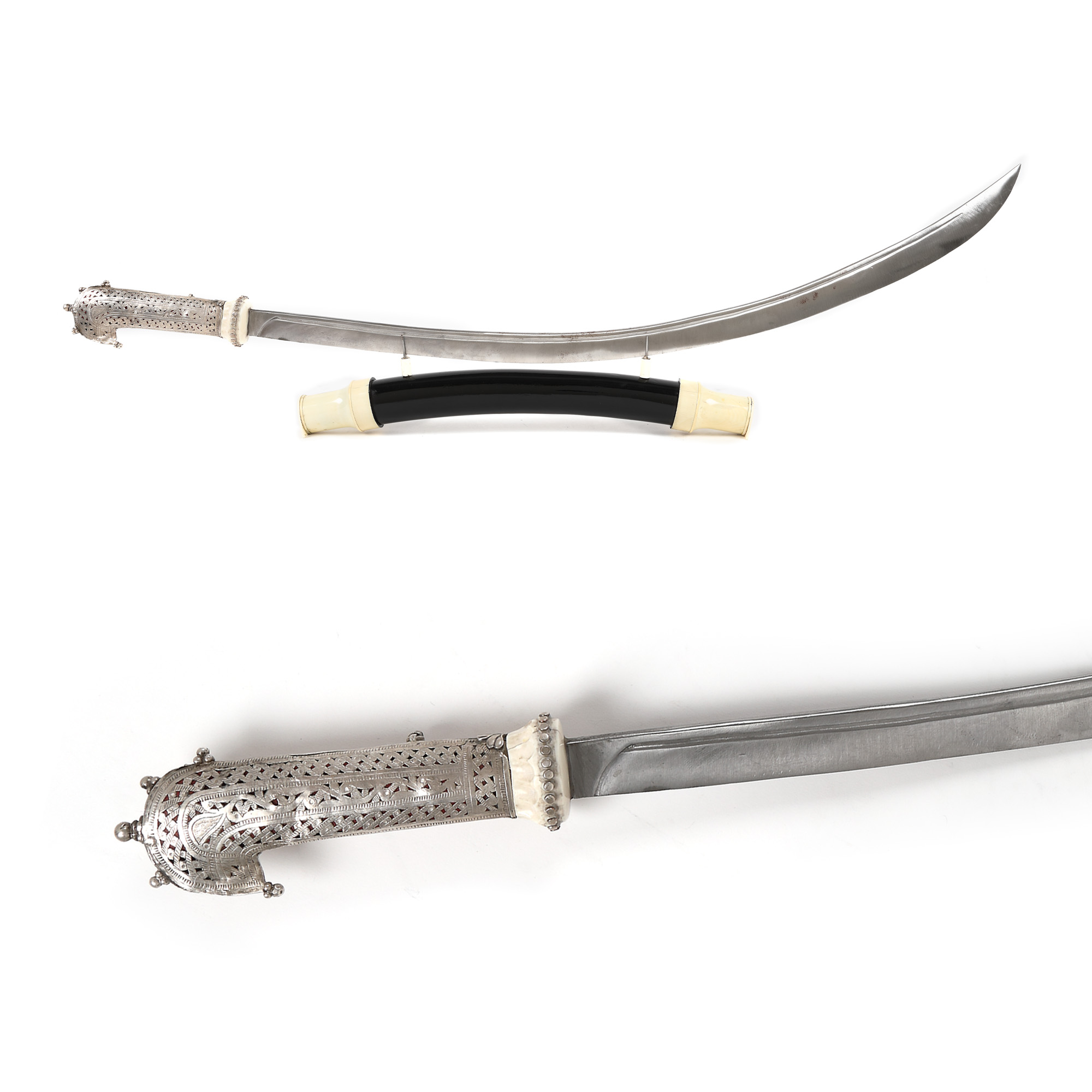 54. Sabie orientală cu mâner din argint și fildeș, însoțită de suport din lemn ebenizat și fildeș