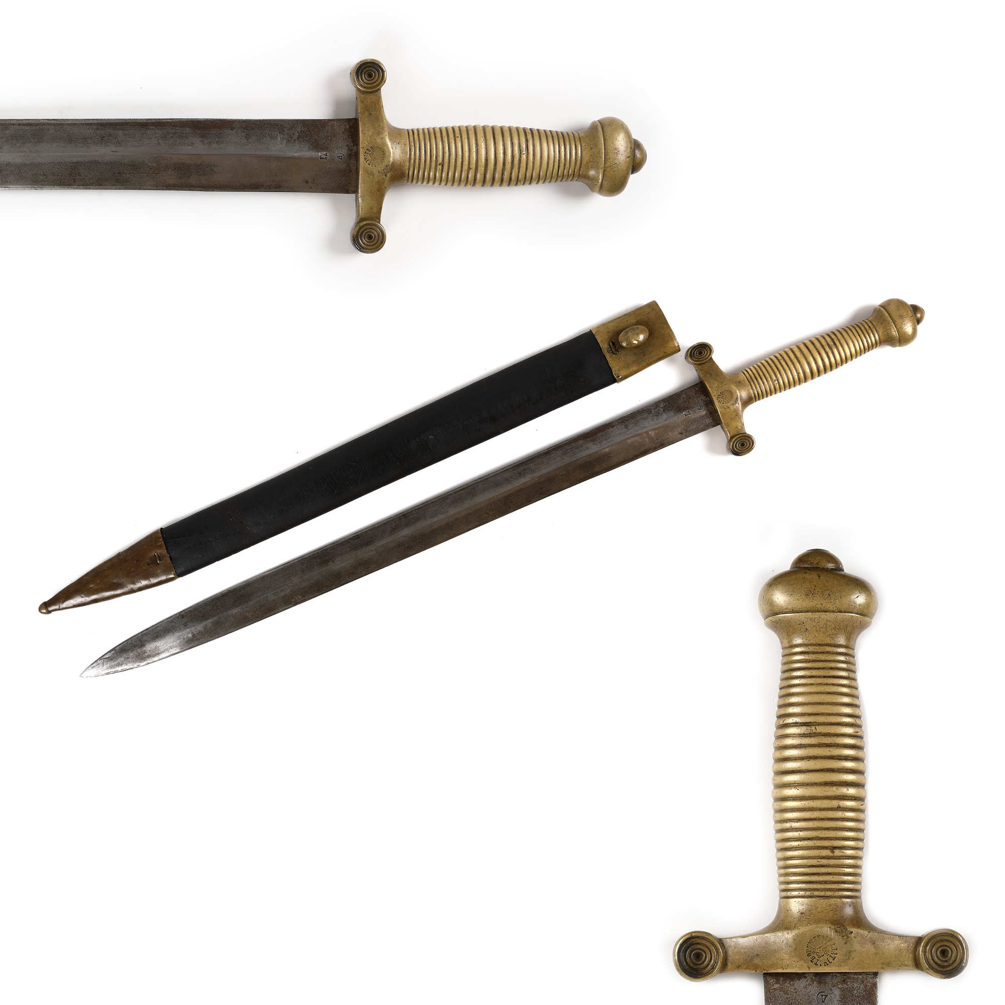 oțel, alamă, piele, lemn