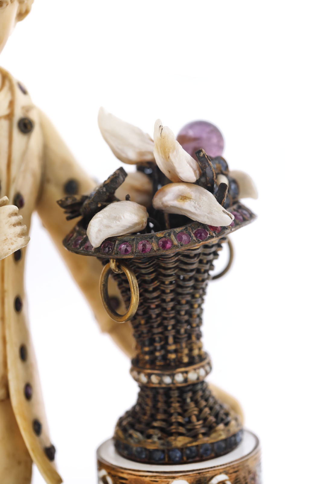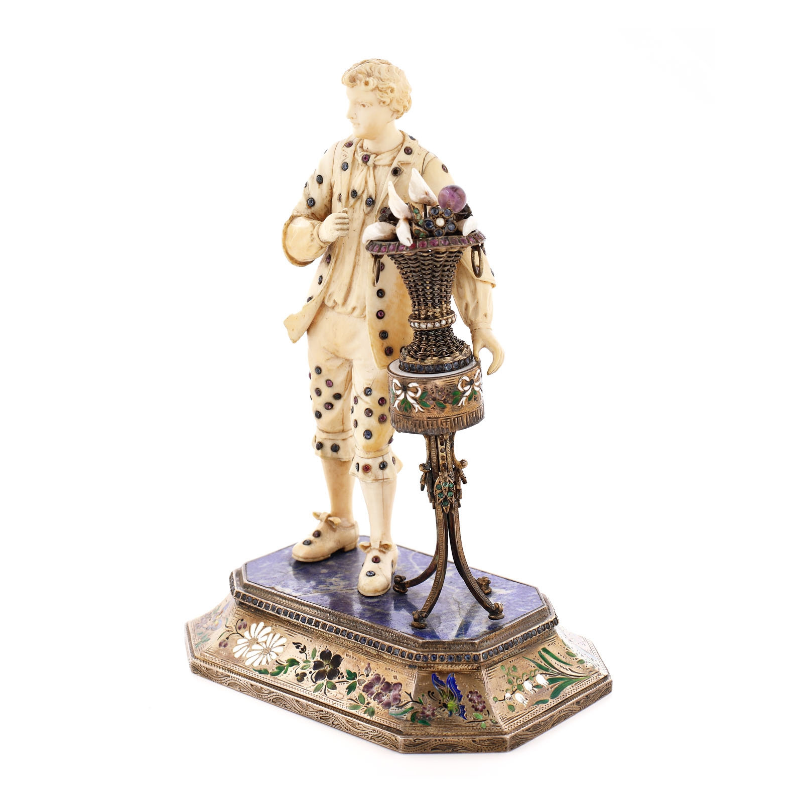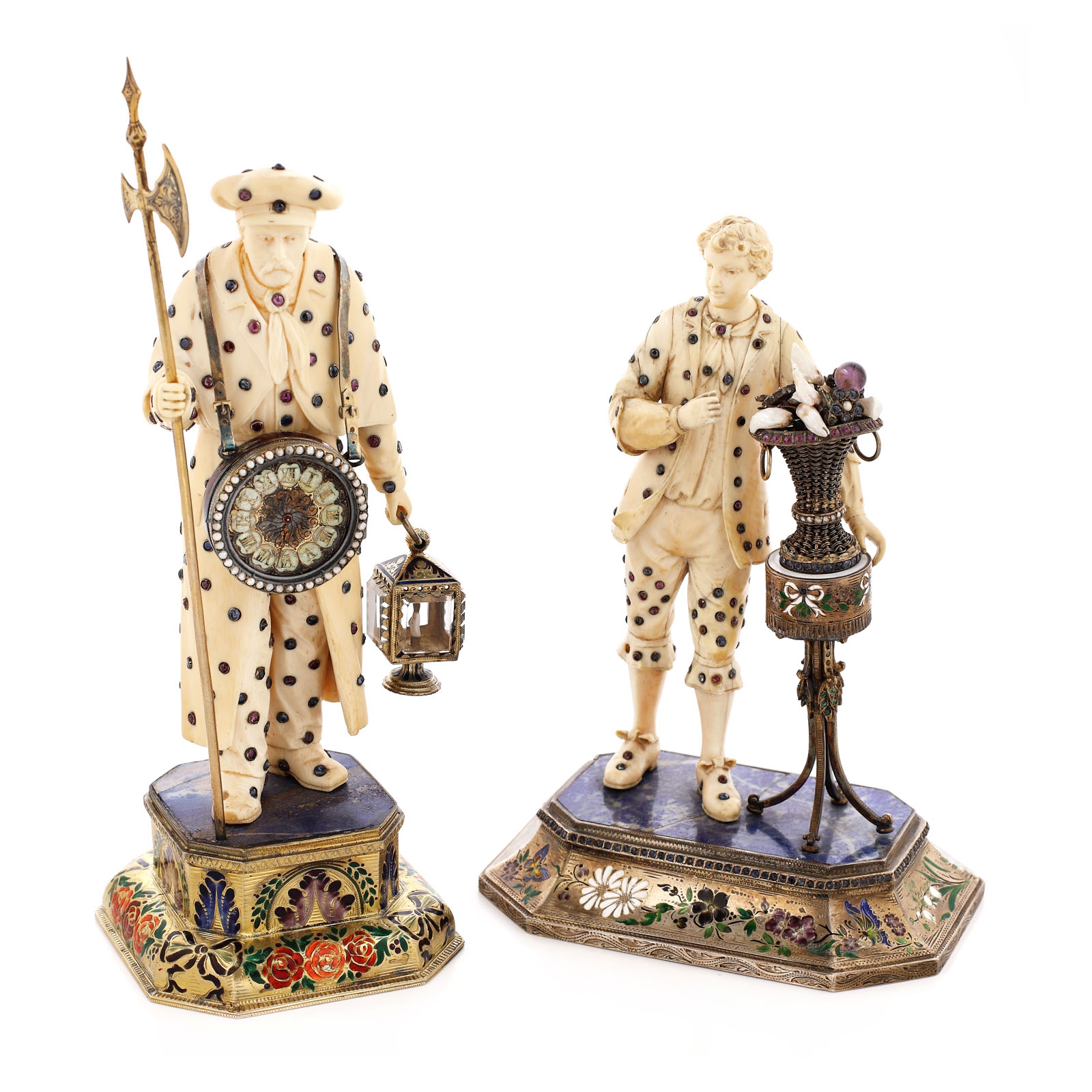 62. Statuete din fildeș, ornate cu safire, rubine, smaralde, ametiste și perle de cultură, sfârșitul sec. XIX, piese de colecție