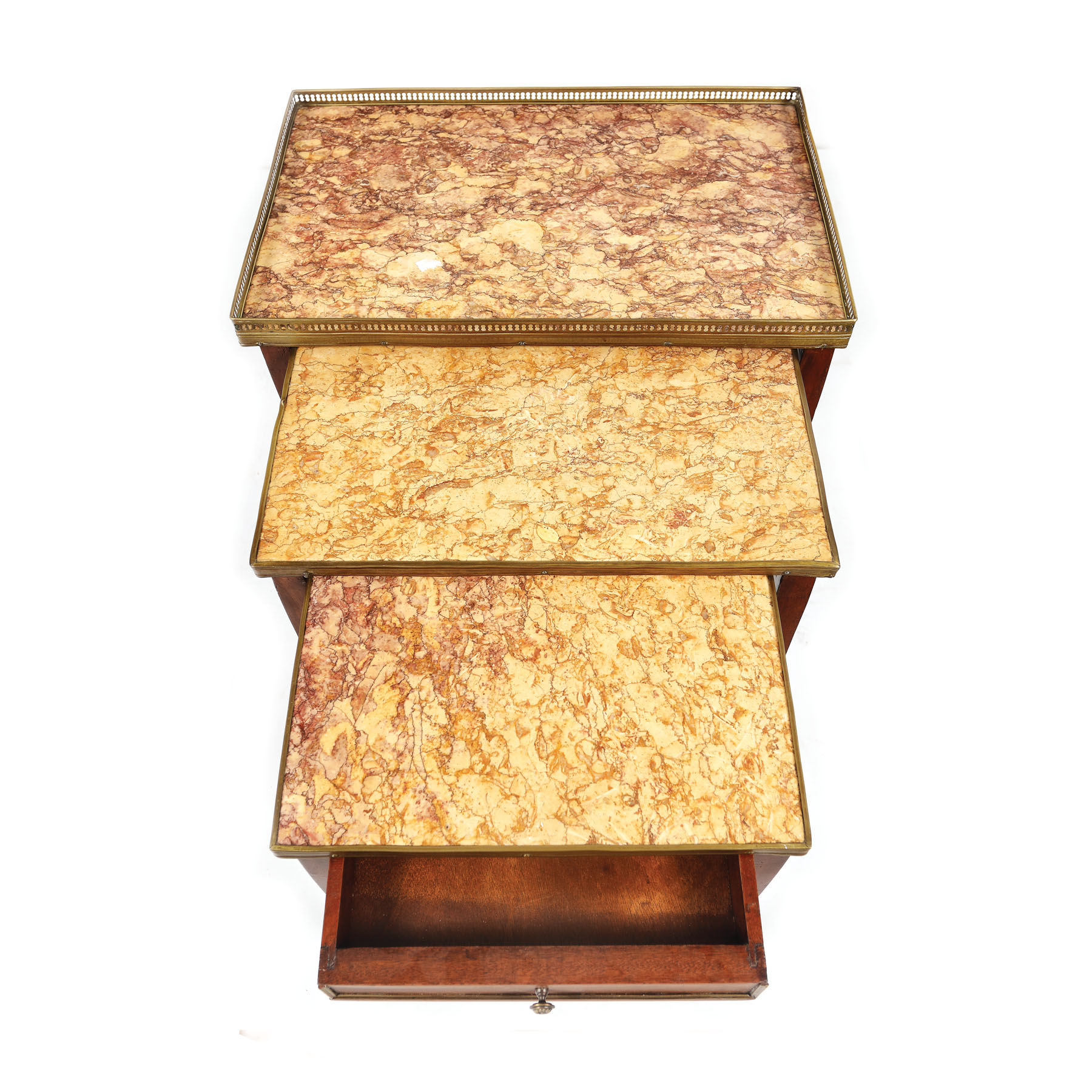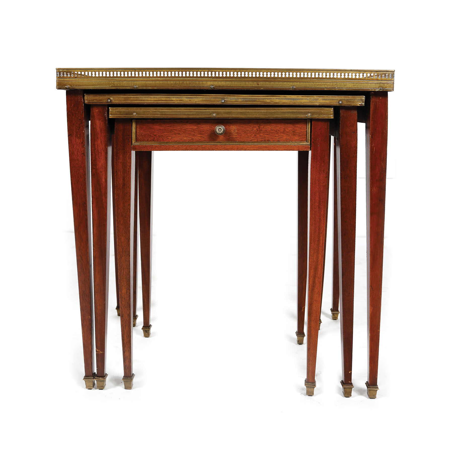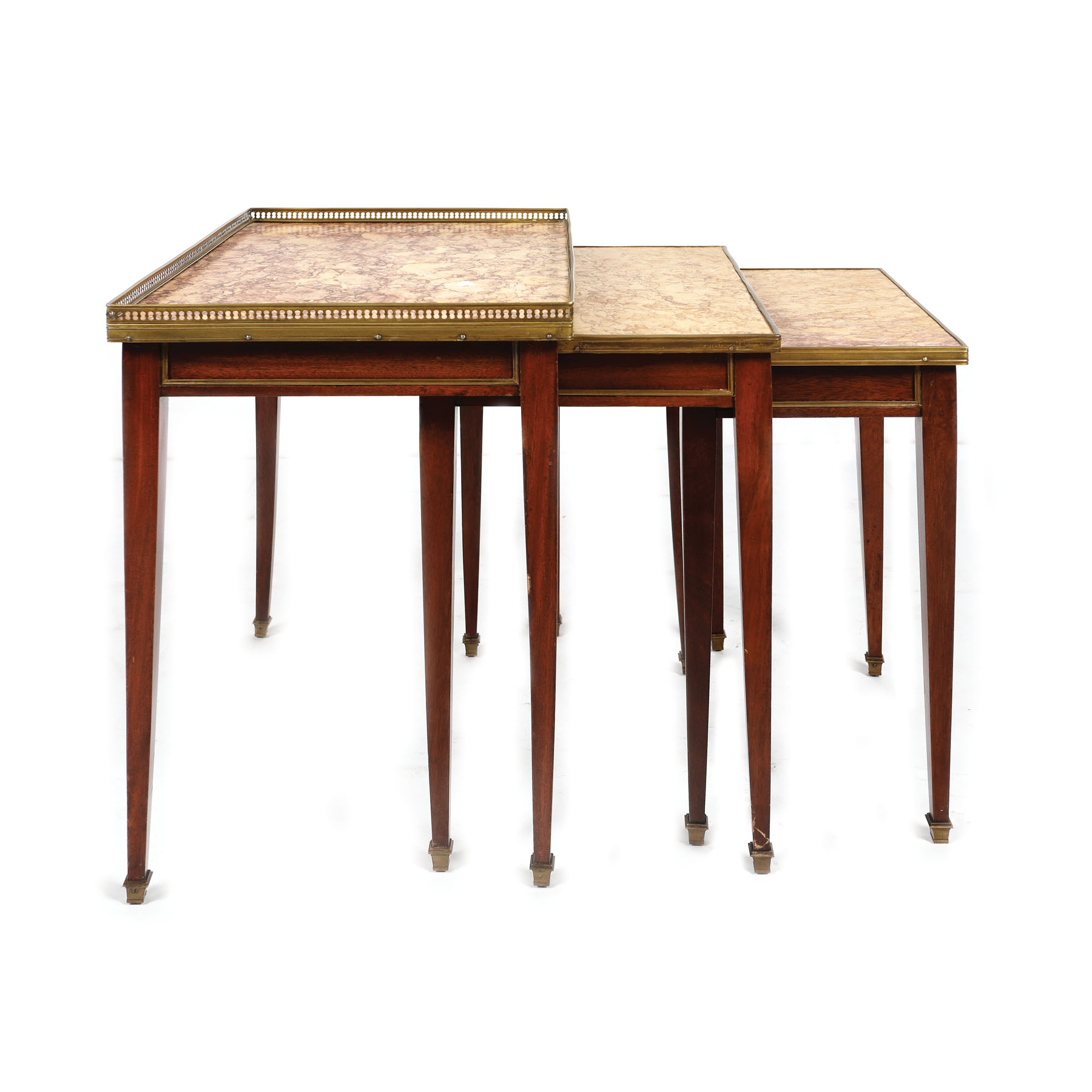 Set de trei măsuțe pentru cafea, tip gigognes, în stil Neo-Louis XVI, cu blaturile din marmură, cu bordură grilajată.