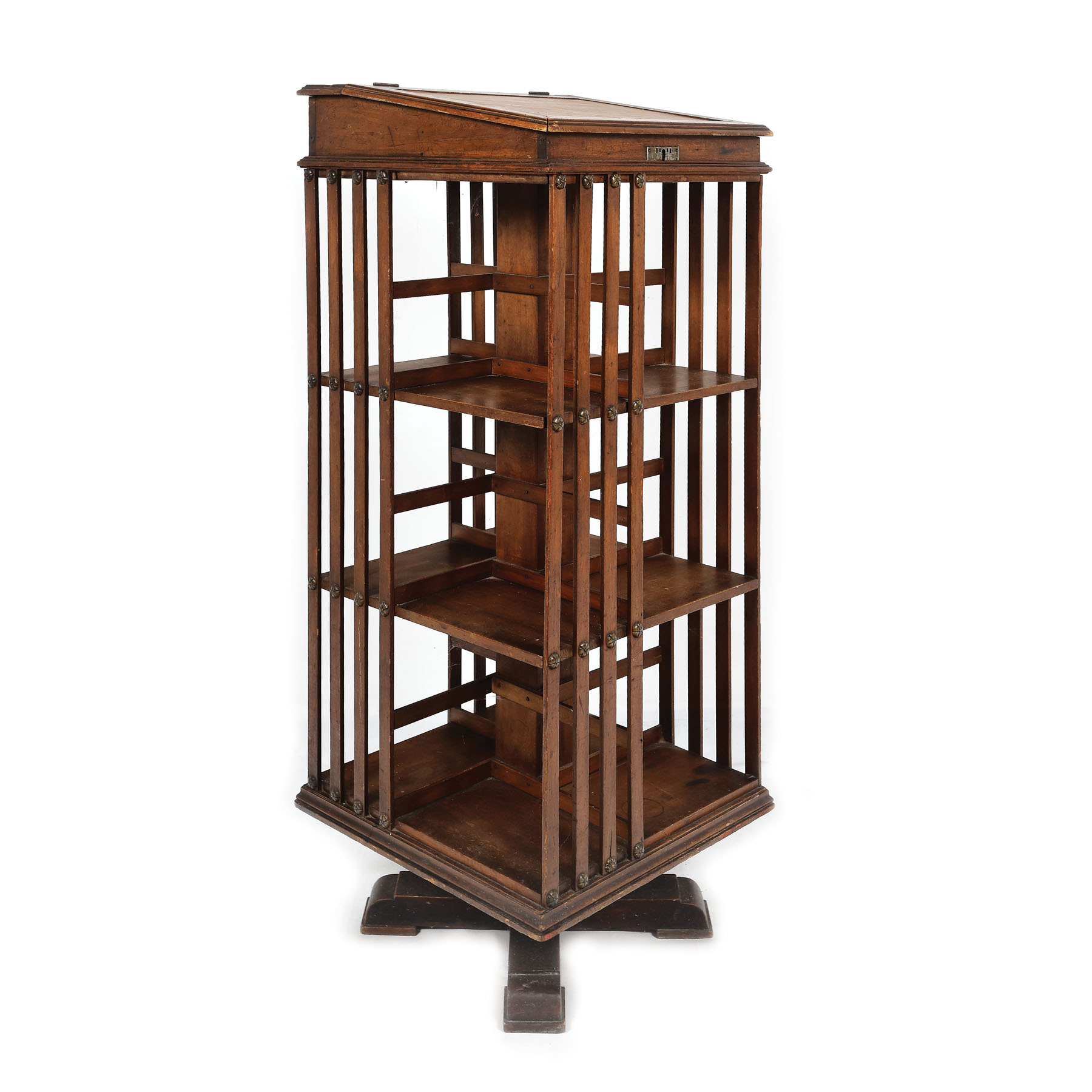Bibliotecă rotativă pe picior în cruce, cu trei etajere unite prin câte patru baghete pe fiecare latură și pupitru cu capac rabatabil, blat din piele și casetă interioară.