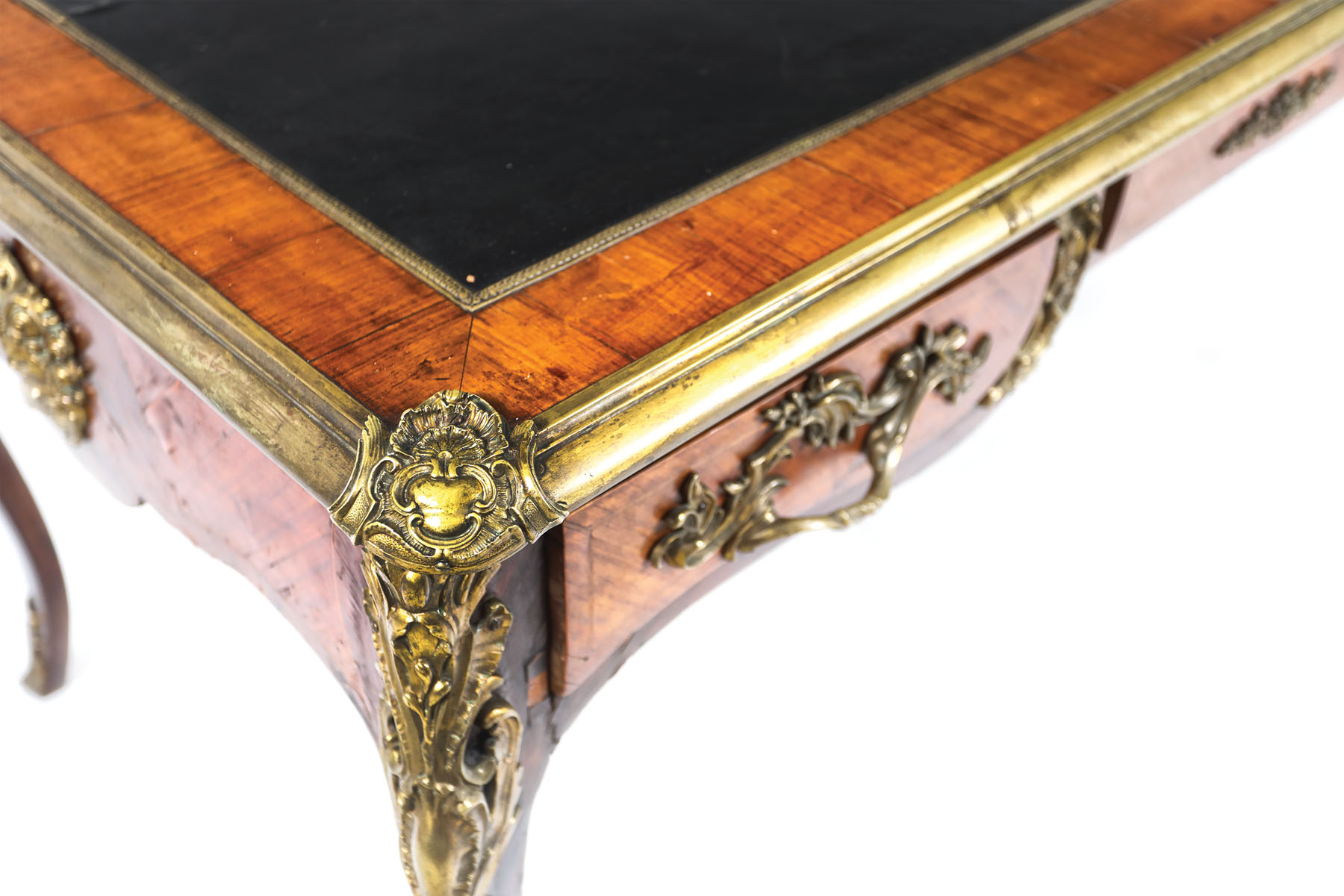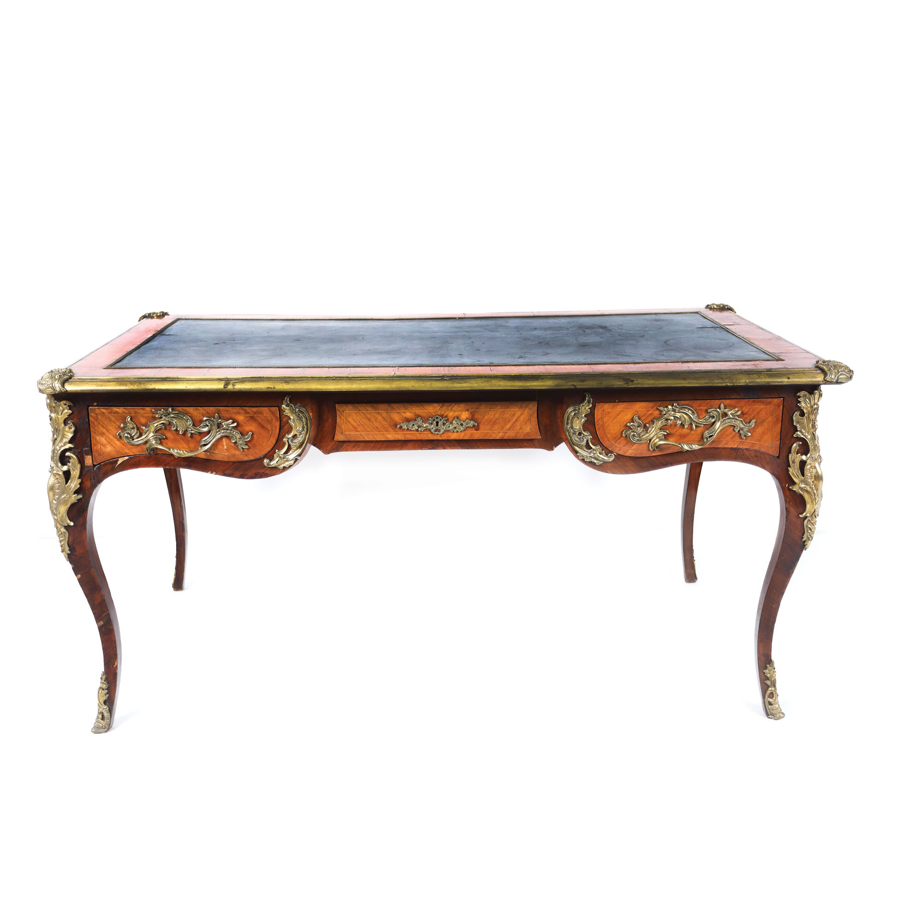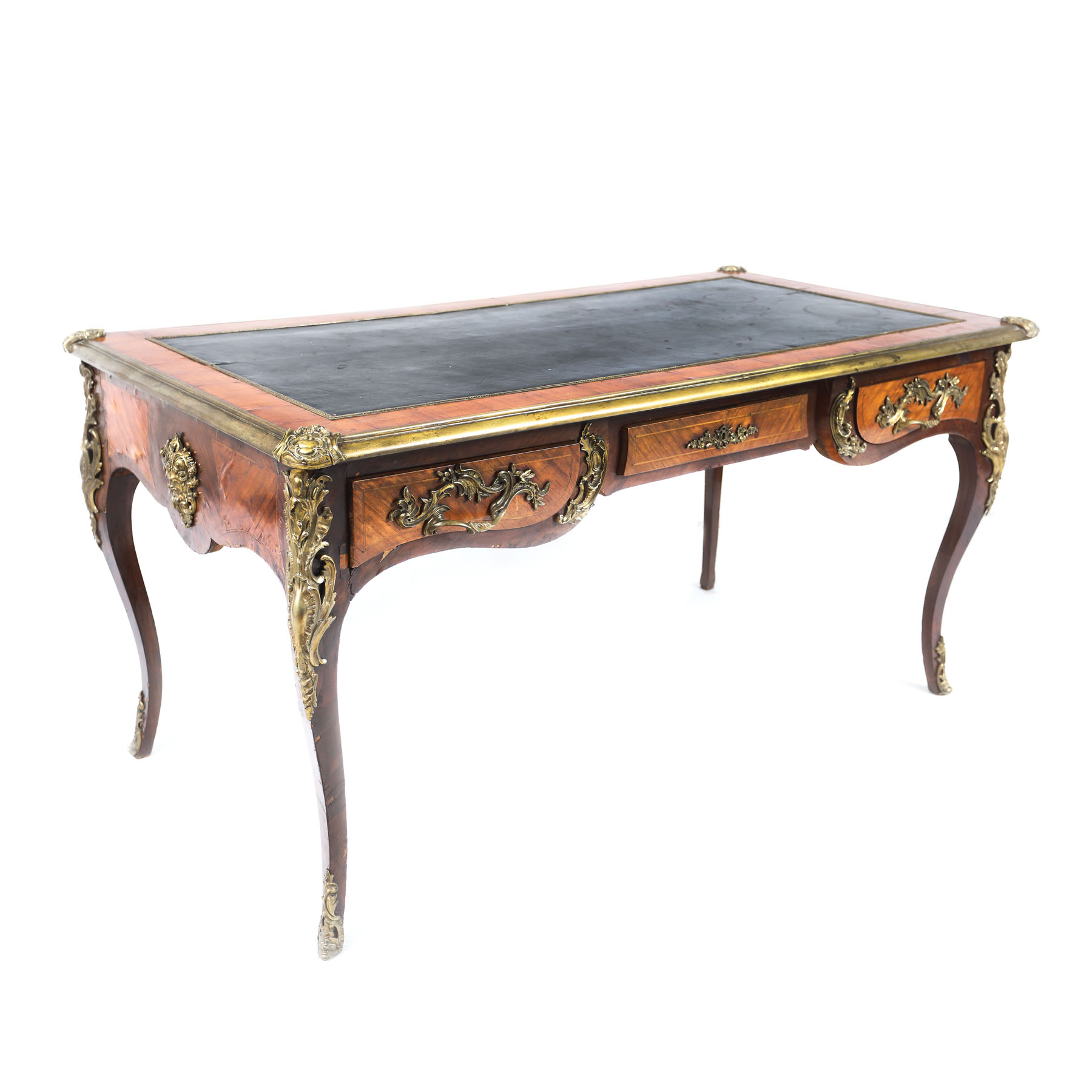 Birou cu picioare galbate, blat dreptunghiular cu panou îmbrăcat în piele și borduri cu ornamente Rocaille din bronz la colțuri. Centură cu câte trei sertare pe două laturi - en arbalette, cu mânere din bronz (vrej vegetal); la picioare, saboți metalici și frunză de acant; laturile înguste - festonate la bază cu motiv espagnolette din bronz.