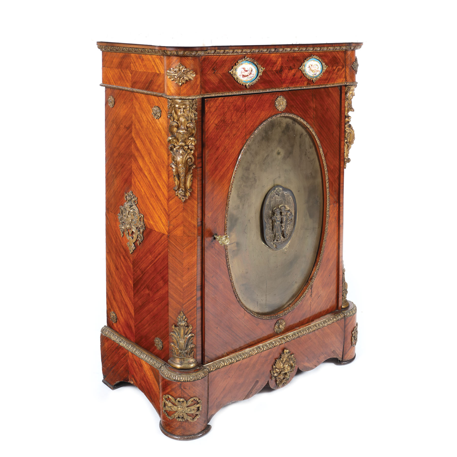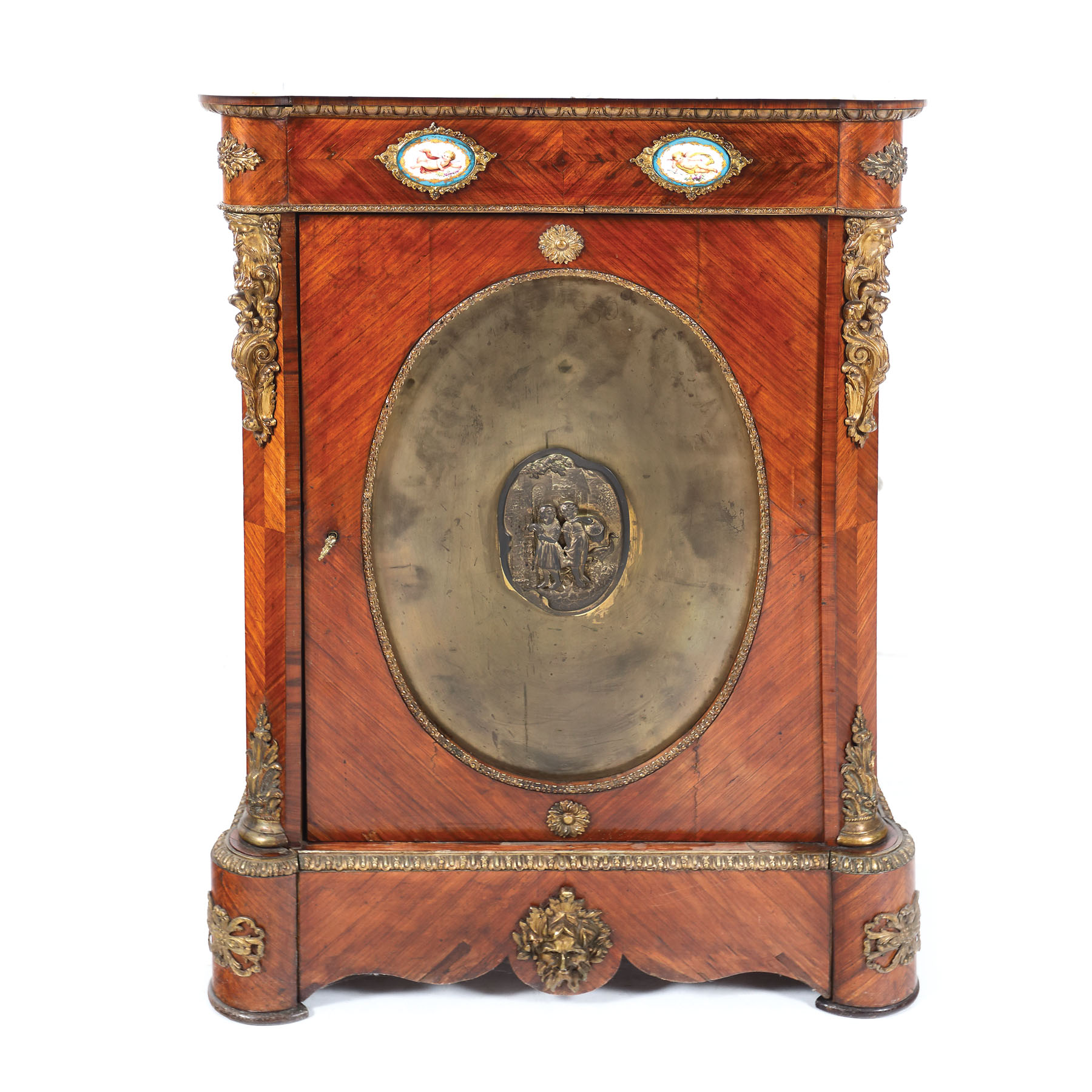 Cabinet paralelipipedic, cu postament lat, sprijinit pe sfere aplatizate. Blat dreptunghiular cu placă de marmură, centură cu ornamente din bronz și două medalioane din porțelan pictat cu putti în lambrechin vegetal. O usă cu medalion din alamă și ornament reliefat - scenă de basm cu pereche de copii și gâscă. Montanți decorați cu motive portret de bătrân cu barbă. Panouri laterale cu ornamente din bronz.