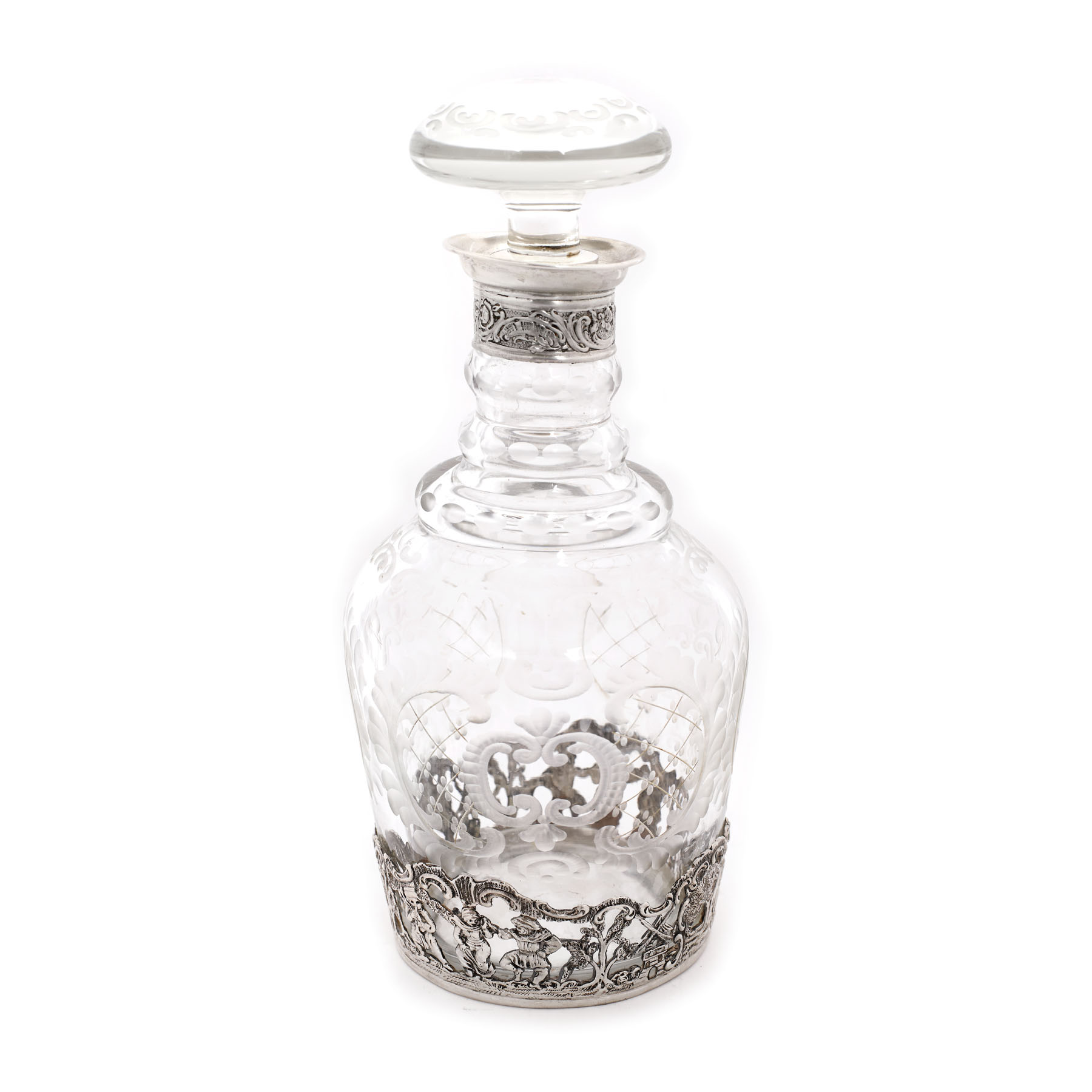 243. Carafă din sticlă, cu montură din argint, de inspirație Rococo, ilustrând sărbători câmpenești