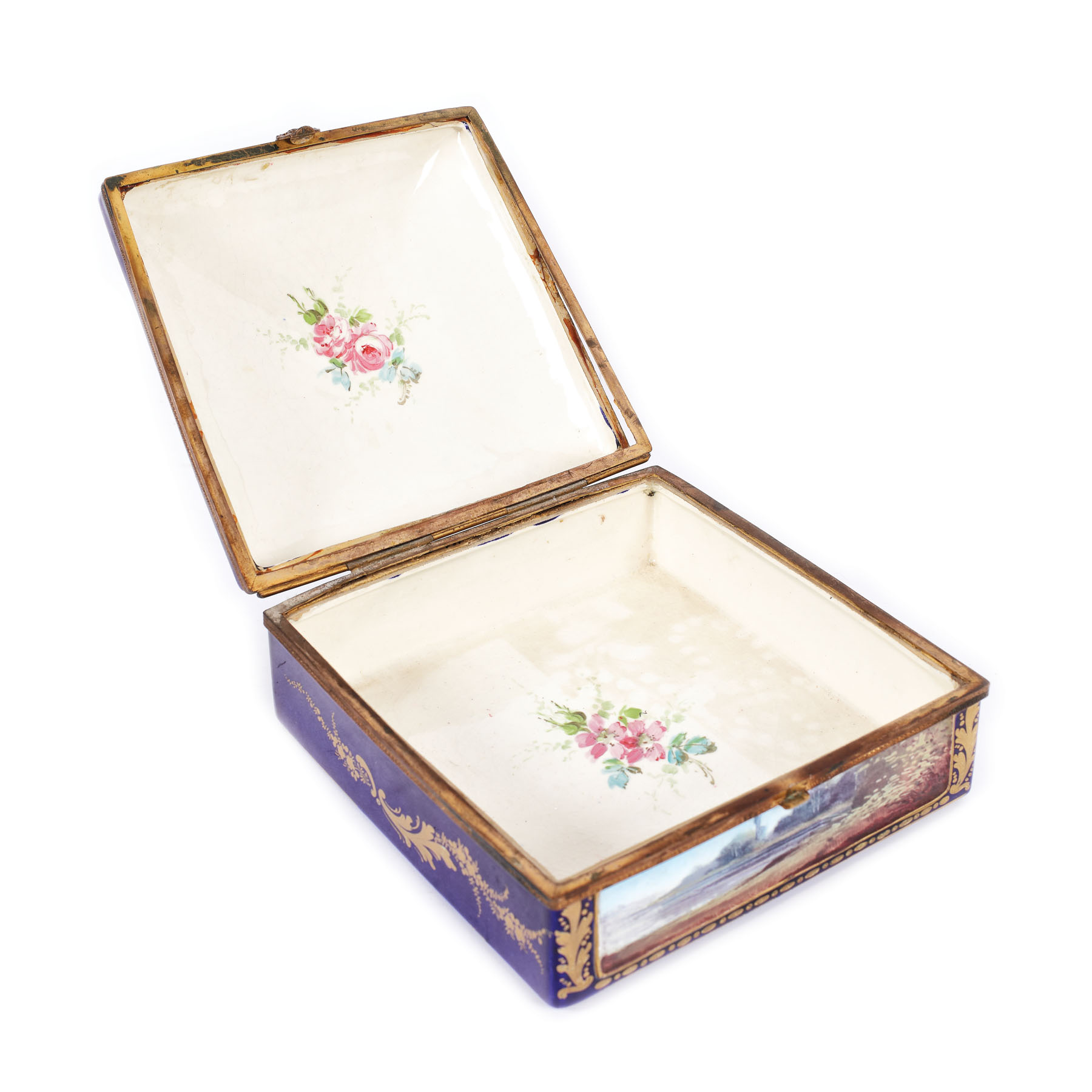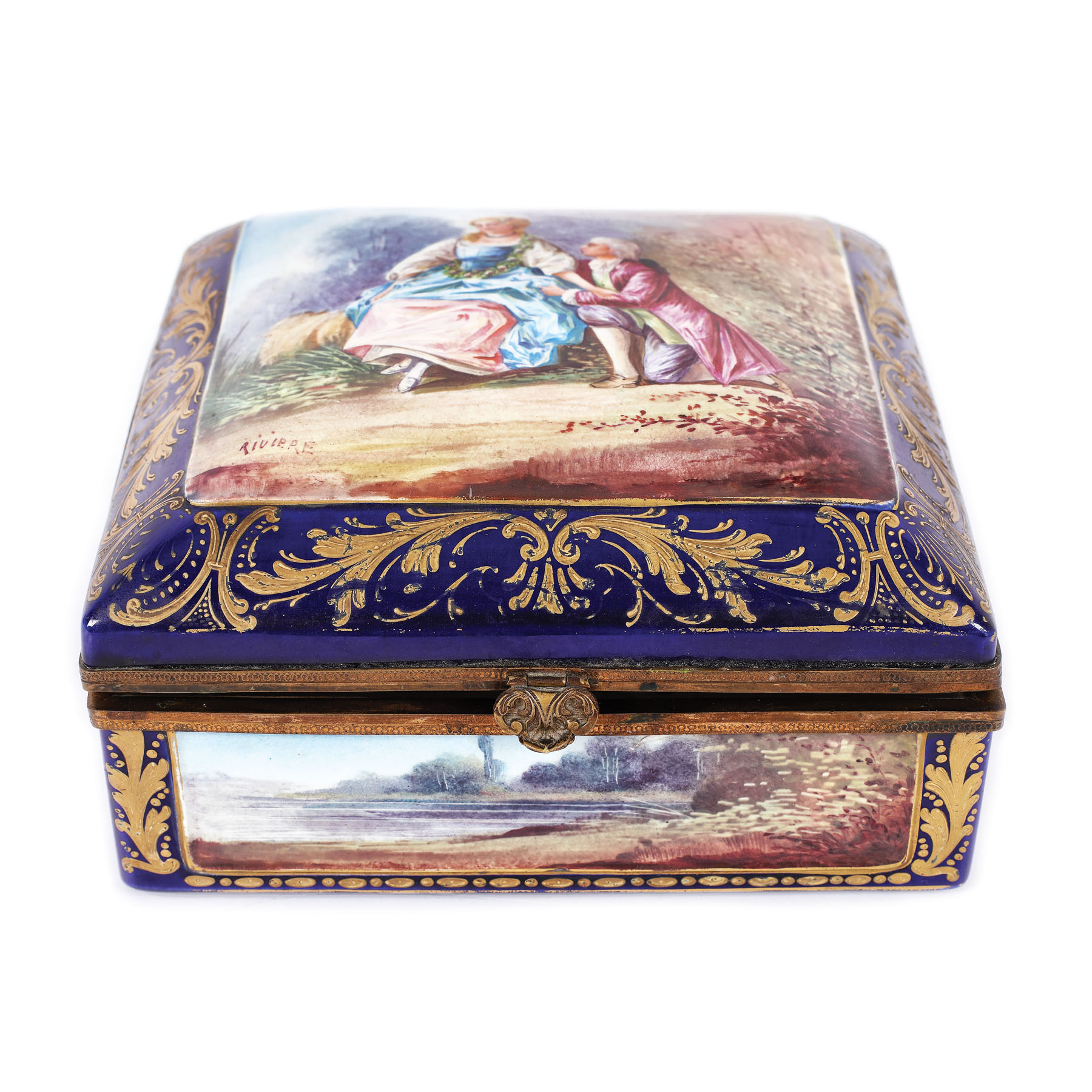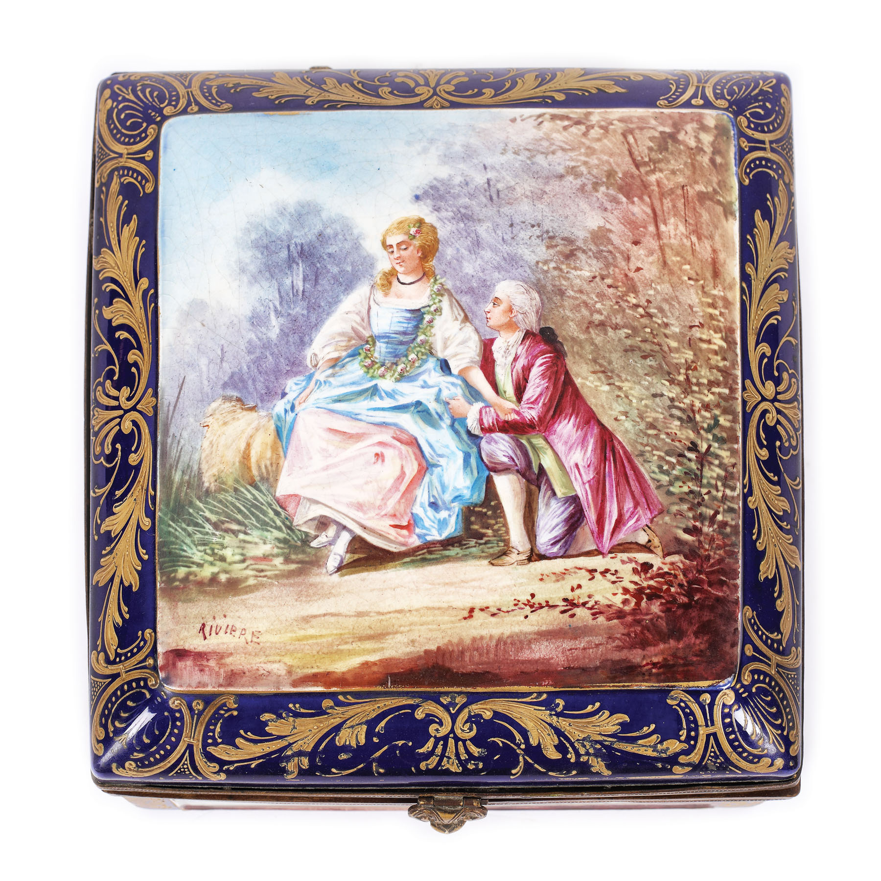 195. Casetă din porțelan Sèvres, pentru bijuterii, pictată cu scenă galantă, sfârșitul sec. XIX