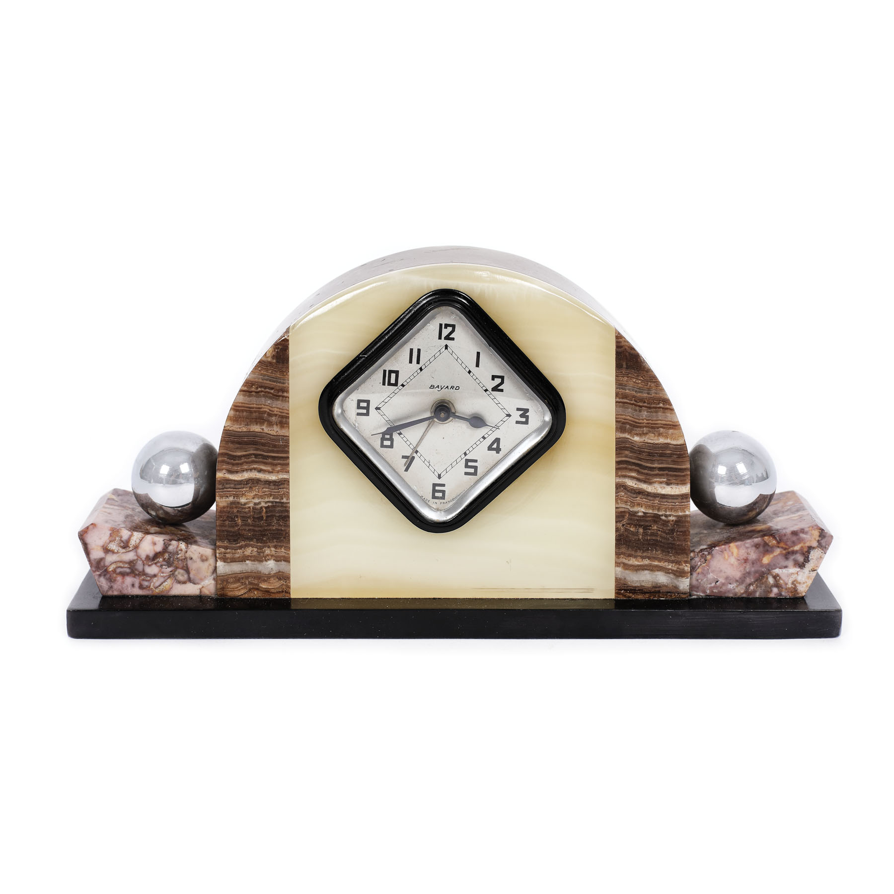 206. Ceas Art Deco, din bronz cromat, onix și marmură ”fleur de pêcher”, cca. 1930
