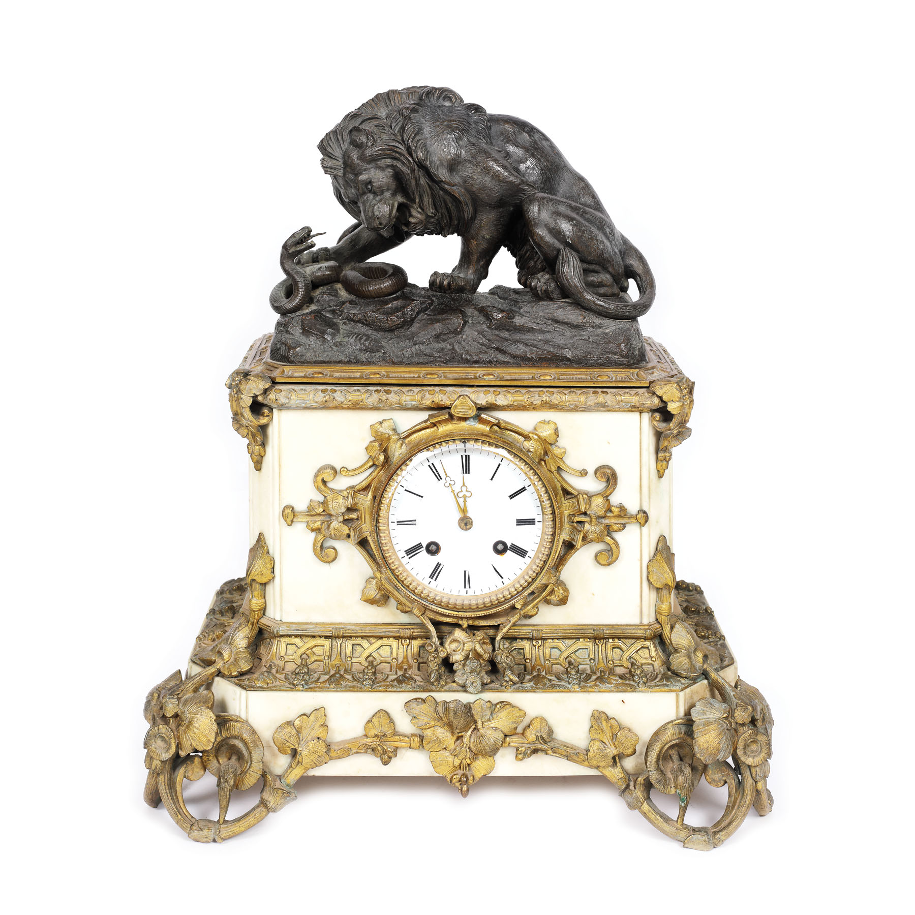207. Ceas în manieră Empire, sculptură din bronz după Antoine Louis Barye, pentru șemineu, sfârșitul sec. XIX