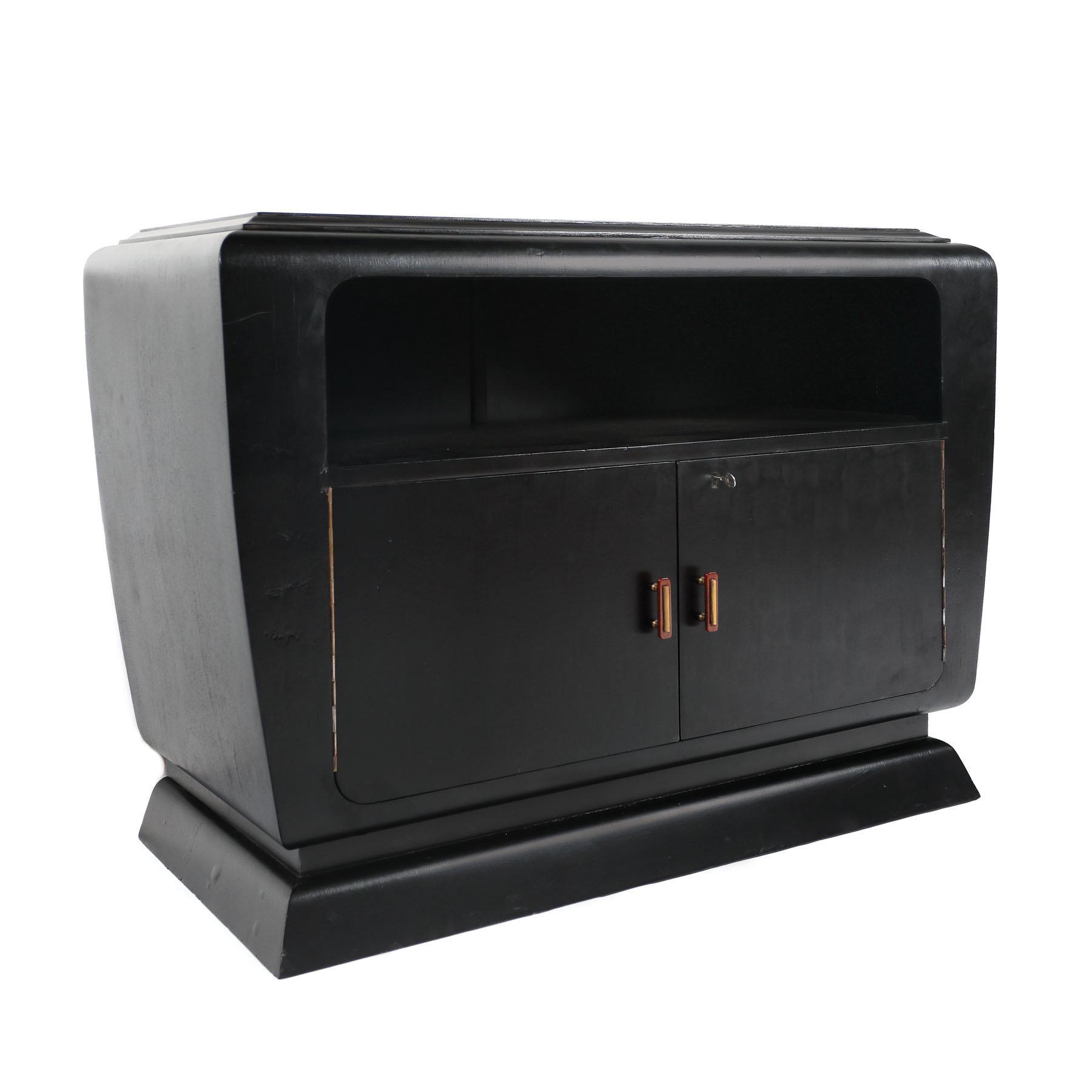 Comodă-servantă, de sufragerie, în stil Art Deco, cu bază masivă, dulap închis cu două uși și etajeră. Blat dreptunghiular.