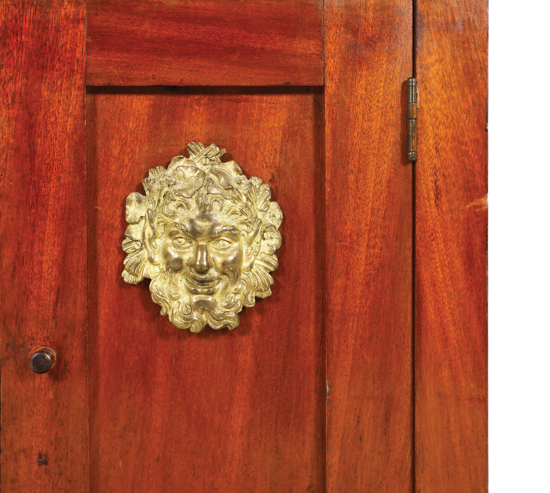 141. Comodă din lemn de nuc, cu ornamentații în forma unor capete de satiri, începutul sec. XX