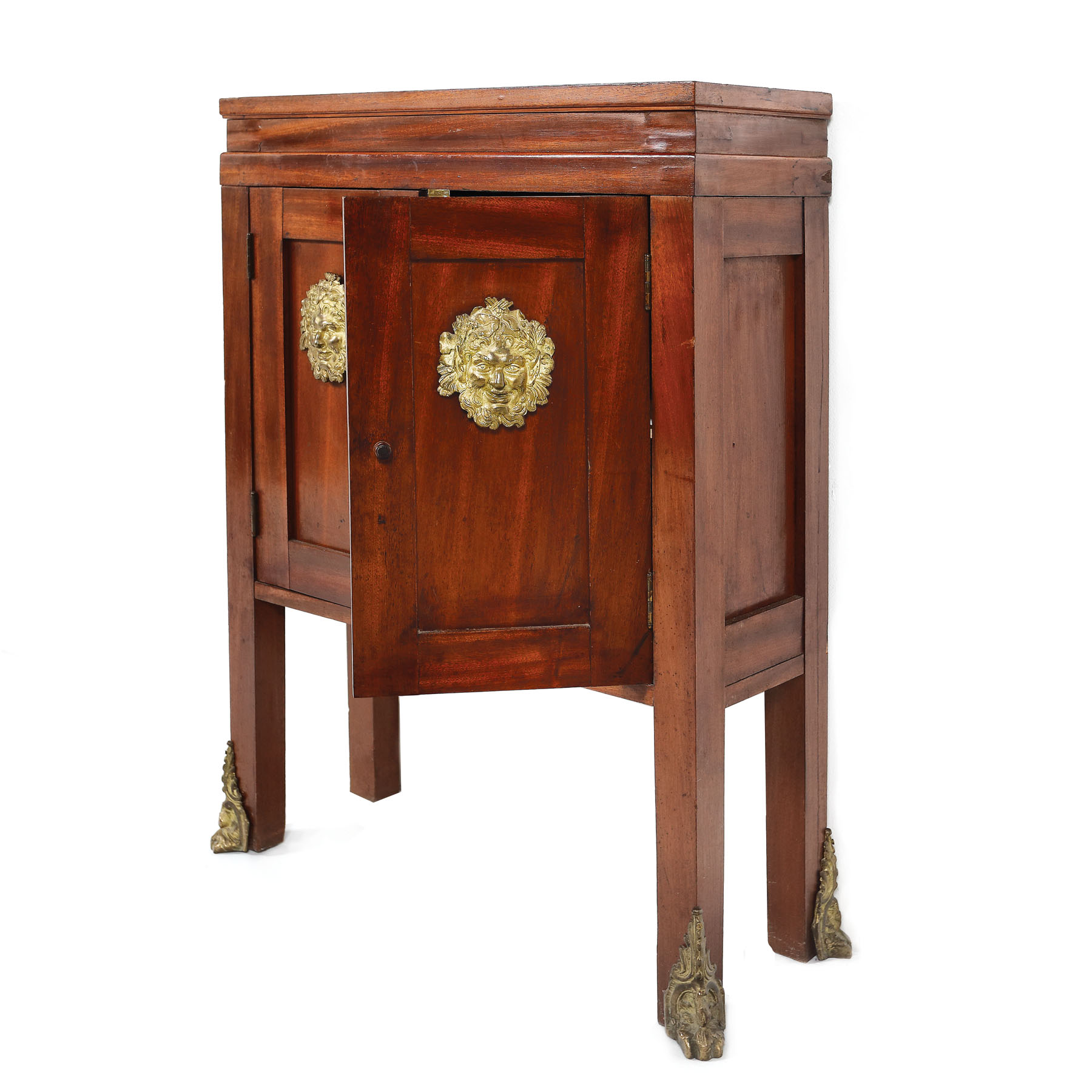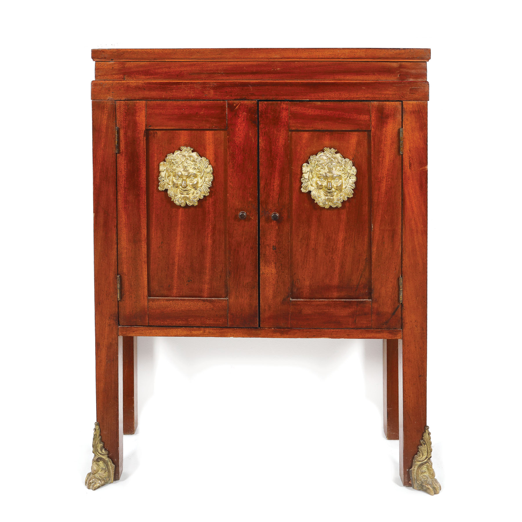 Picioare drepte cu saboți metalici, dulăpior mic, cu două uși, decorate cu ornamente satiri din bronz aurit, blat dreptunghiular.