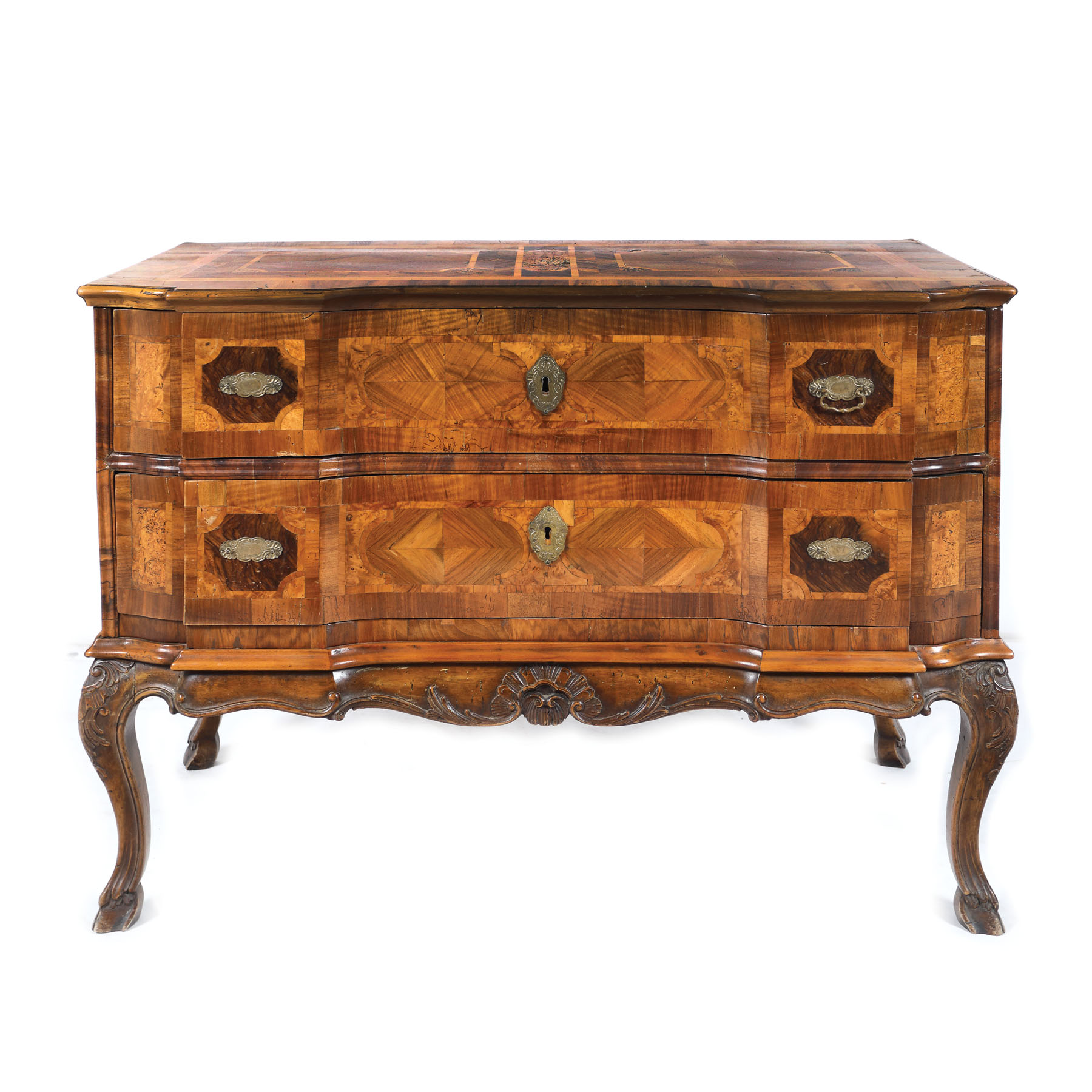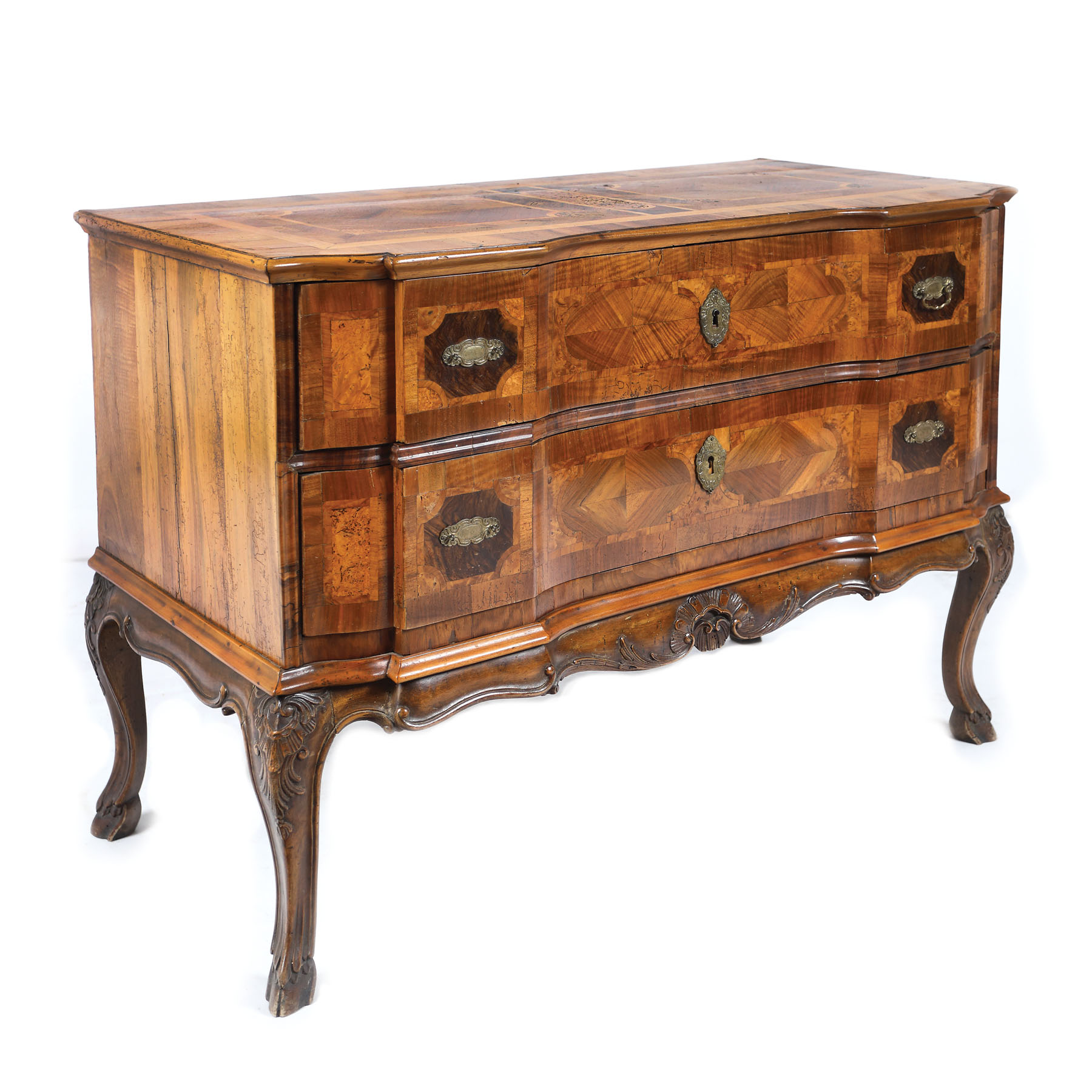 Comodă mare, în stil eclectic, cu elemente de Baroc austriac, cu două sertare mari, profilate, cu centură decorată cu motiv Rocaille și picioare terminate în pied-de-biche. Suprafața prezintă ușoară degradare și lipsesc elemente din serurerie.
