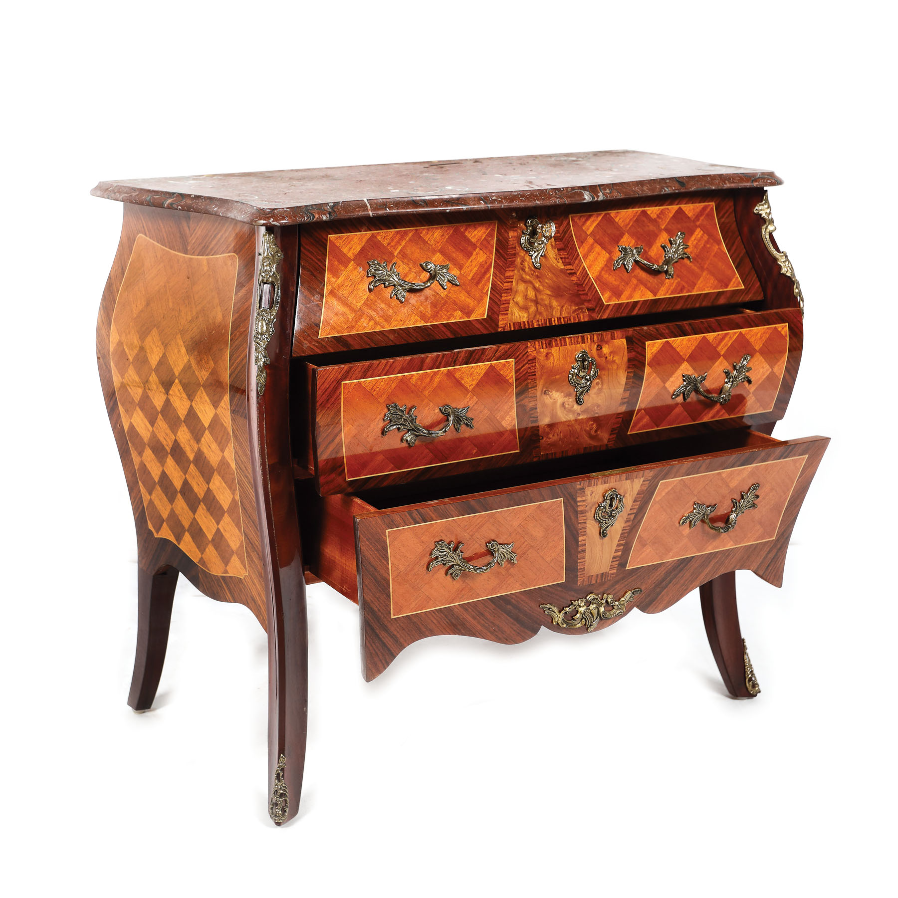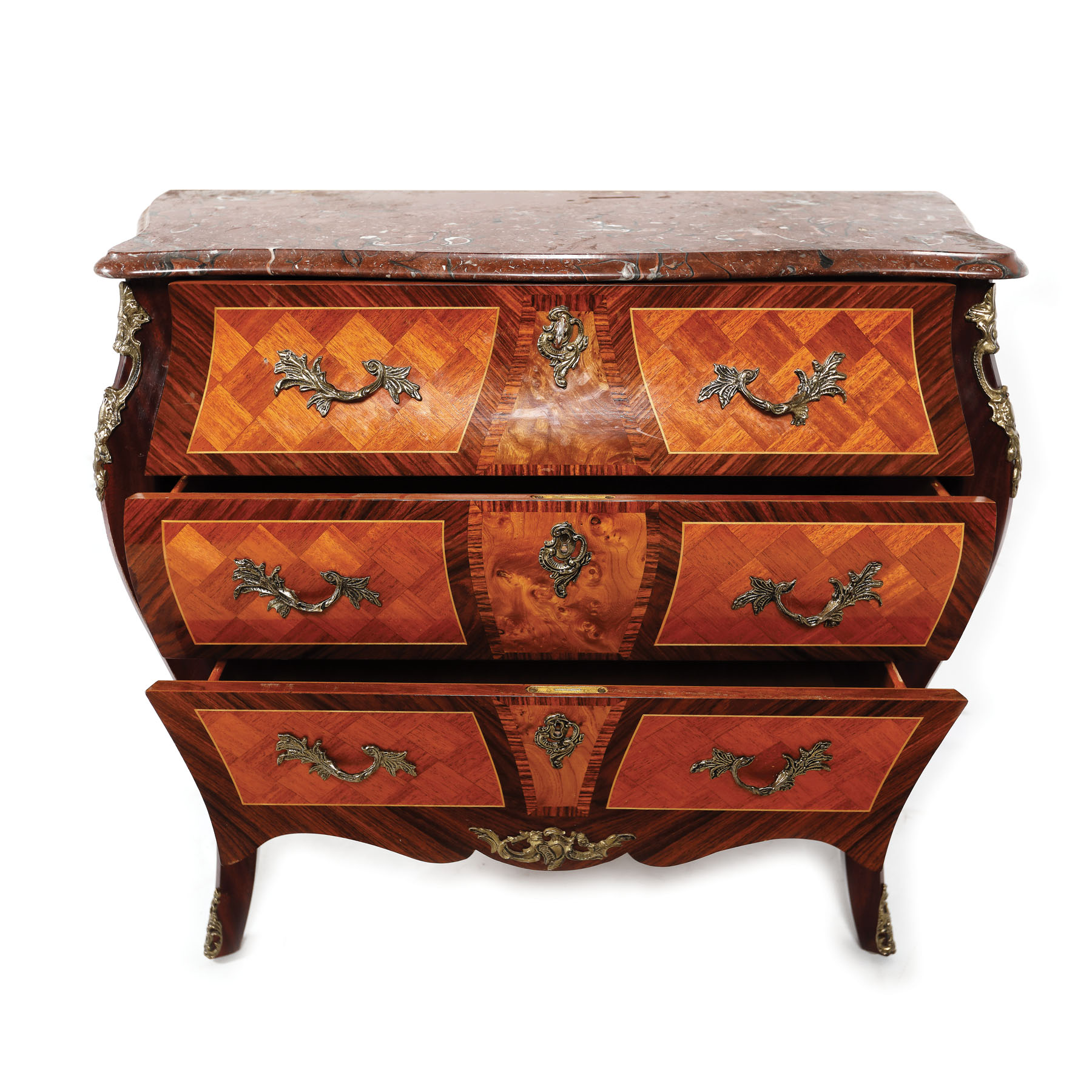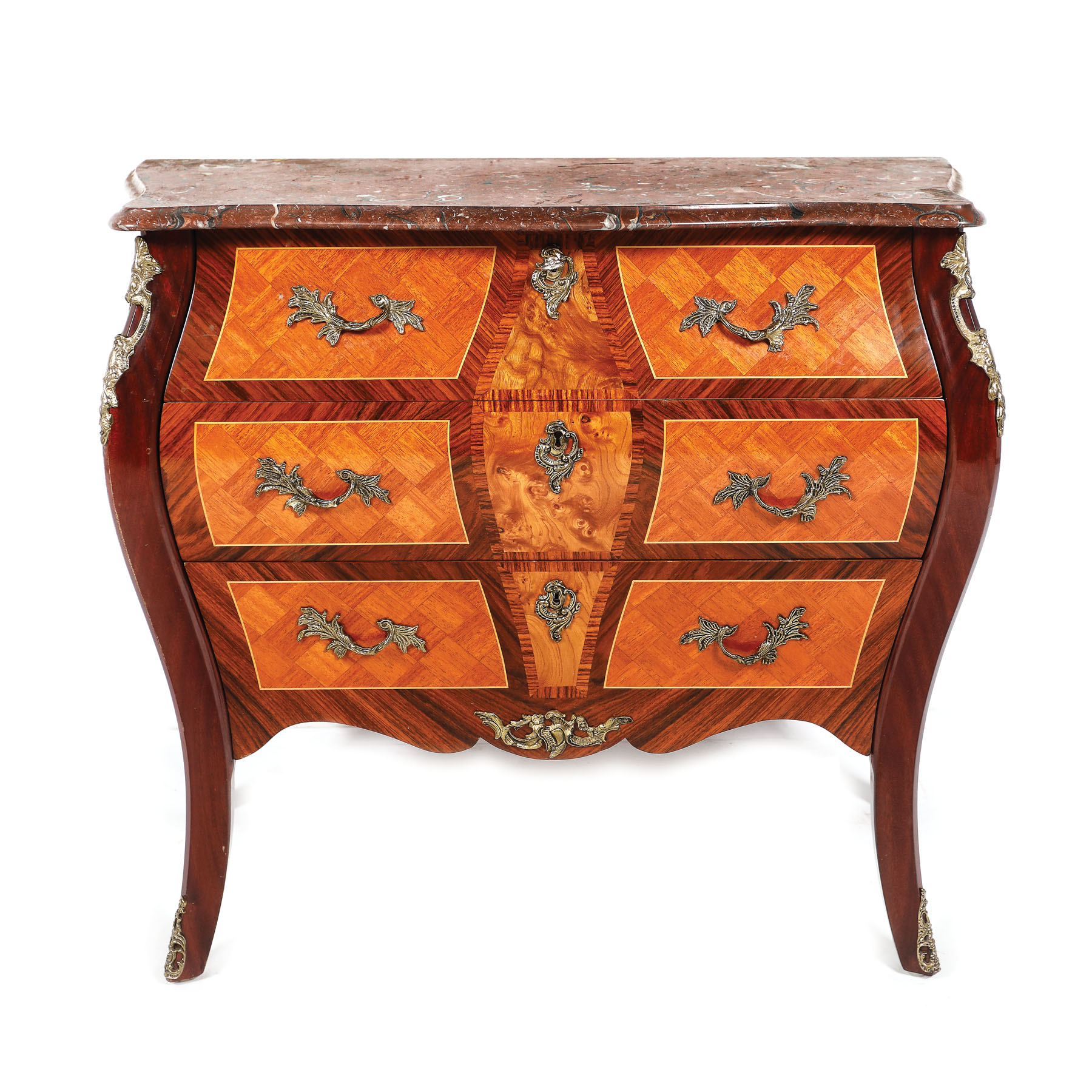 Comodă mică în manieră Louis XV, cu tei sertare mari, cu decor parchetat și serurerie cu model vegetal, din bronz.