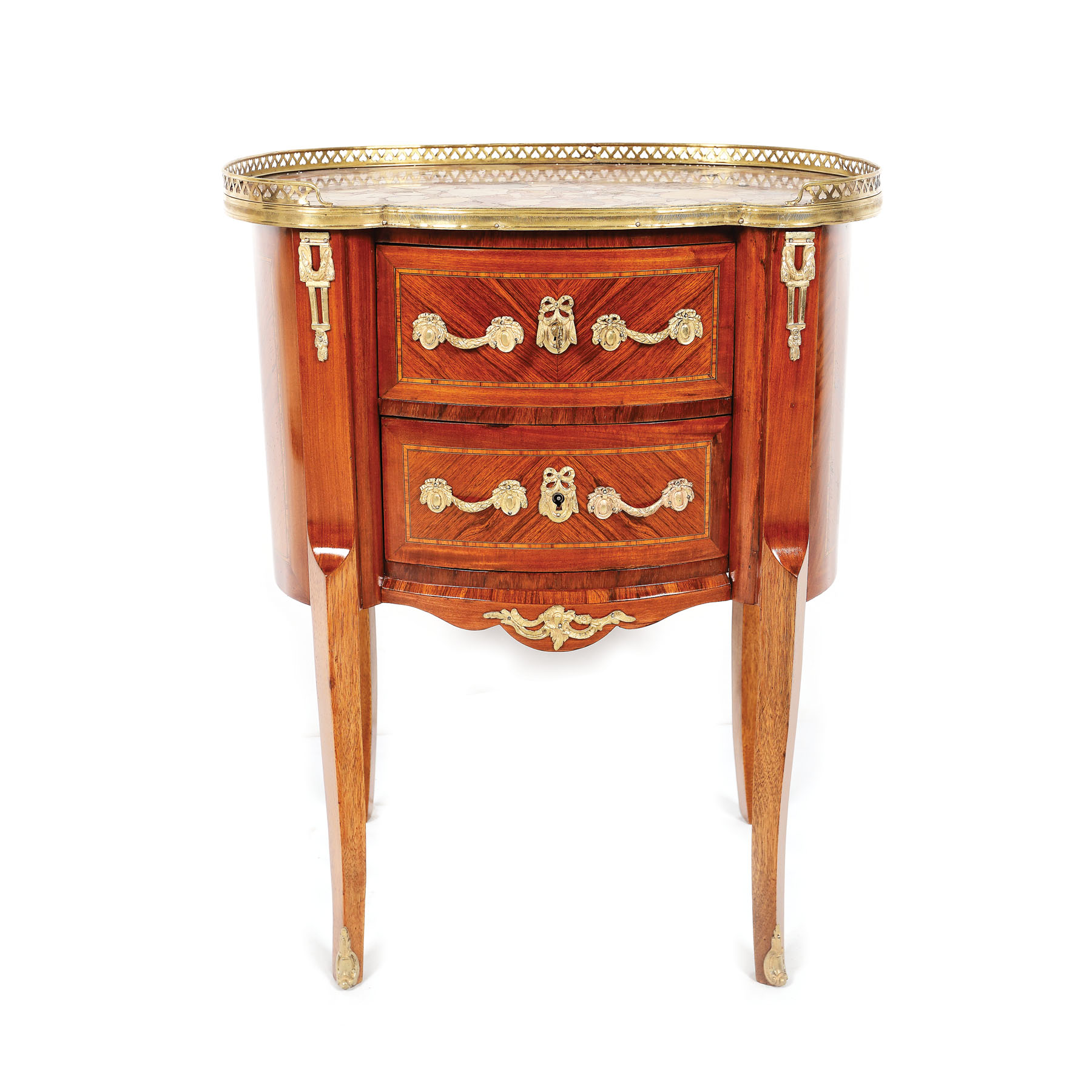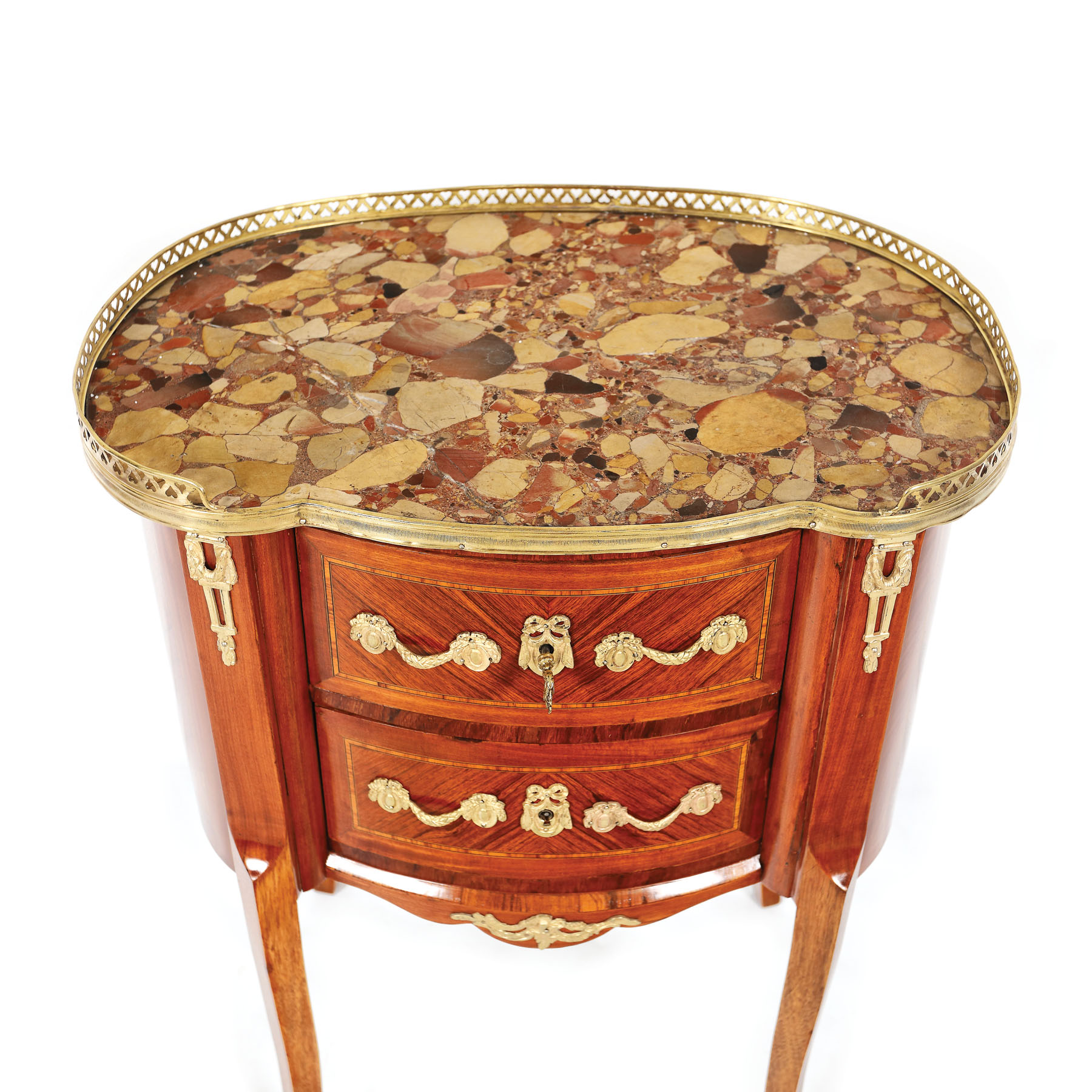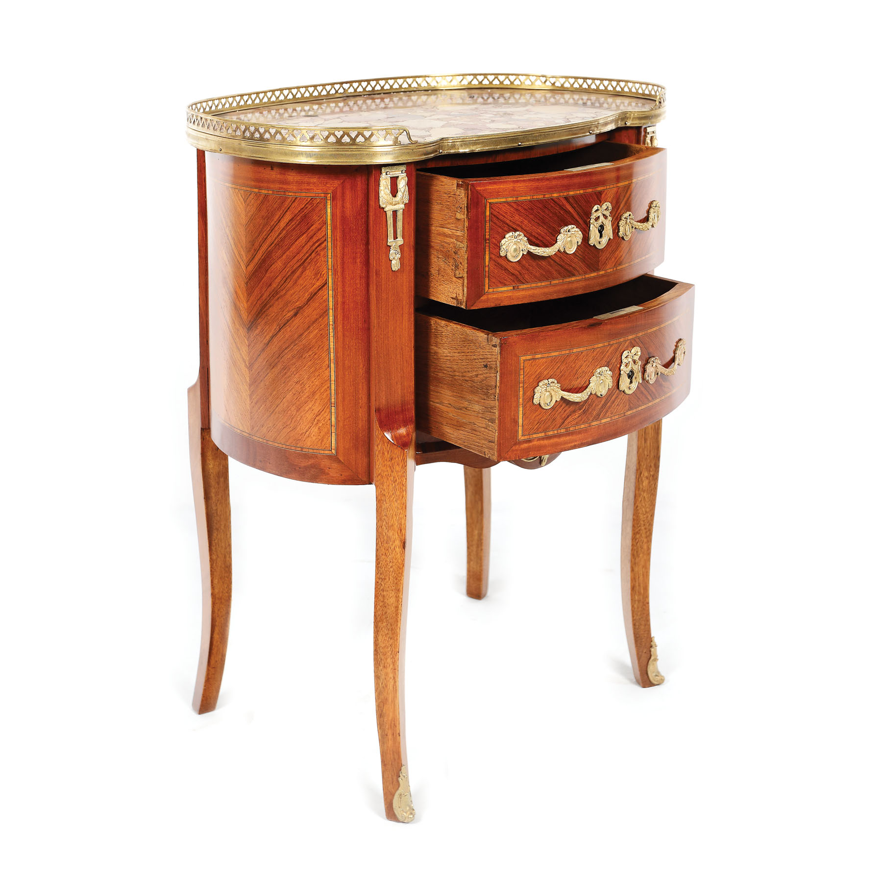 Comodă mică de formă consacrată, două sertare și căte două aplicații din bronz. Picioarele comodei sunt subțiri cu decor ruban și blatul din simili marmură în nuanțe de bejuri, cu ramă supraînălțată.