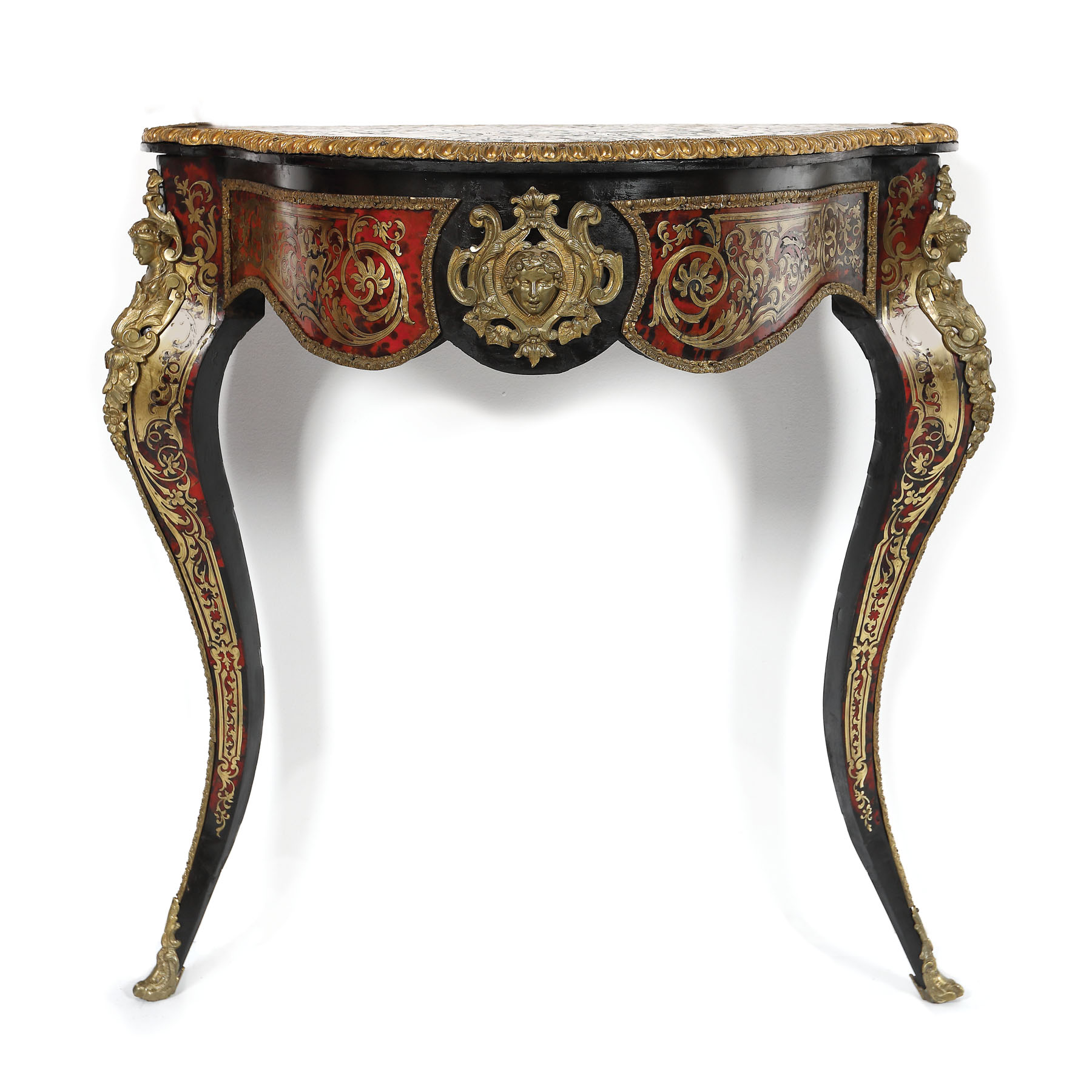 Masă consolă în stil Napoleon III, cu decor intarsiat tip Boulle, picioare galbate decorate cu espagnolettes, decor amplu pe picioare, centură și blat, cu motive vegetal-florale.