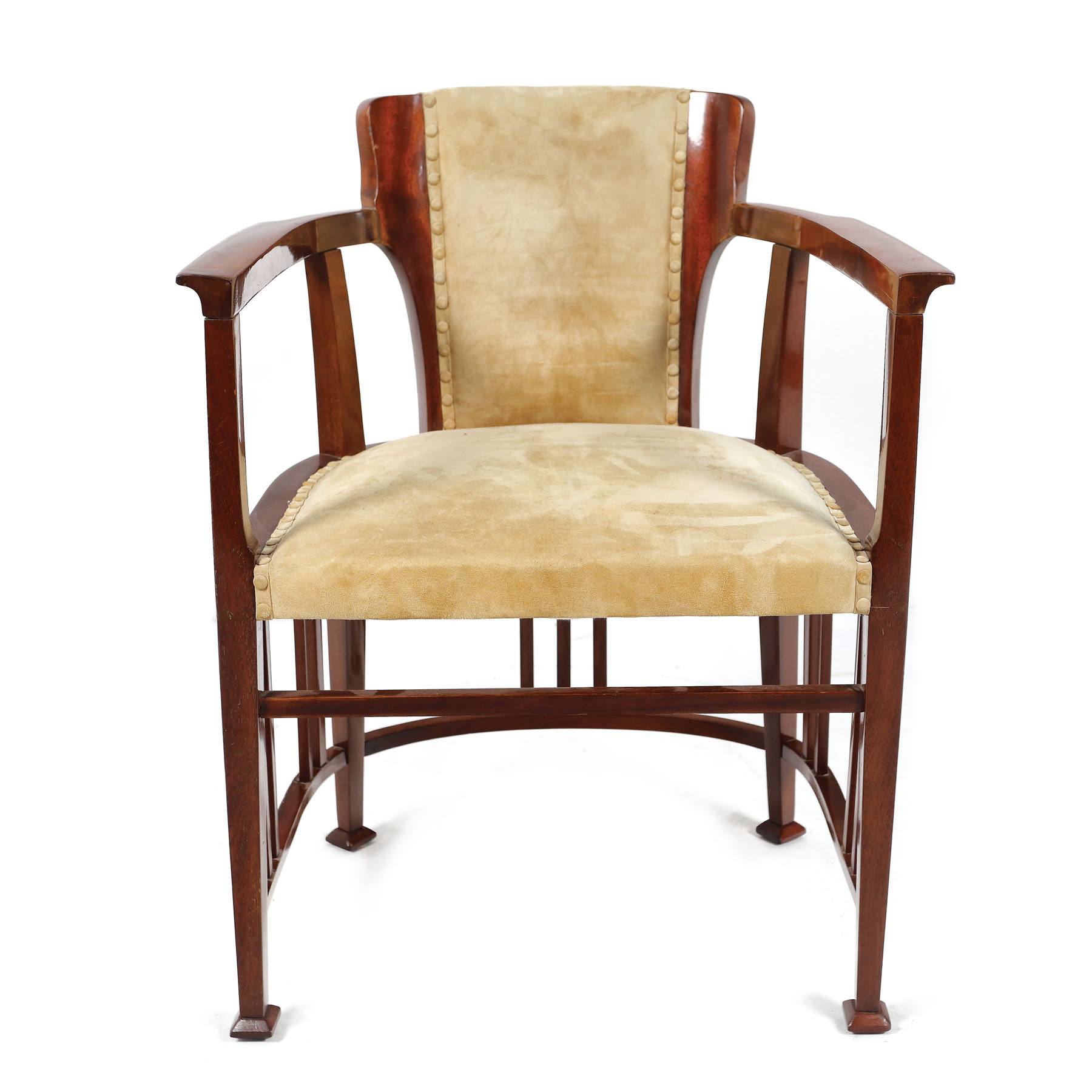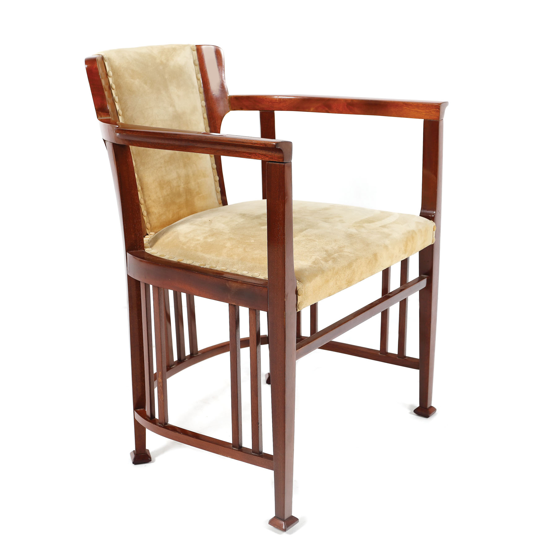 Fotoliu în stil Sezession, cu patru picioare unite prin grilaj circular, cu spătar panou plin, cotiere brațe deschise. Furnir din lemn de cireș, tapițerie din catifea crème.