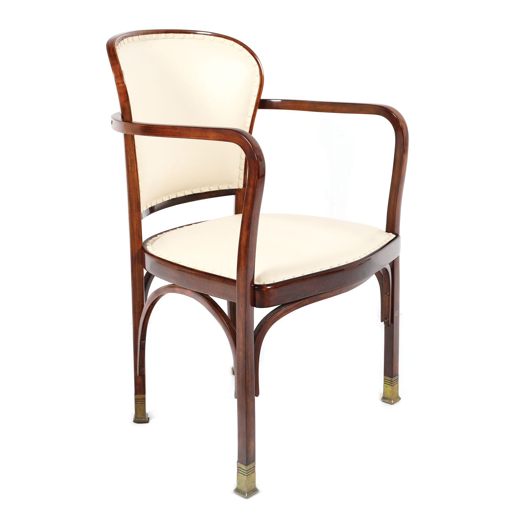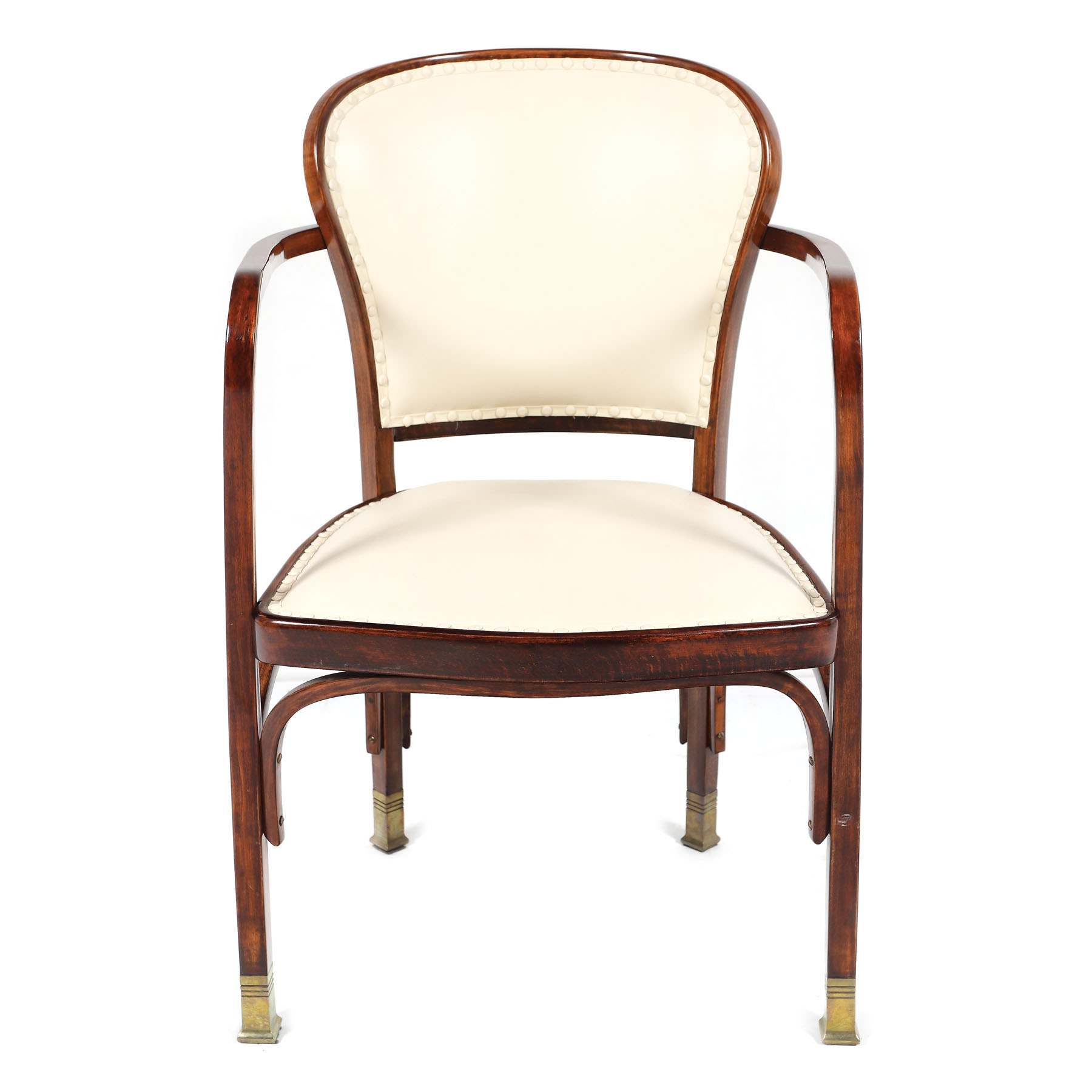 Fotoliu cu brațe deschise, cotiere, cu picioare unite prin traverse curbate, cu șezut și spătar tapițate cu piele crème.
